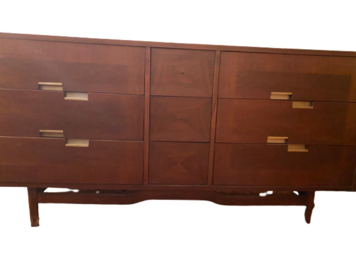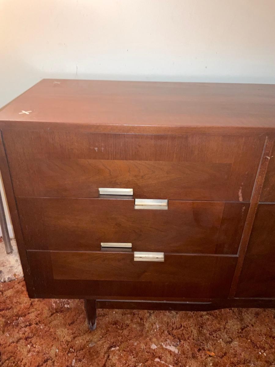 Wonderful mid century modern credenza / low boy dresser. Three long drawers on either side with modern aluminum offset pulls, Three center drawers, no knobs., apparently original were just small balls, easily replaced. Each corner have fabulous inset X. Nice condition for age. Height 30", Width 62", and depth 19"