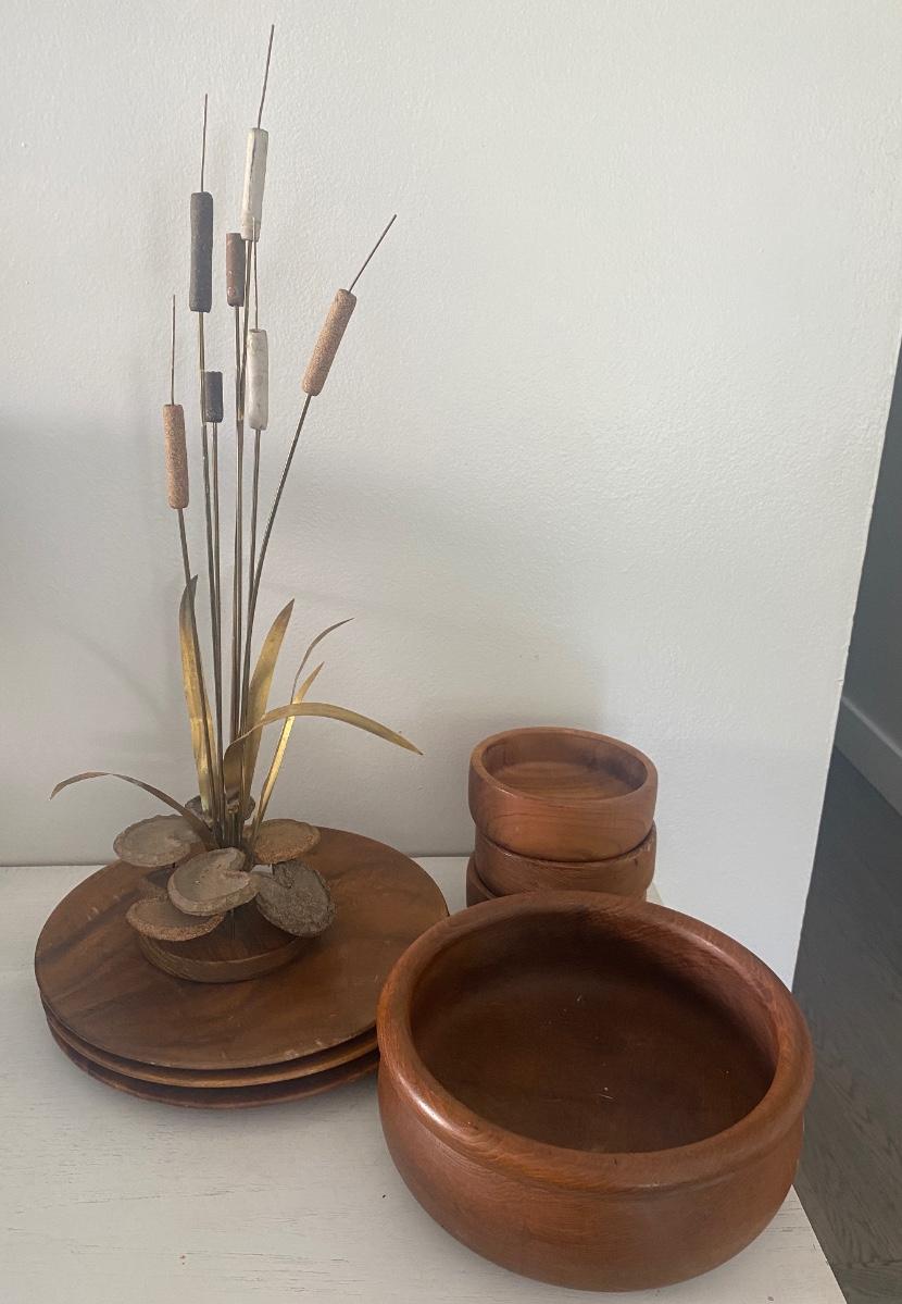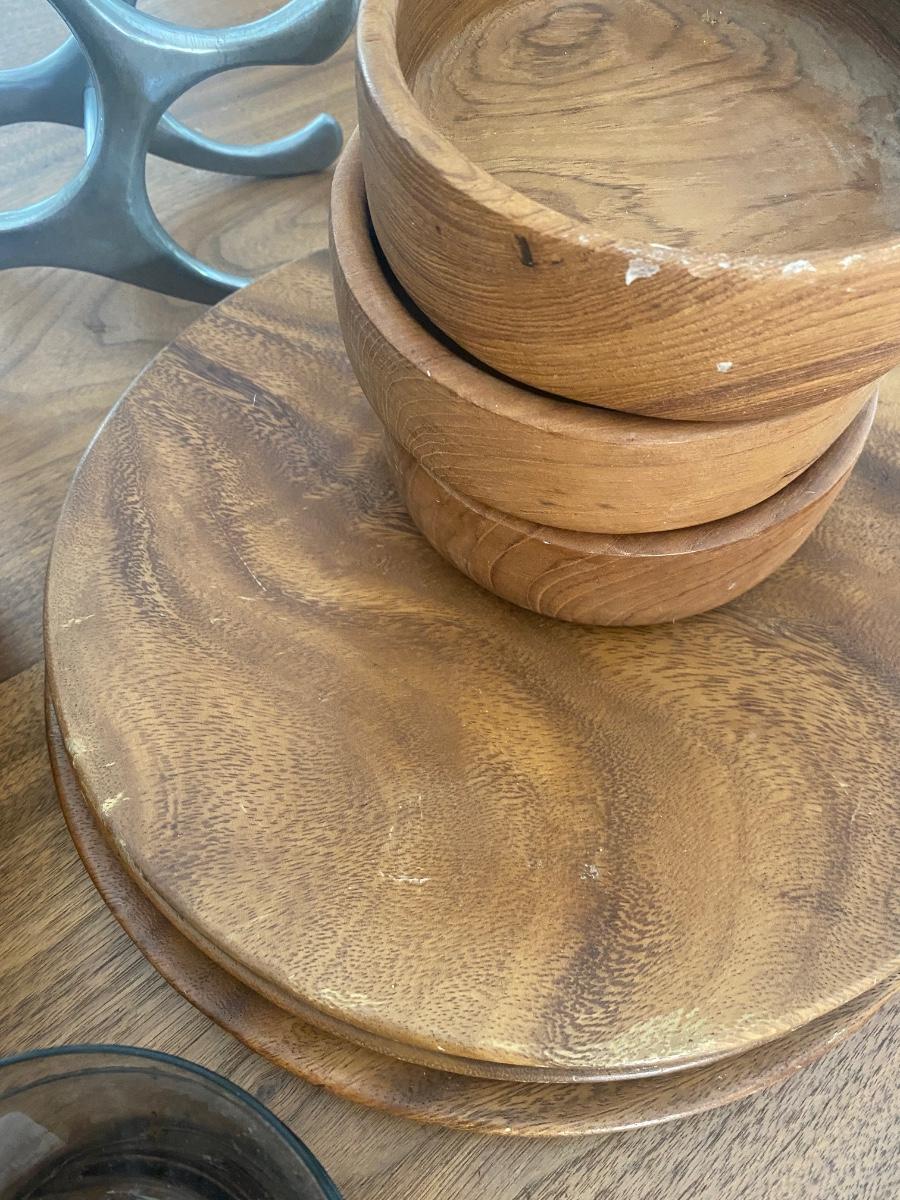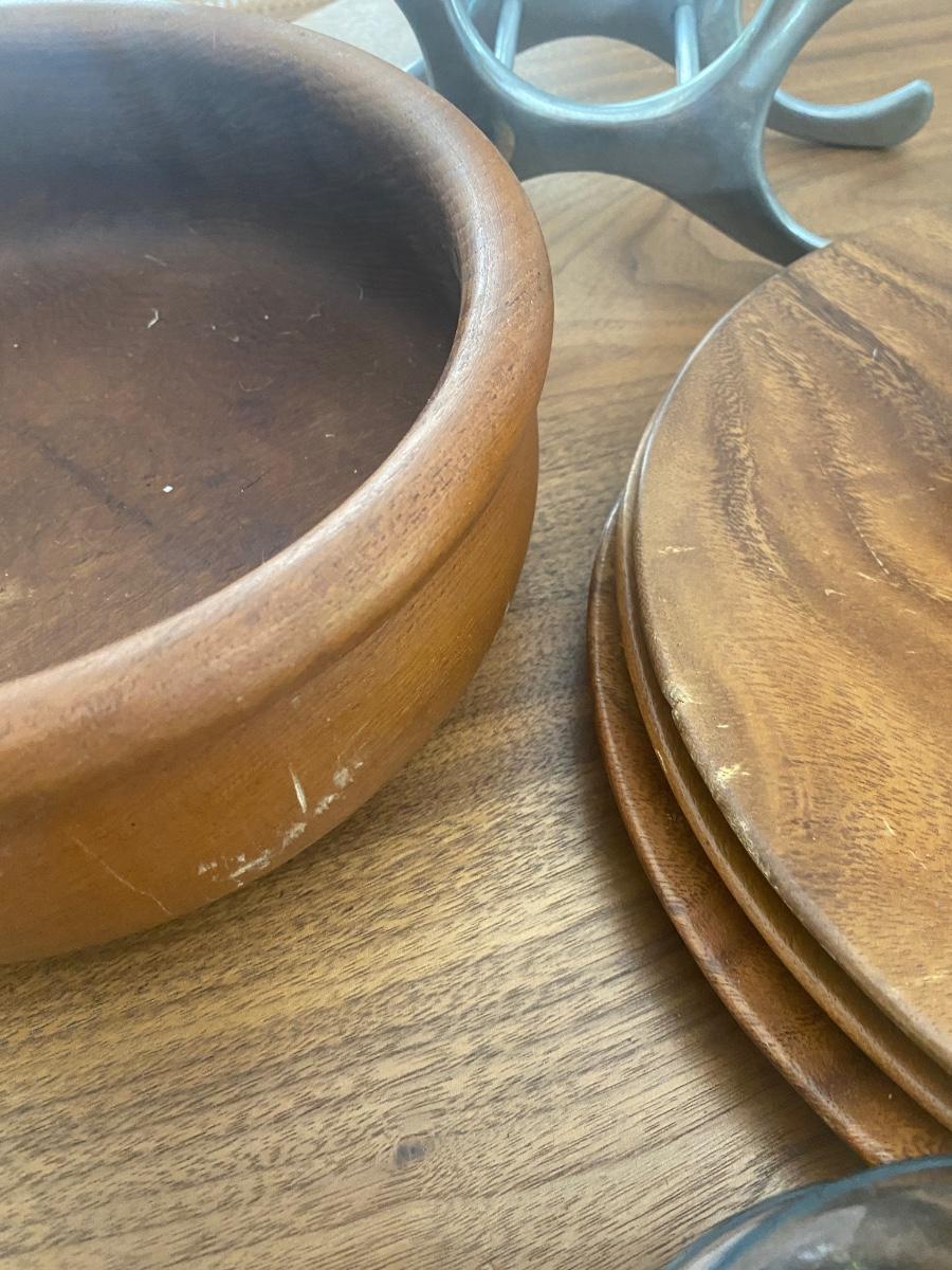 Lot also includes wooden salad bowl, plates and small bowls. Wooden items have some wear. (3) plates 11”, salad bowl 10” x “4.