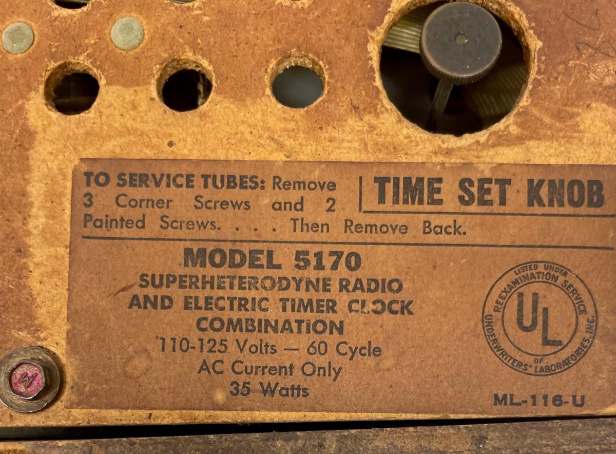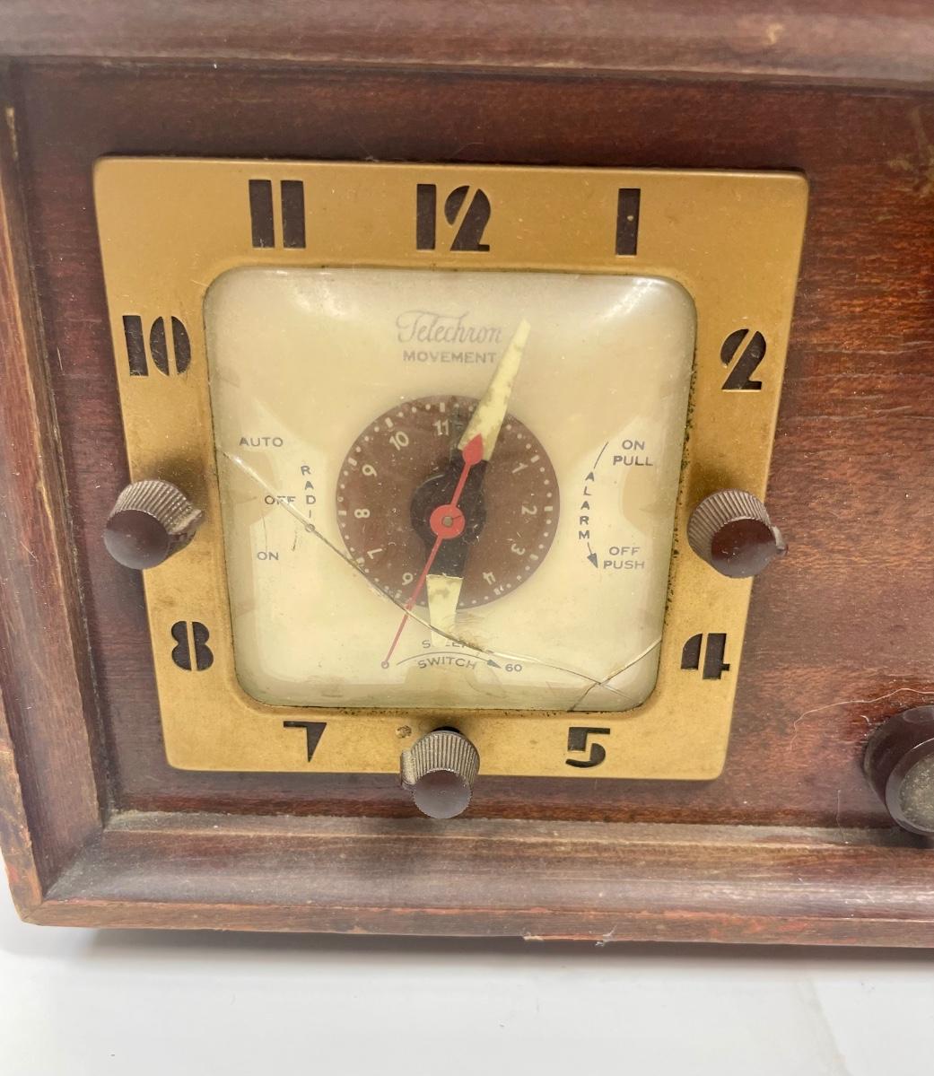 From 1952. Crack across clock dust cover. Clock runs, AM radio comes on and receives a station. Volume knob works. Some wear on the varnish finish on the cabinet. Cord is secured by black electrical tape, but works.