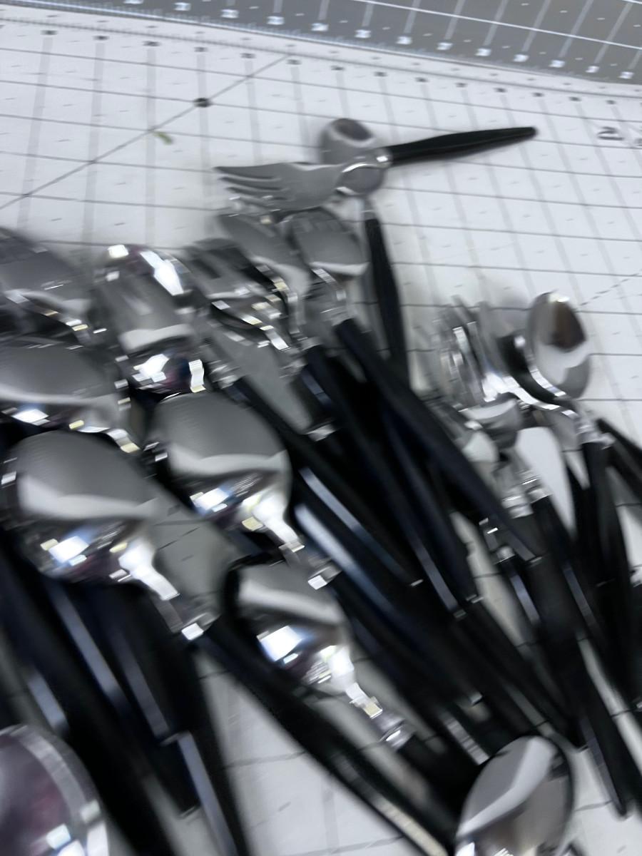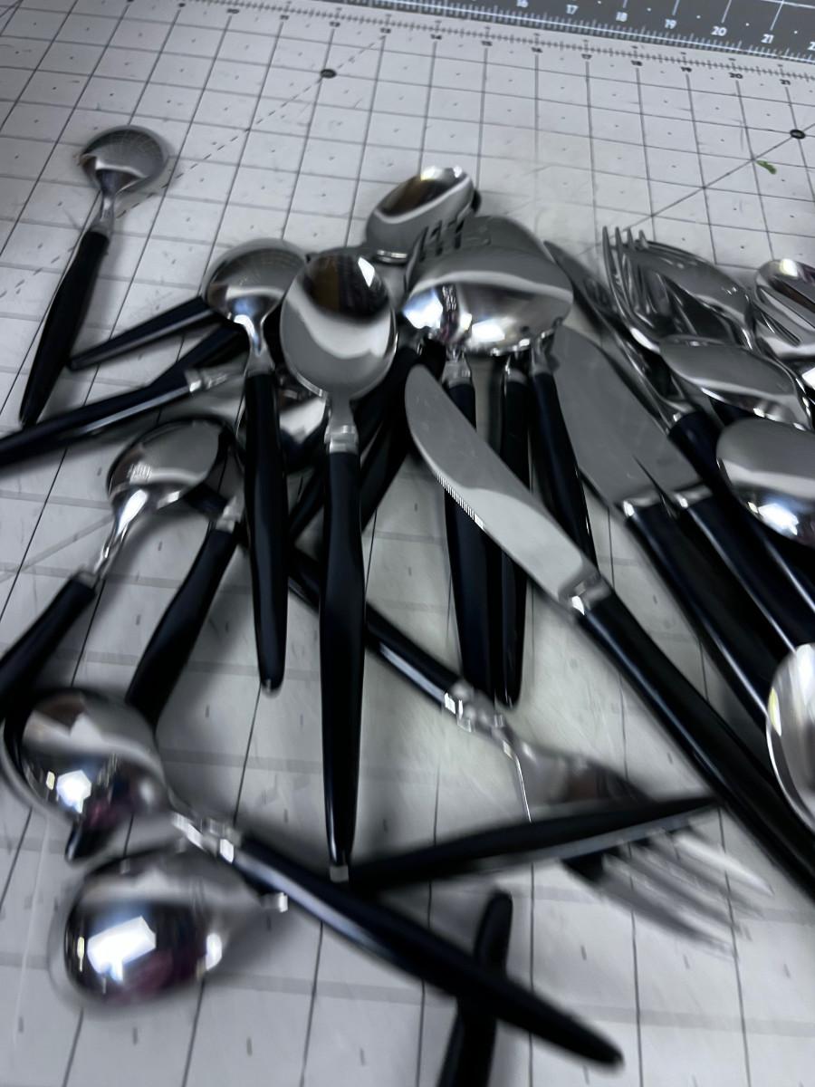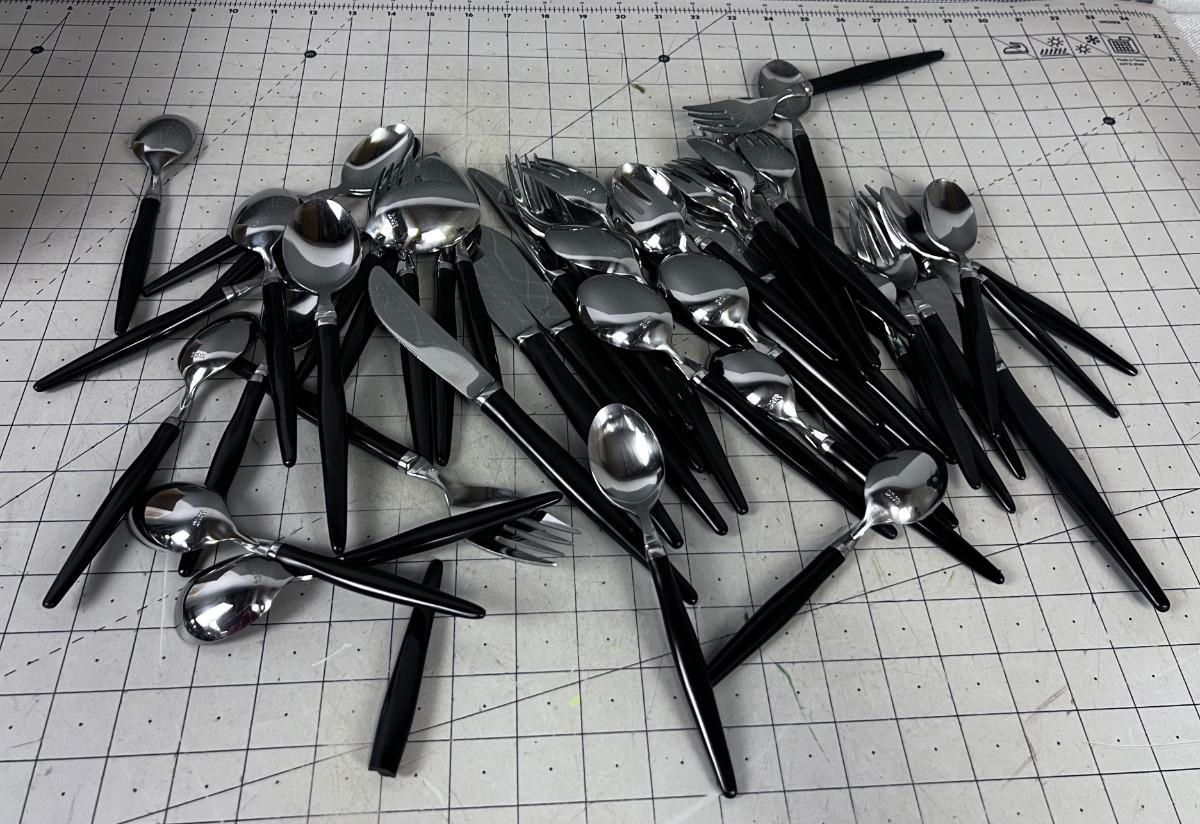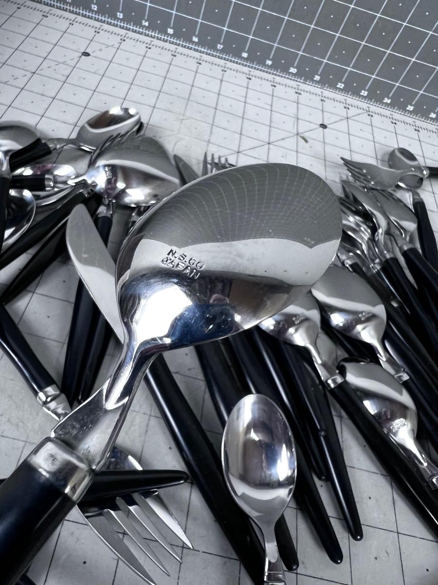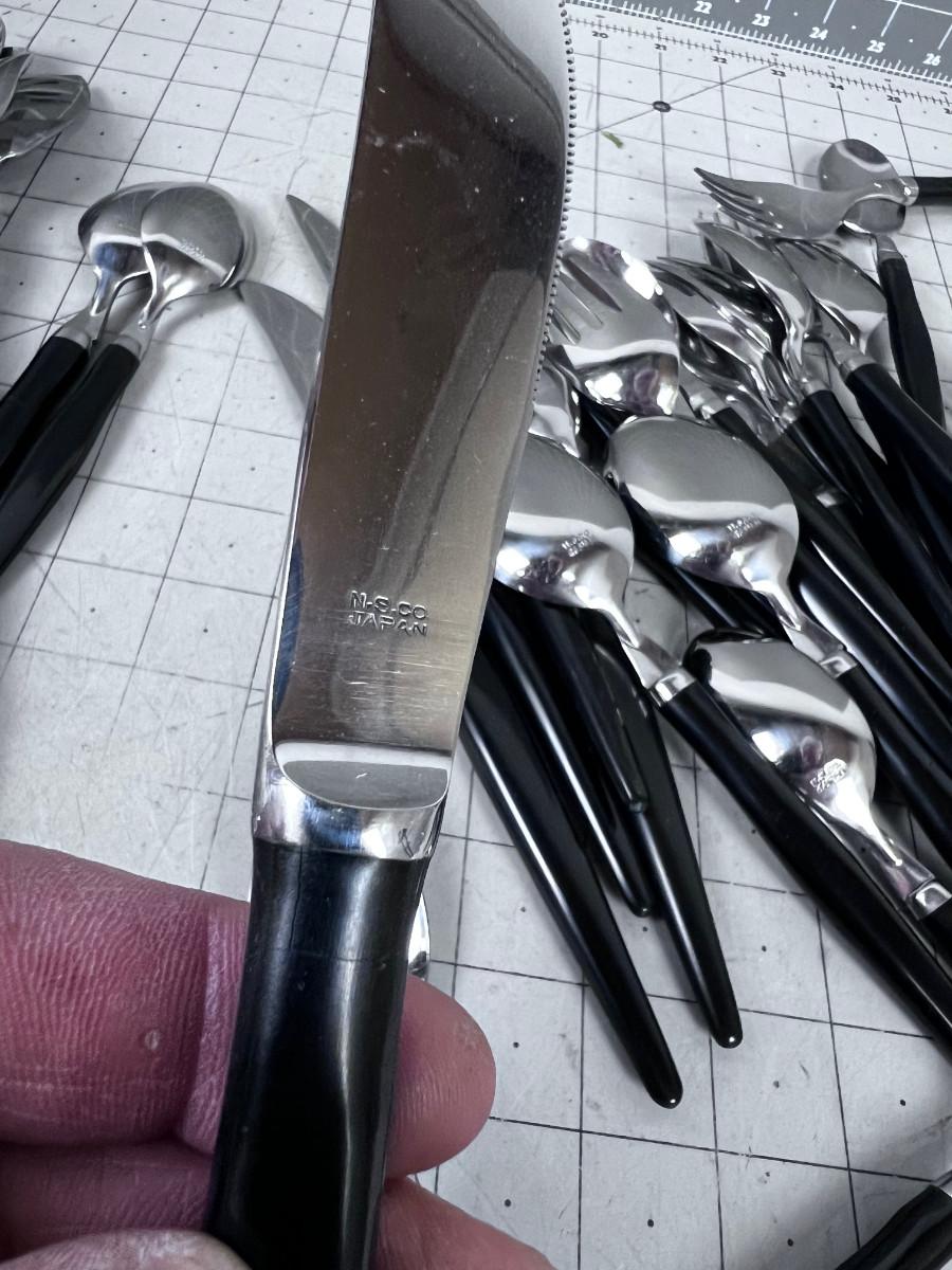 With the slightest use here is a vintage Stainless Steel flatware service for eight(8) less one Salad Fork..48 pieces...16x Teaspoons 6 5/8"..8x Soup Spoons 7 3/4"..8x Forks 8"..7x Salad Forks 6 7/8"..8x Table Knives(serrated) 9"..1x Master Butter Knife 7"...Black acrylic handles...Mid Century Modern design..Made in Japan for the National Silver Co.(N.S.CO.).