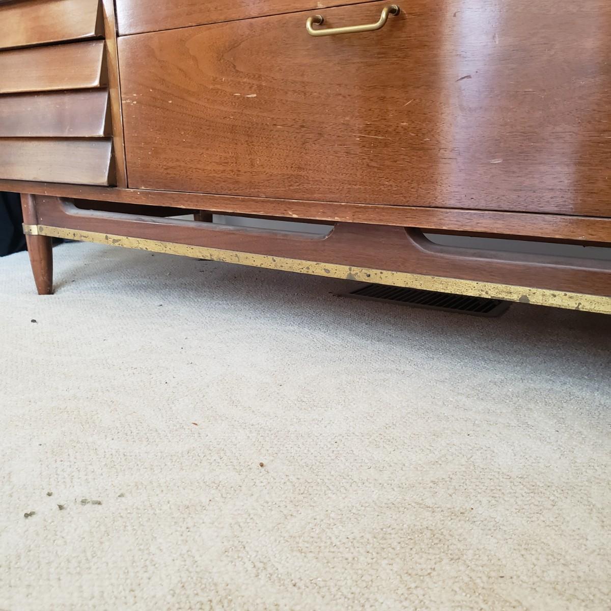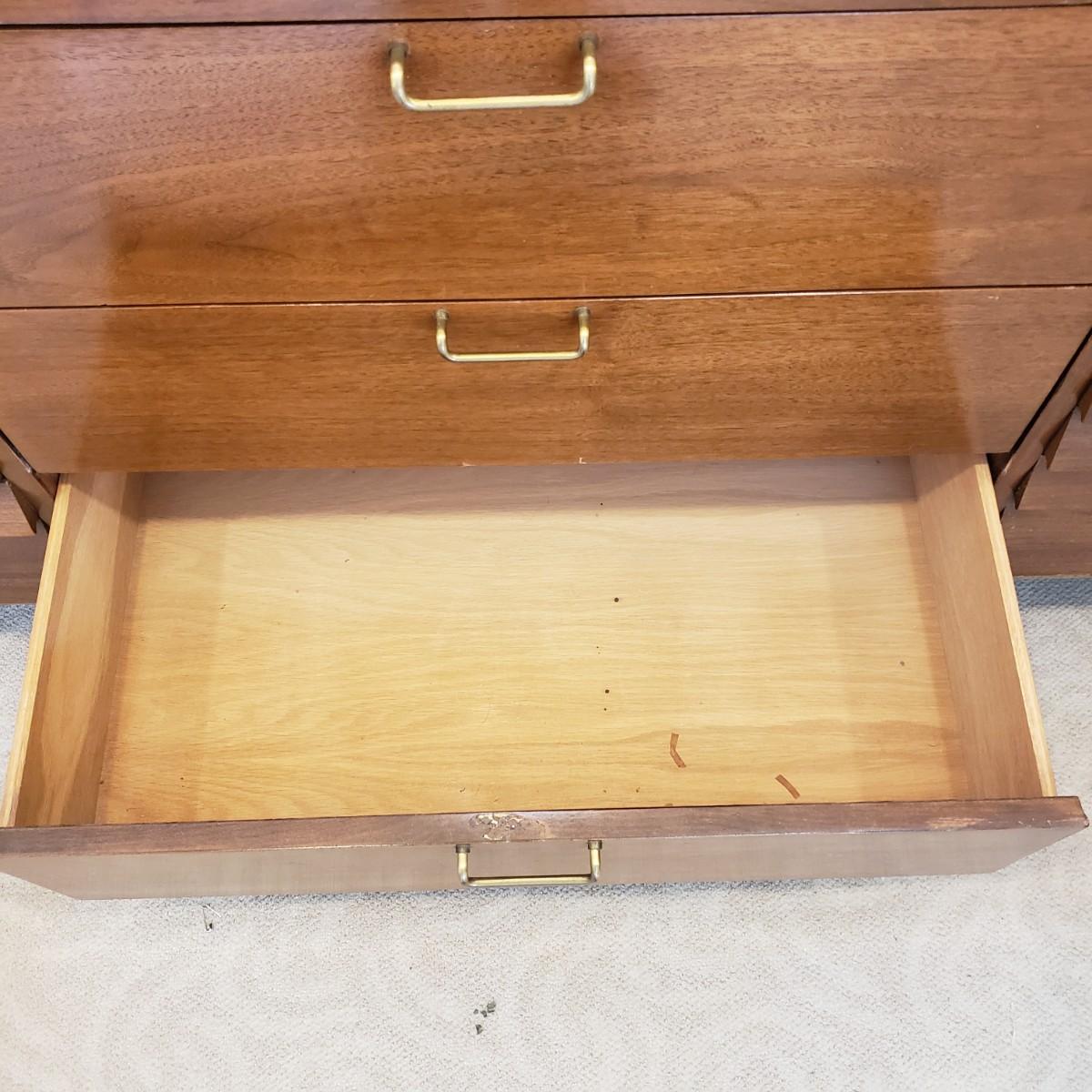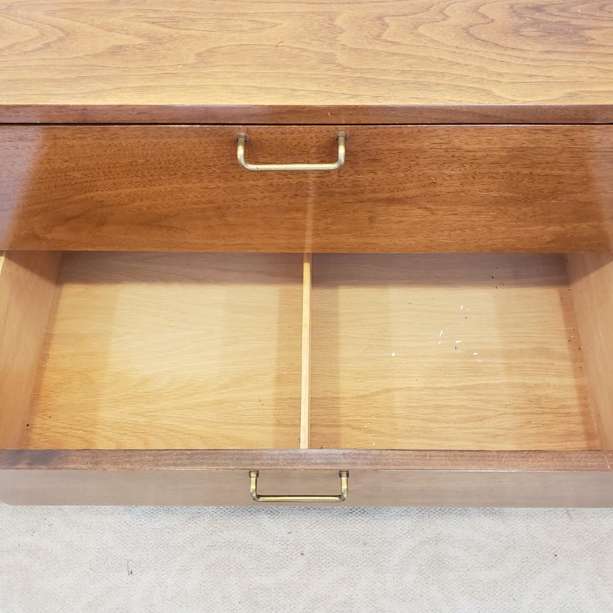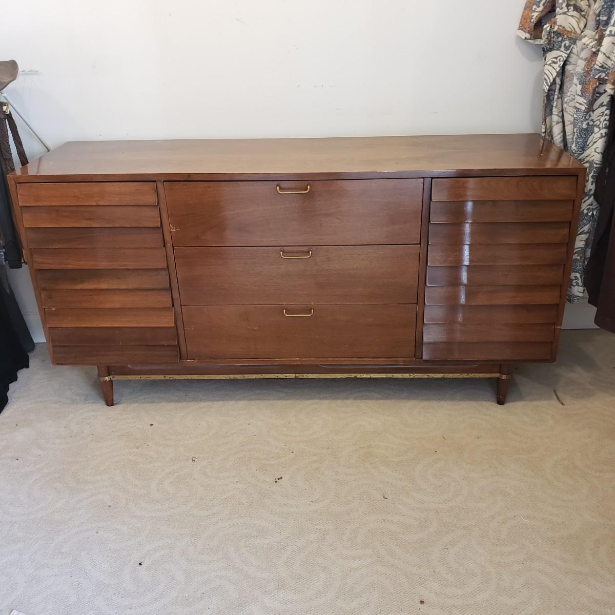 This MCM long dresser has nine drawers. The vented looking side drawers measure 16" x 9". The middle drawers with brass handles (29" x 8")have two drawers with a divider and the bottom one is full length. The dresser measures 65" x 18.5" x 32" H. There are some blemishes on the finish, see pictures for details.