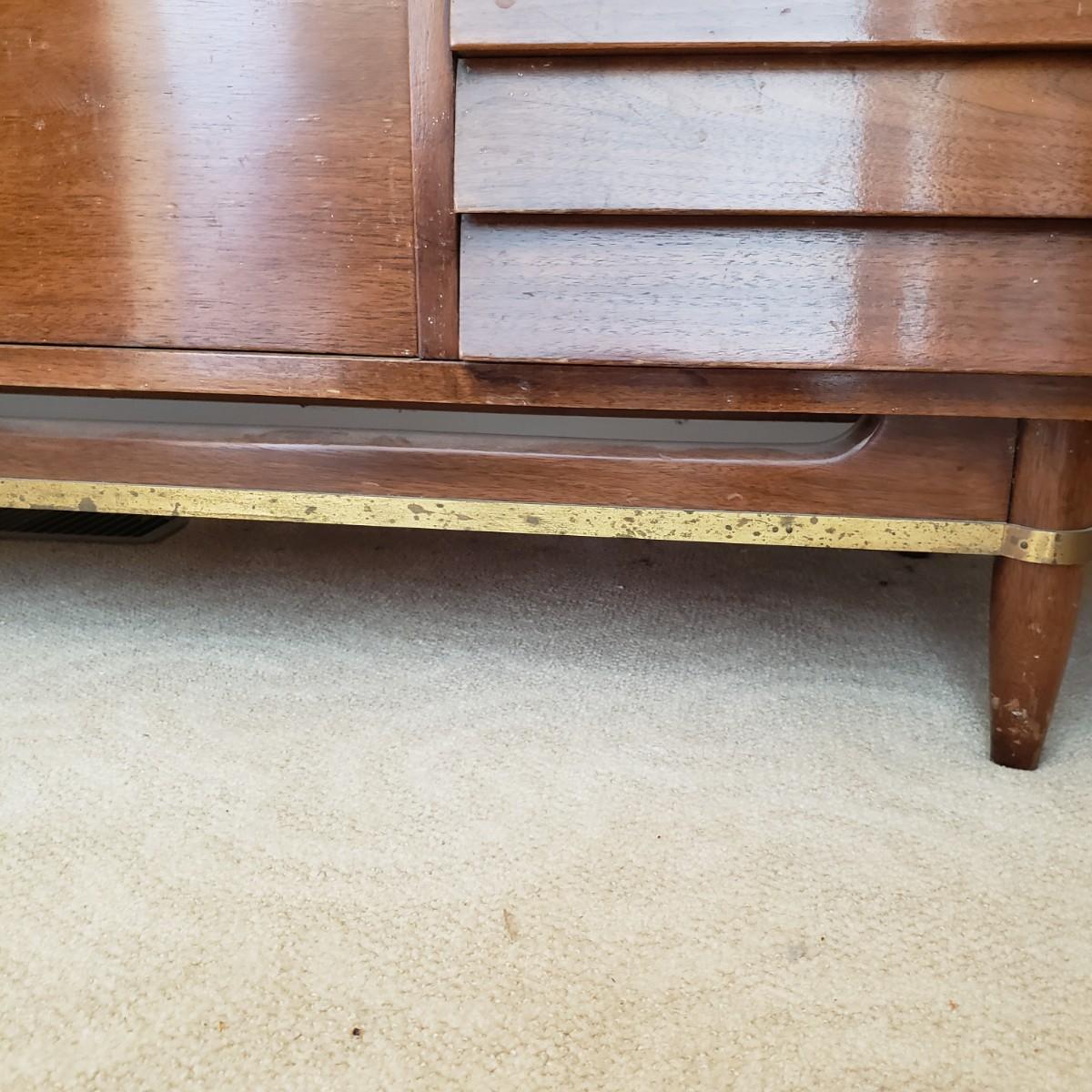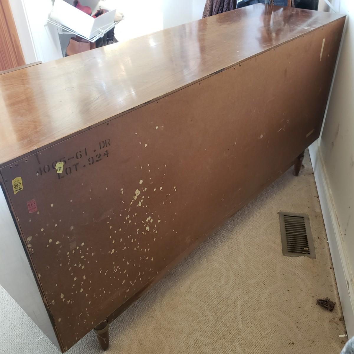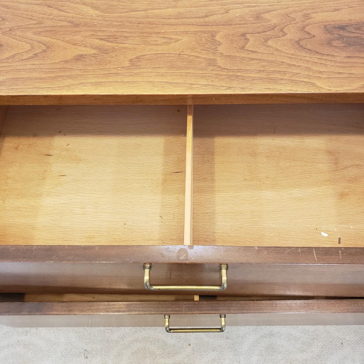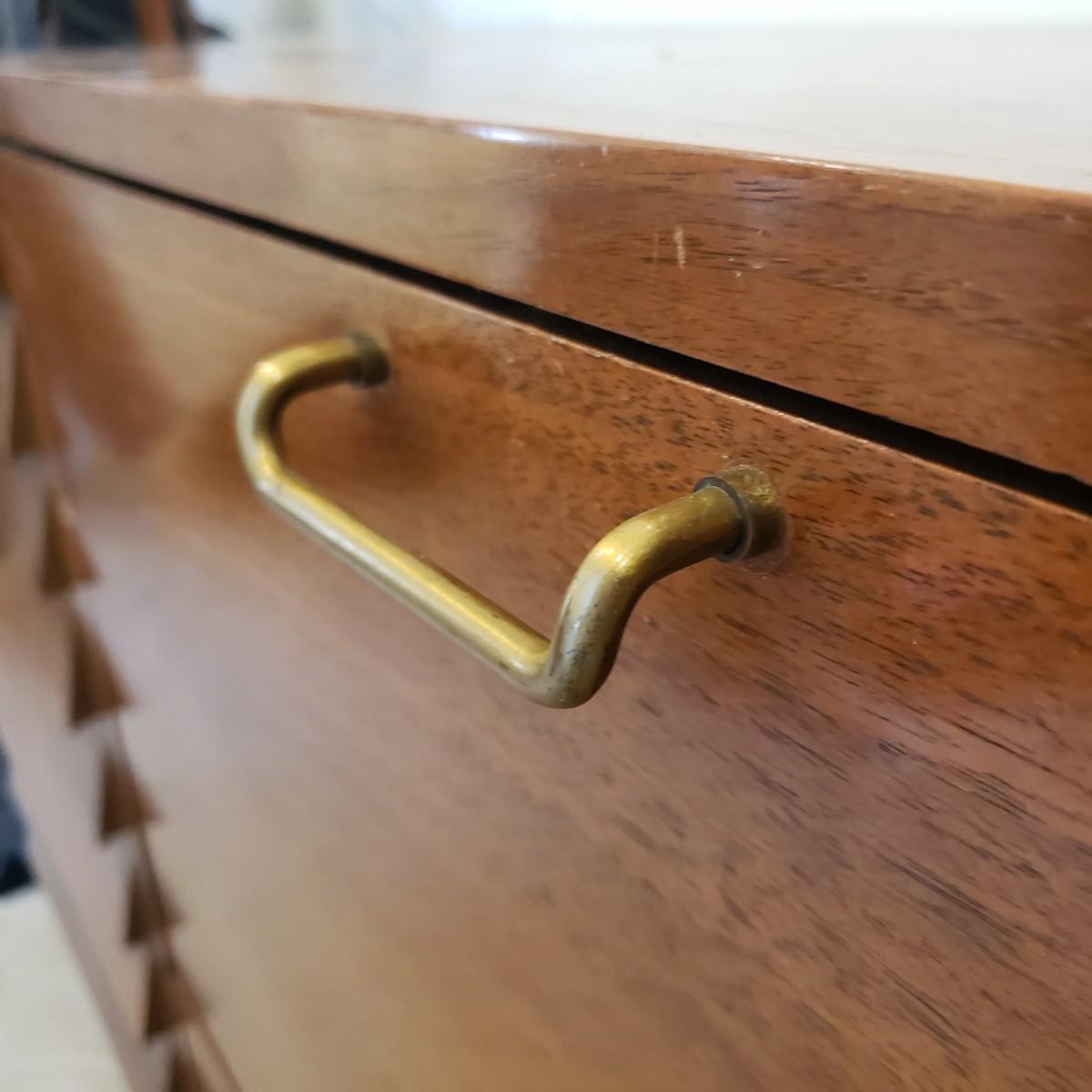 This MCM long dresser has nine drawers. The vented looking side drawers measure 16" x 9". The middle drawers with brass handles (29" x 8")have two drawers with a divider and the bottom one is full length. The dresser measures 65" x 18.5" x 32" H. There are some blemishes on the finish, see pictures for details.