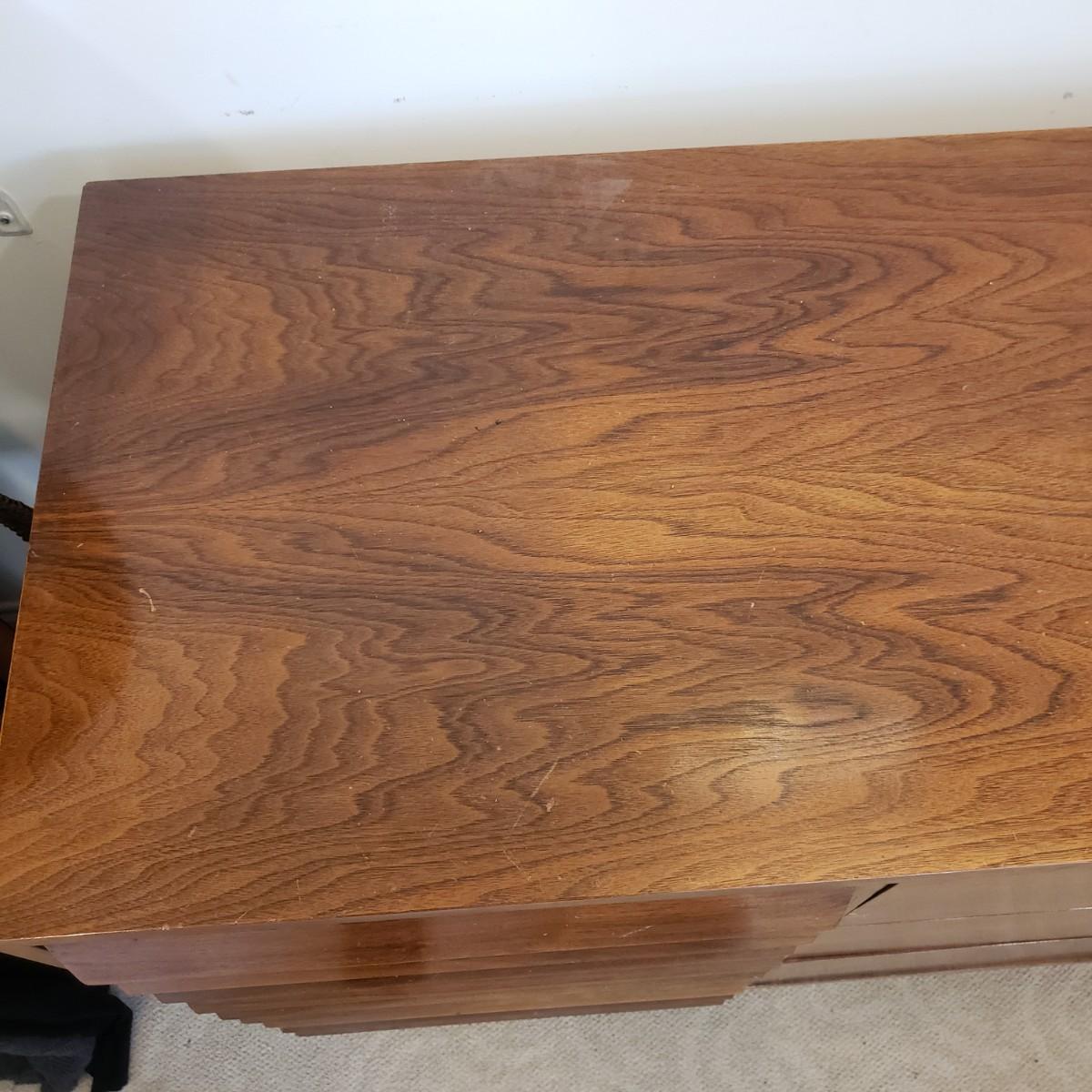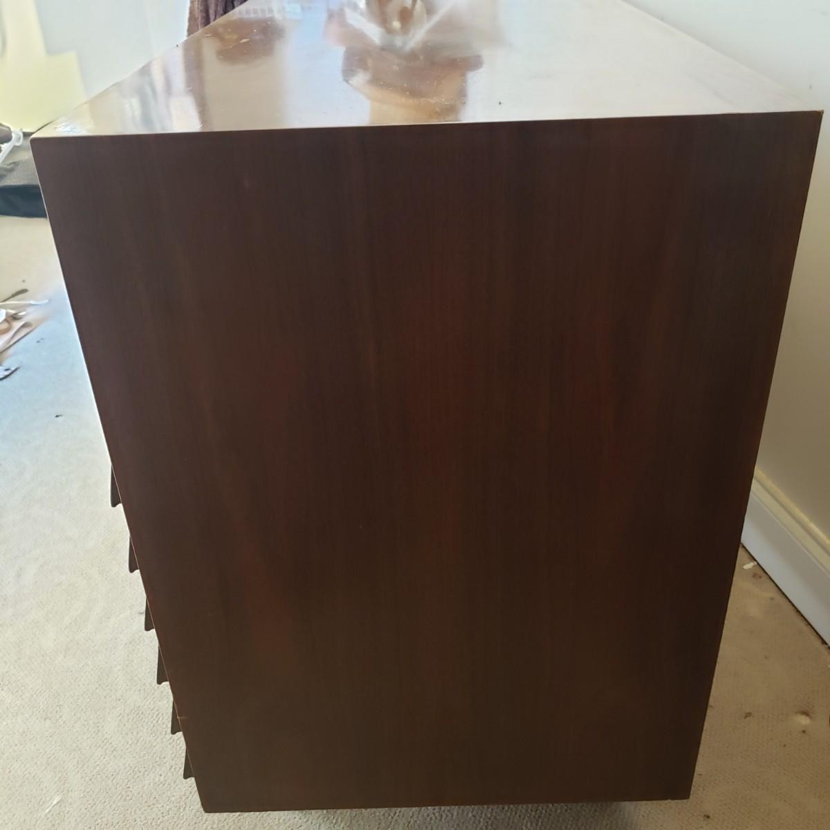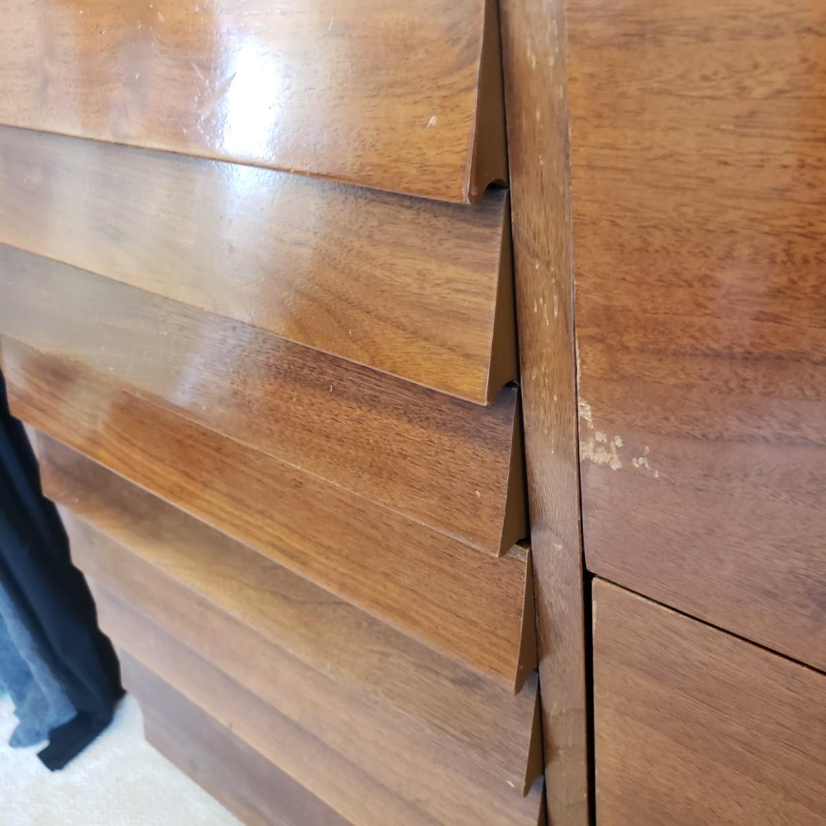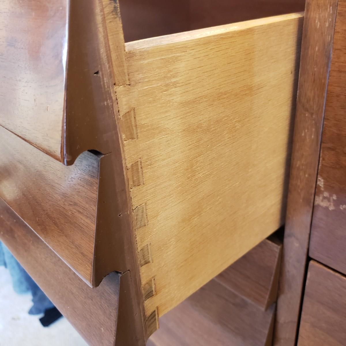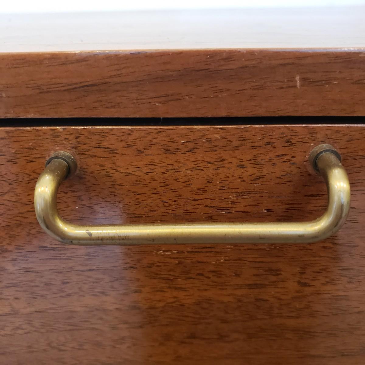 This MCM long dresser has nine drawers. The vented looking side drawers measure 16" x 9". The middle drawers with brass handles (29" x 8")have two drawers with a divider and the bottom one is full length. The dresser measures 65" x 18.5" x 32" H. There are some blemishes on the finish, see pictures for details.