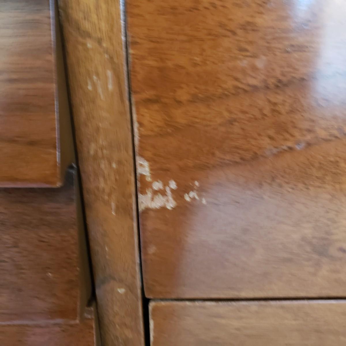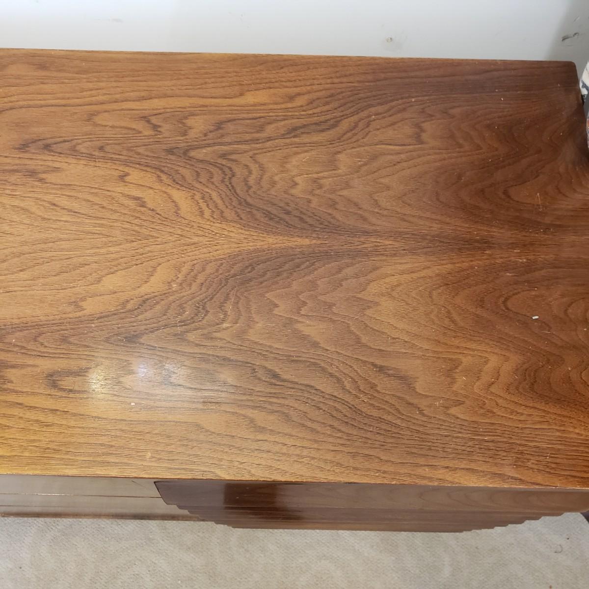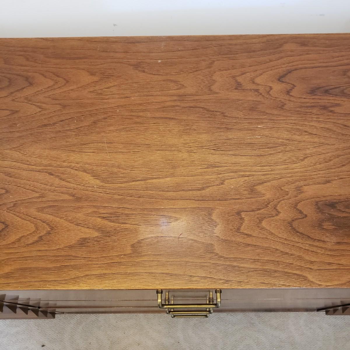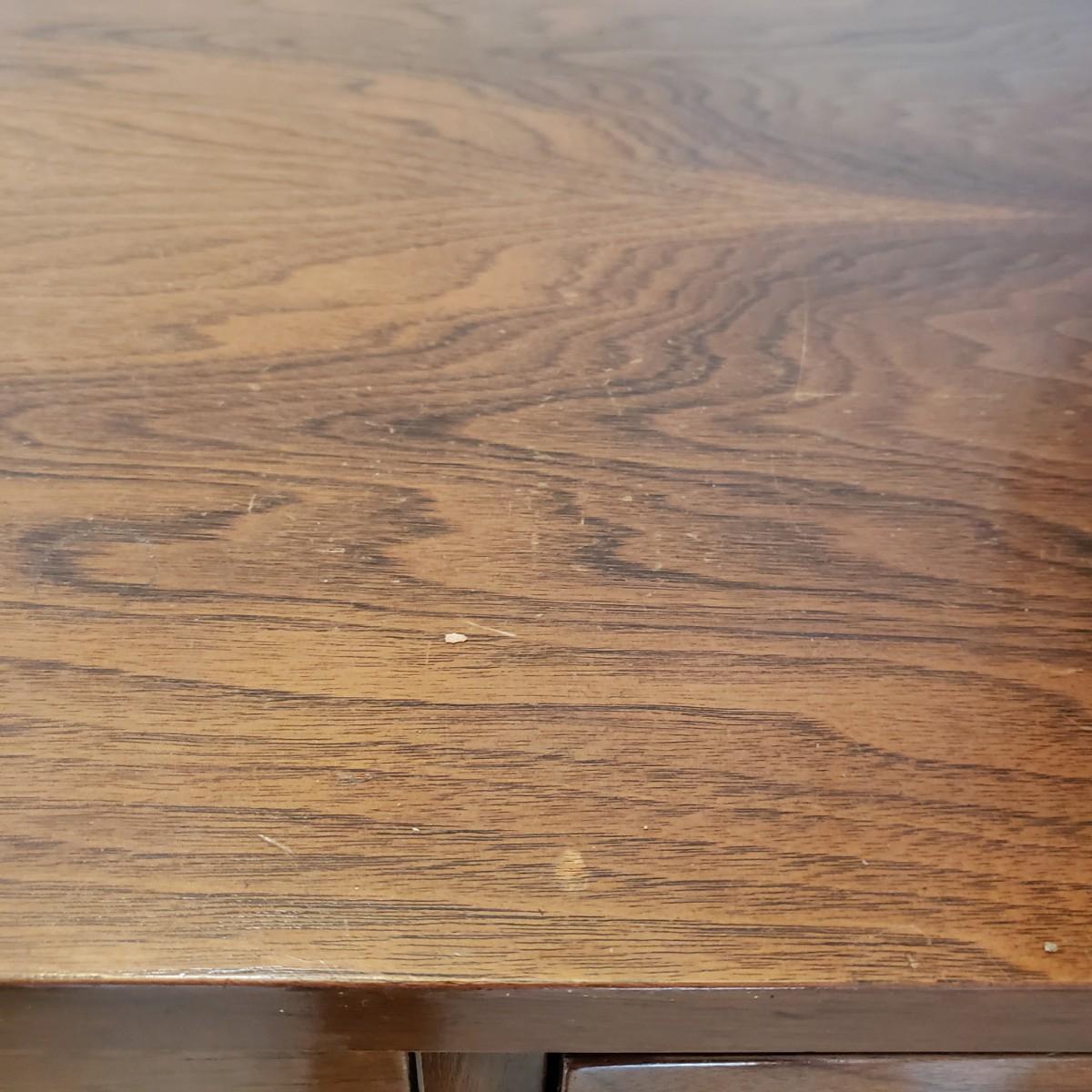 This MCM long dresser has nine drawers. The vented looking side drawers measure 16" x 9". The middle drawers with brass handles (29" x 8")have two drawers with a divider and the bottom one is full length. The dresser measures 65" x 18.5" x 32" H. There are some blemishes on the finish, see pictures for details.
