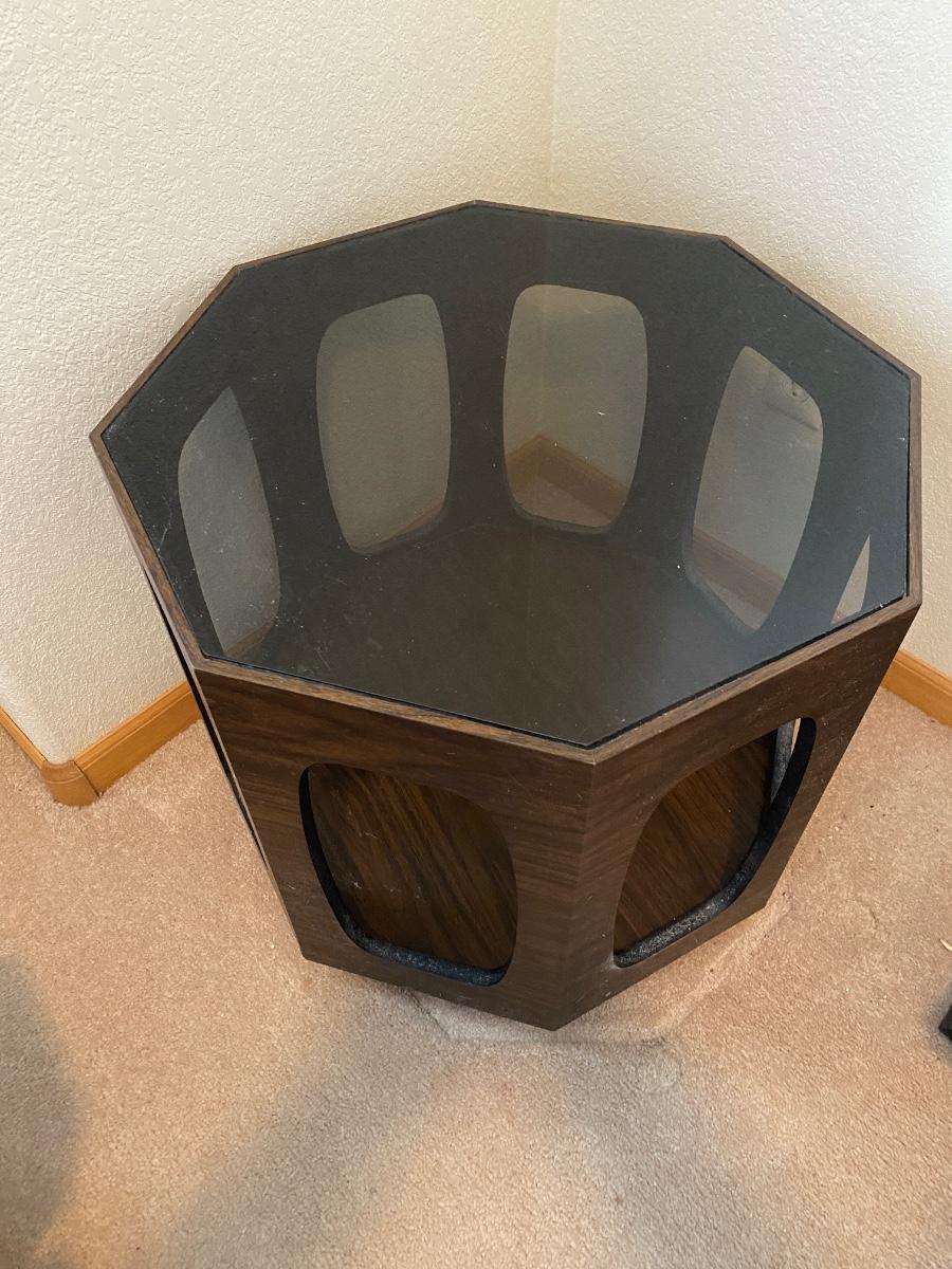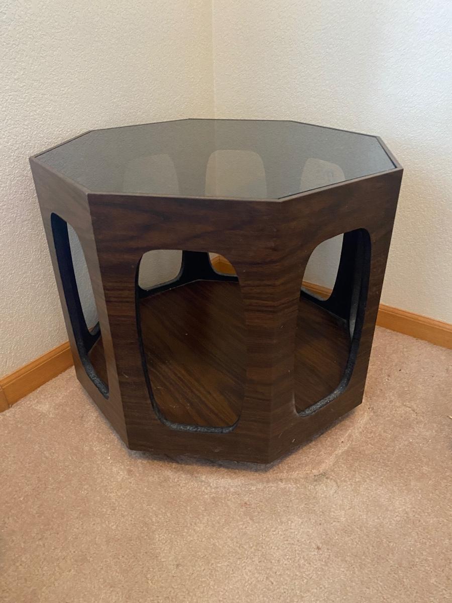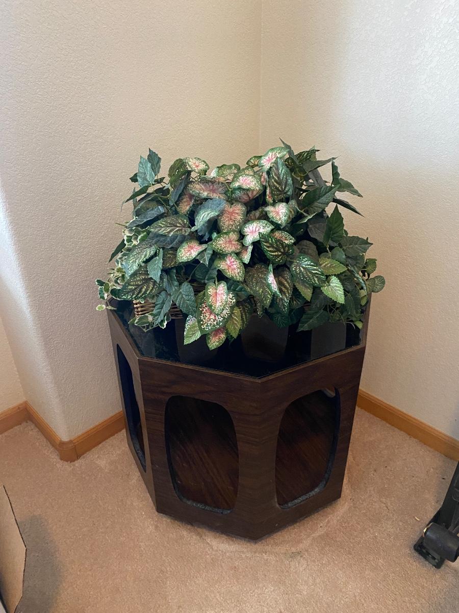 MID-CENTURY OCTAGON END TABLE & FAUX FOLIAGE