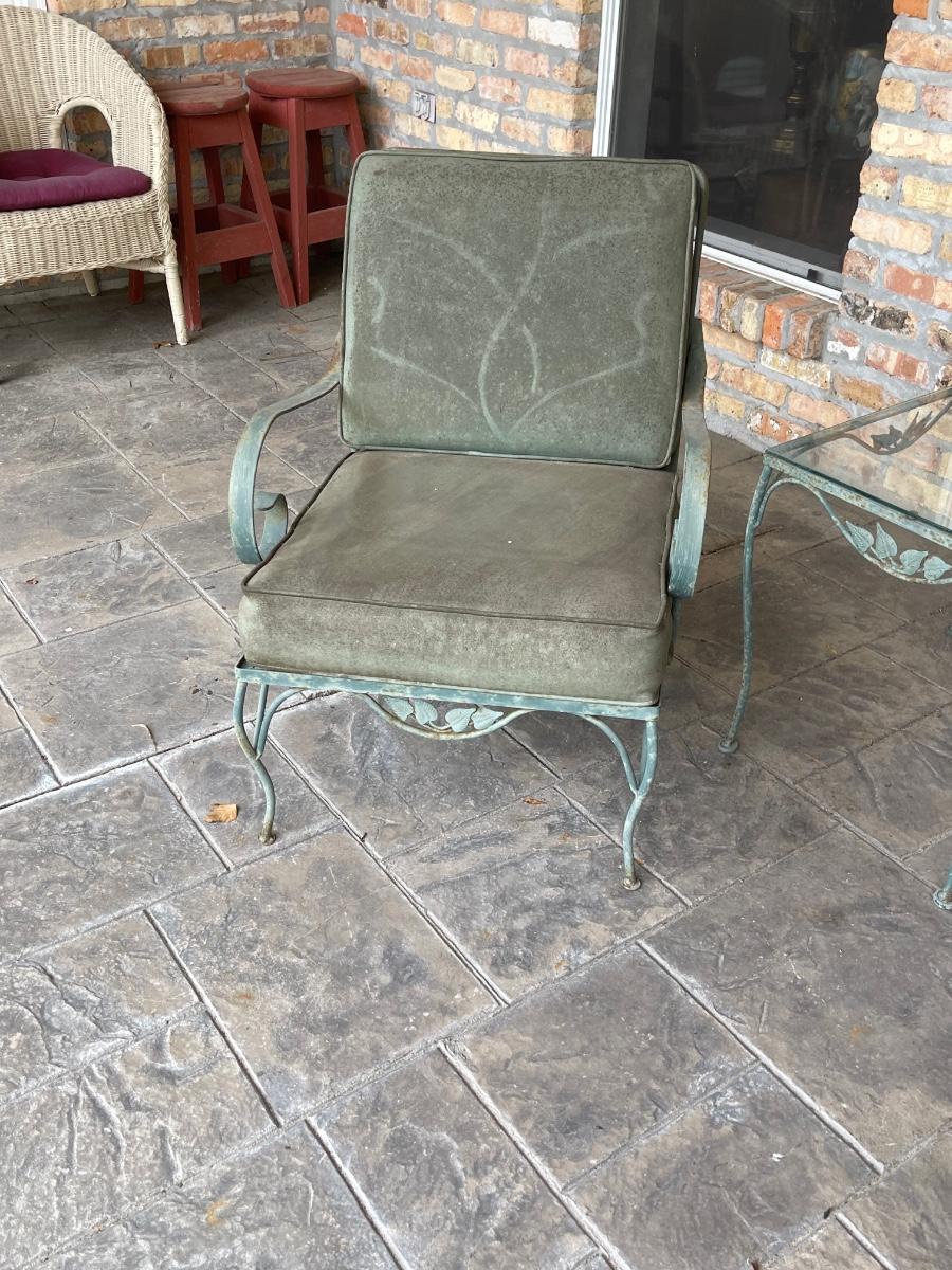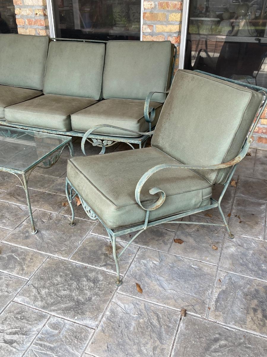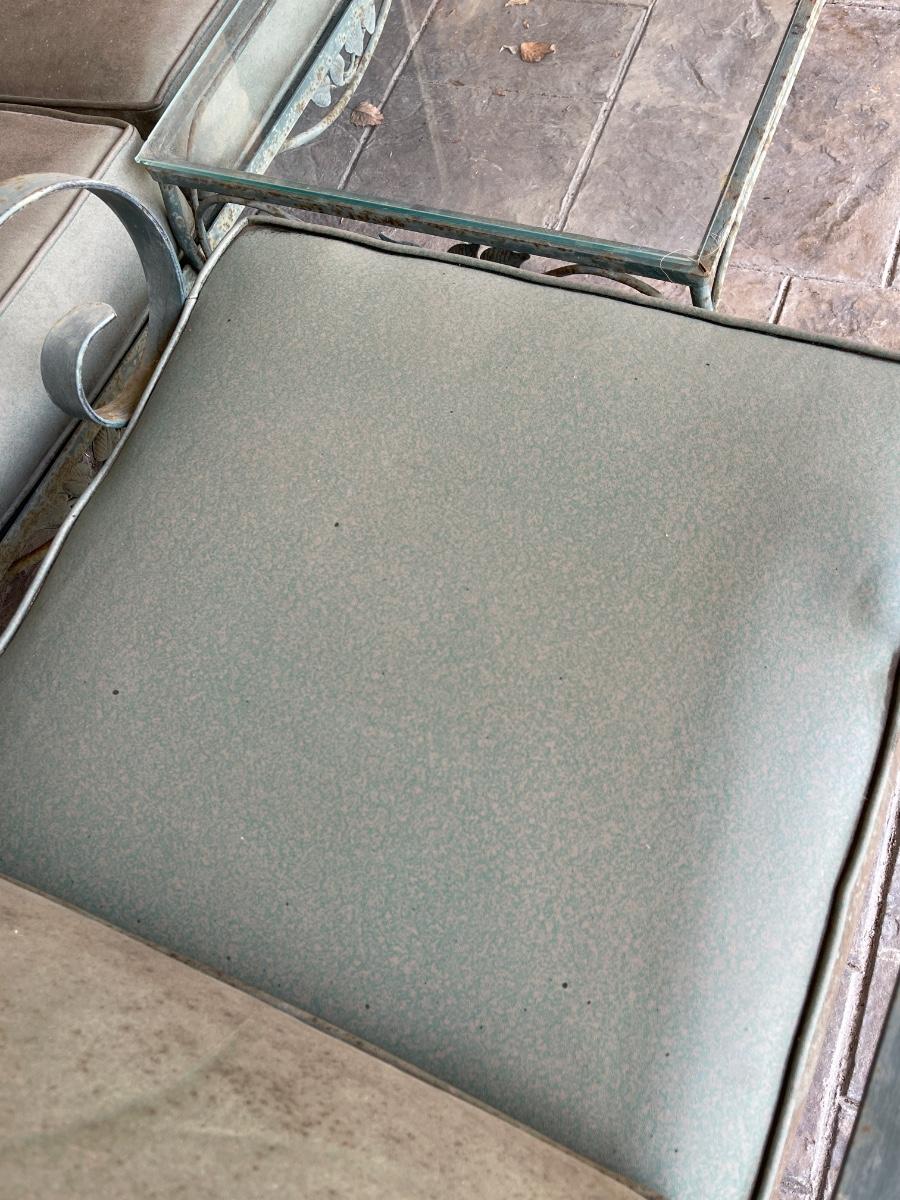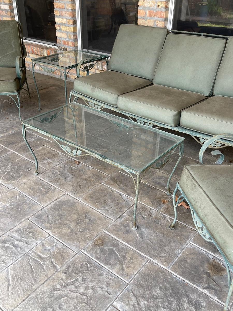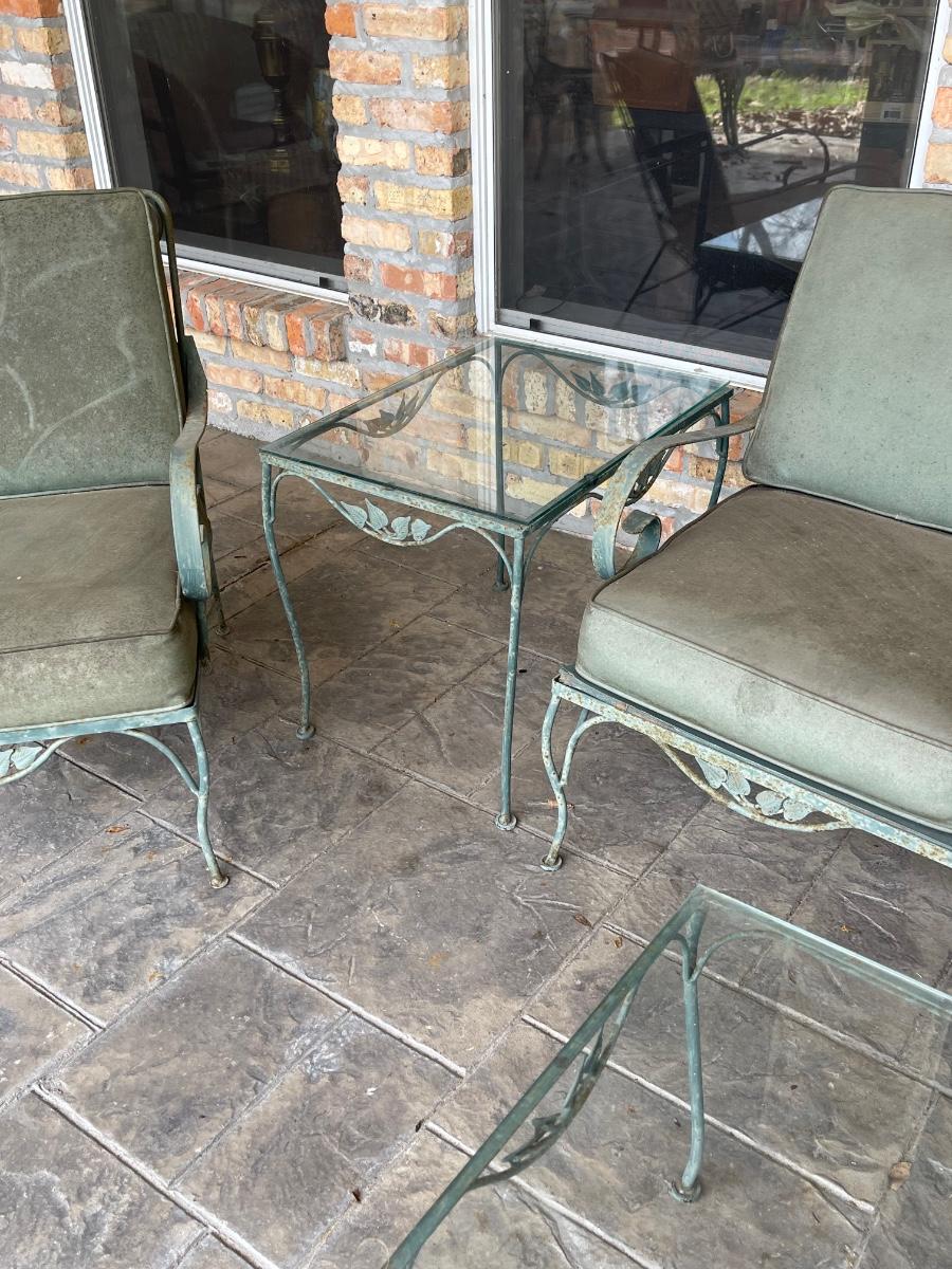 Porch Kept ~ Set really needs to be cleaned ~ no rips in the vinyl cushions, however, there is some fading on cushions ~ Surface rust on metal ~ 3 seater measures 31” H x 65” W x 34” D ~ Pair of matching chairs measure 31” H x 23.5” W x 32” D ~ glass top coffee table is 16” H x 36” W x 18” D and the glass top end table is 20” H x 18” W x 24” D ~ I did clean one cushion to show the pattern of the vinyl on the chairs. (see photos)