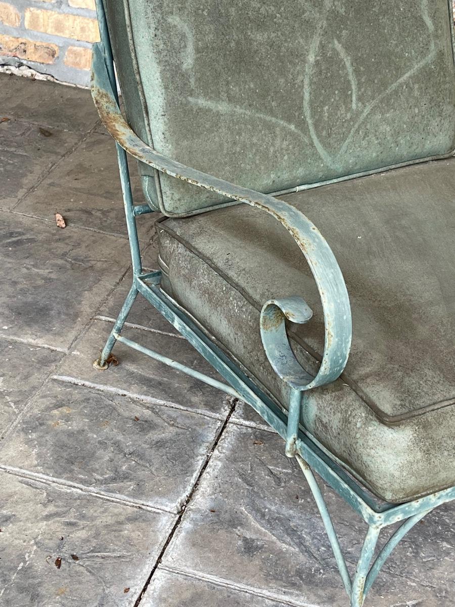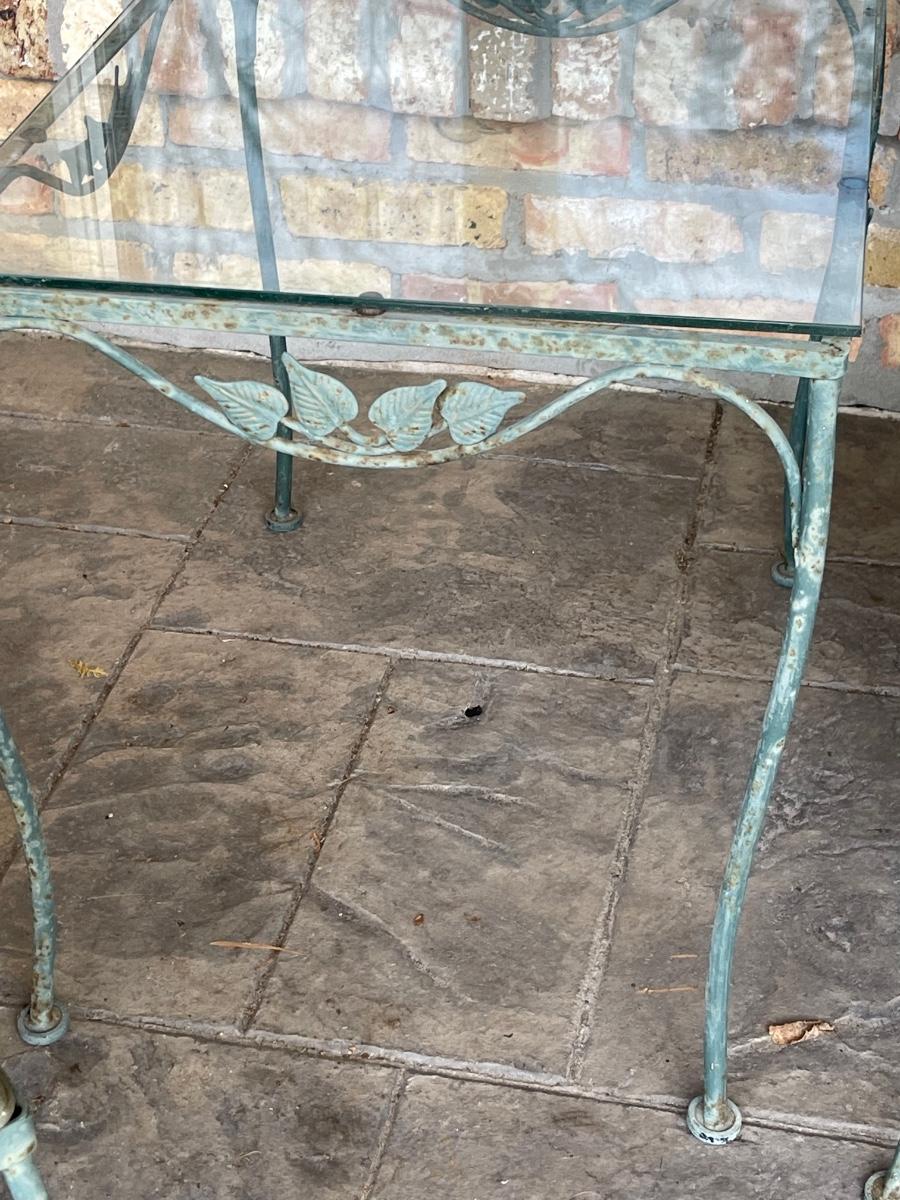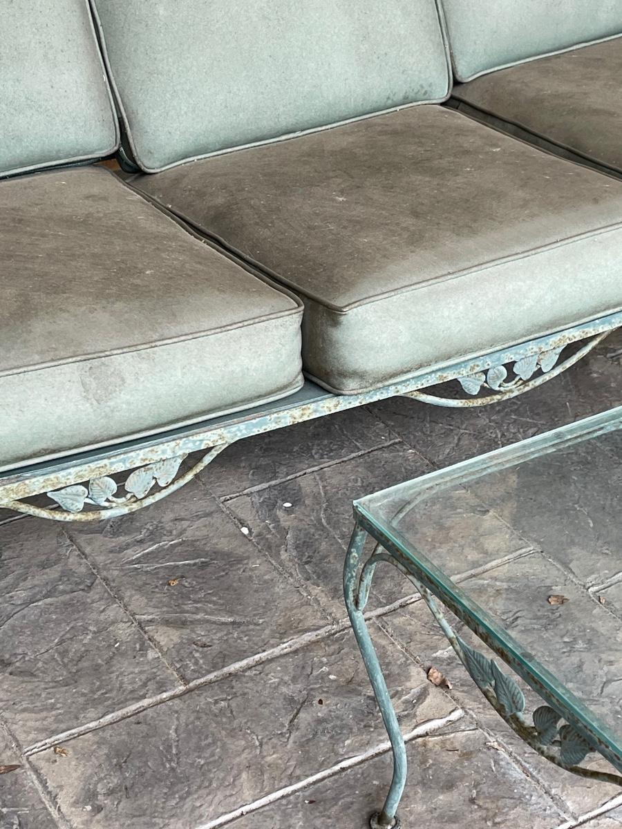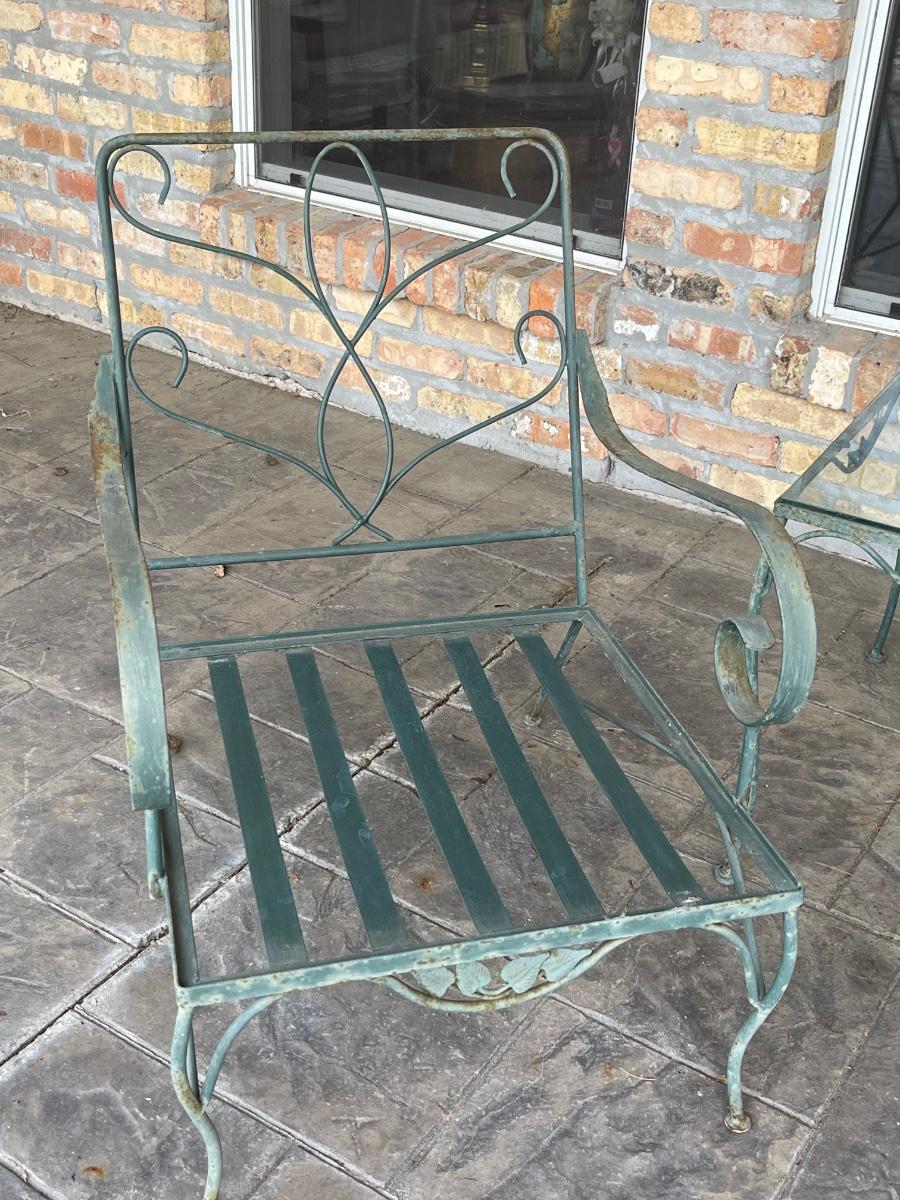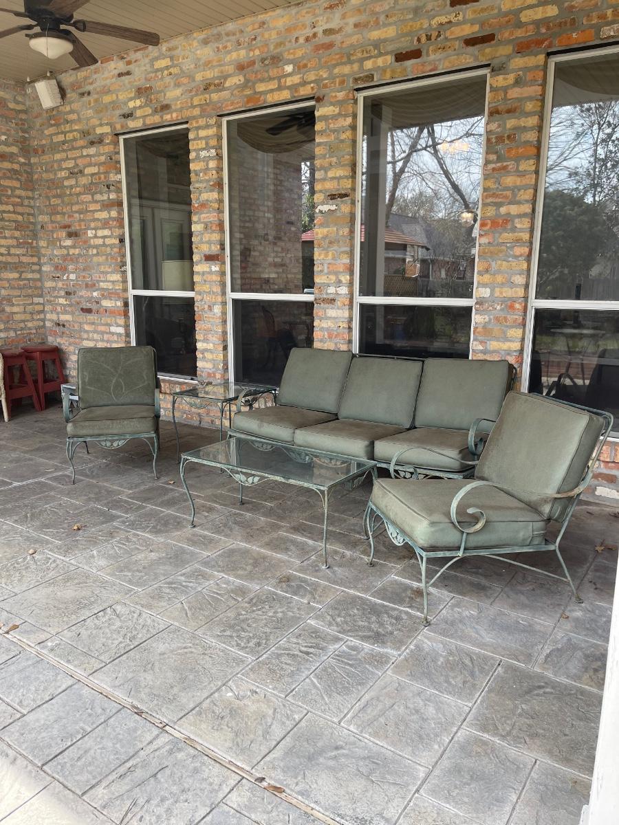 Porch Kept ~ Set really needs to be cleaned ~ no rips in the vinyl cushions, however, there is some fading on cushions ~ Surface rust on metal ~ 3 seater measures 31” H x 65” W x 34” D ~ Pair of matching chairs measure 31” H x 23.5” W x 32” D ~ glass top coffee table is 16” H x 36” W x 18” D and the glass top end table is 20” H x 18” W x 24” D ~ I did clean one cushion to show the pattern of the vinyl on the chairs. (see photos)