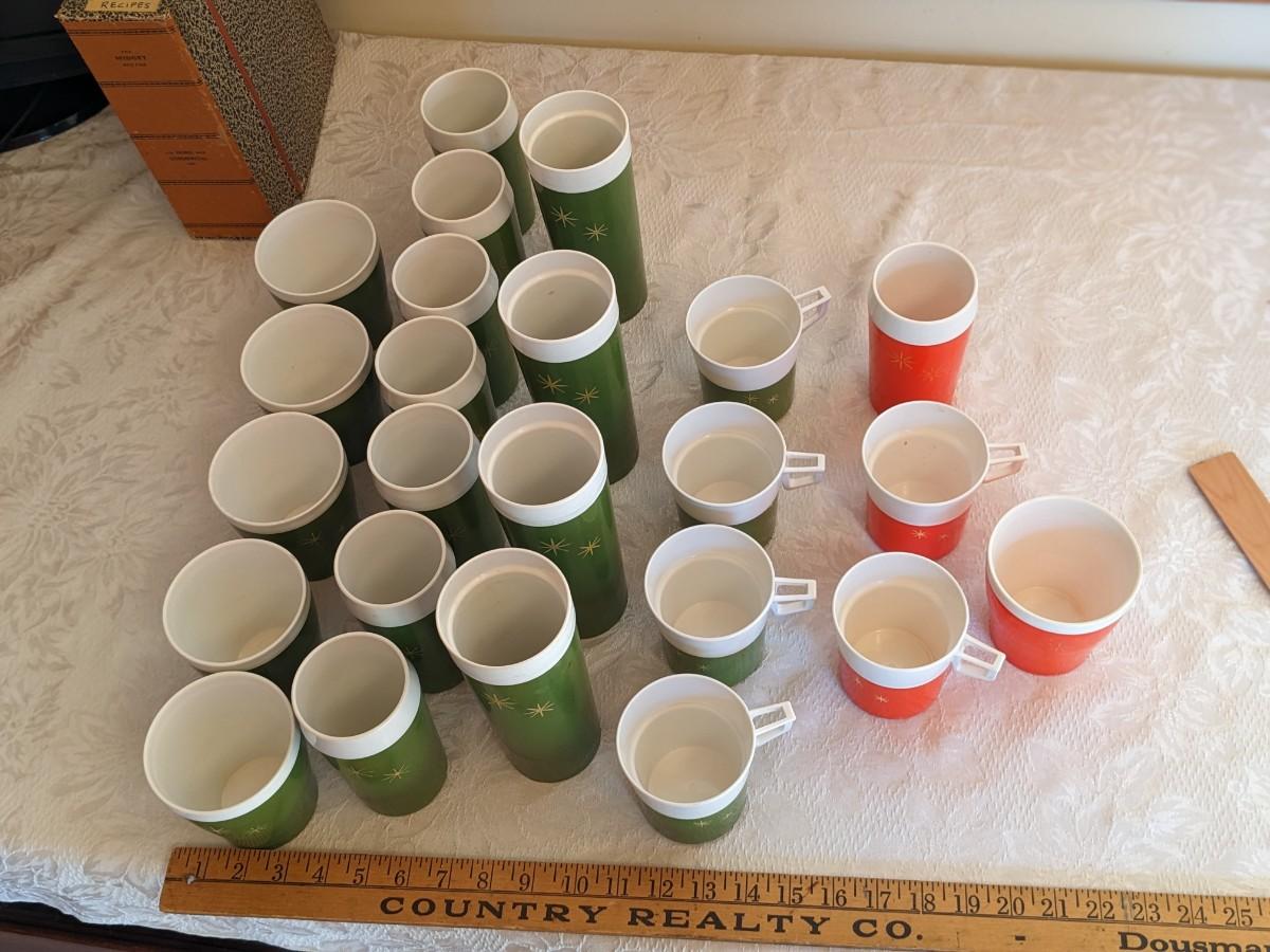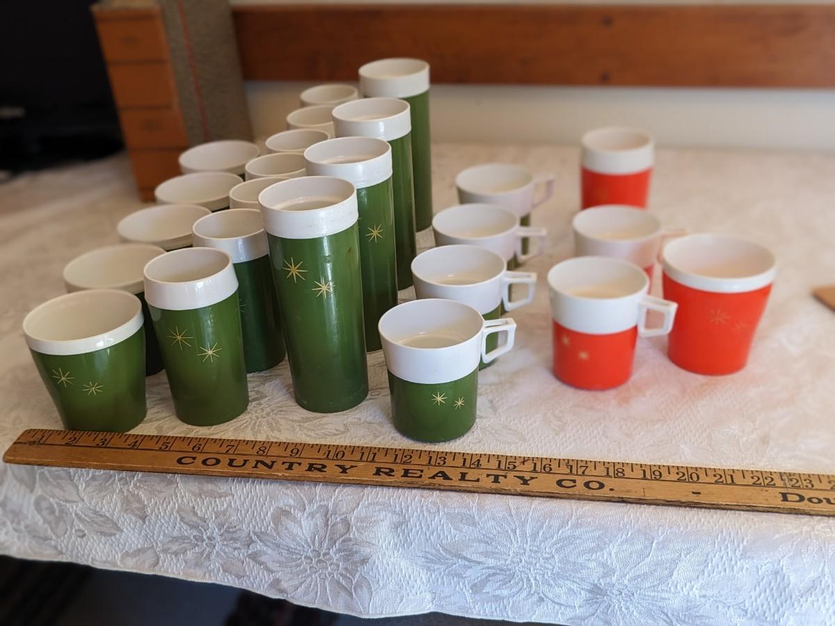 MCM Plastic Cup Set Green & Orange Starburst Pattern Camper Drinkware