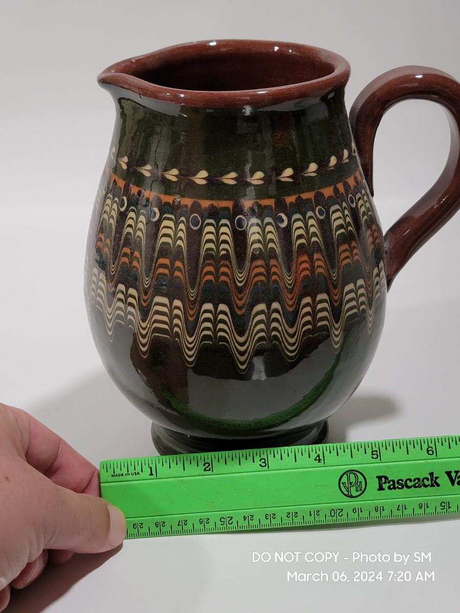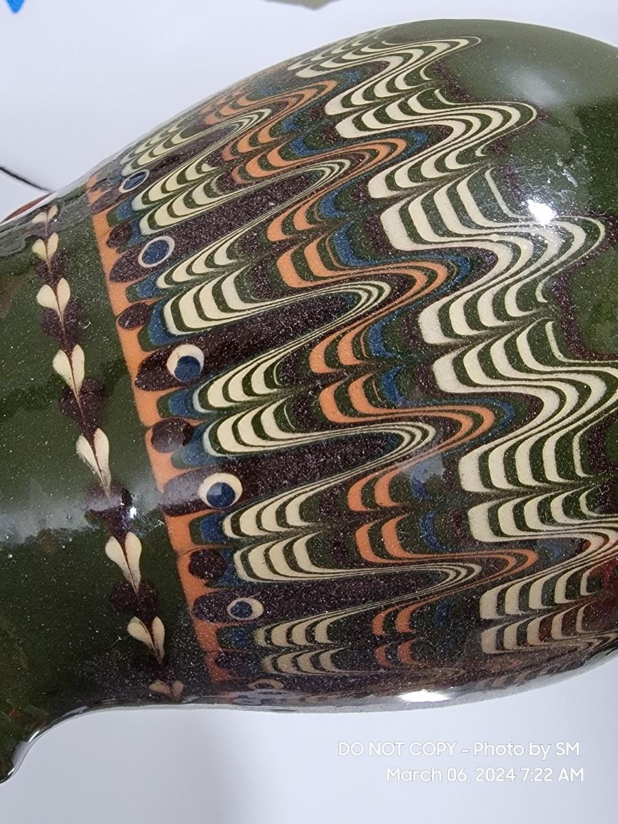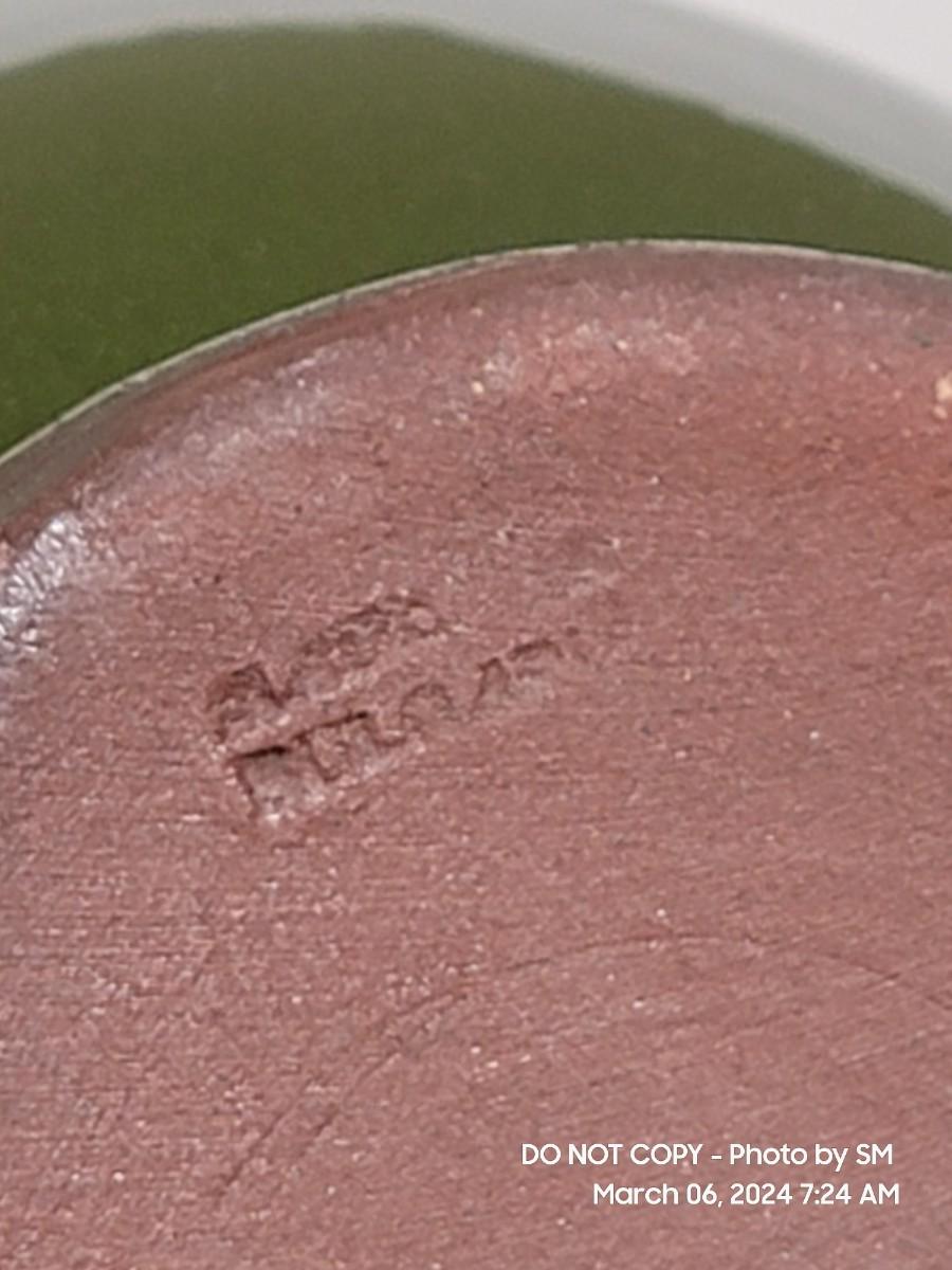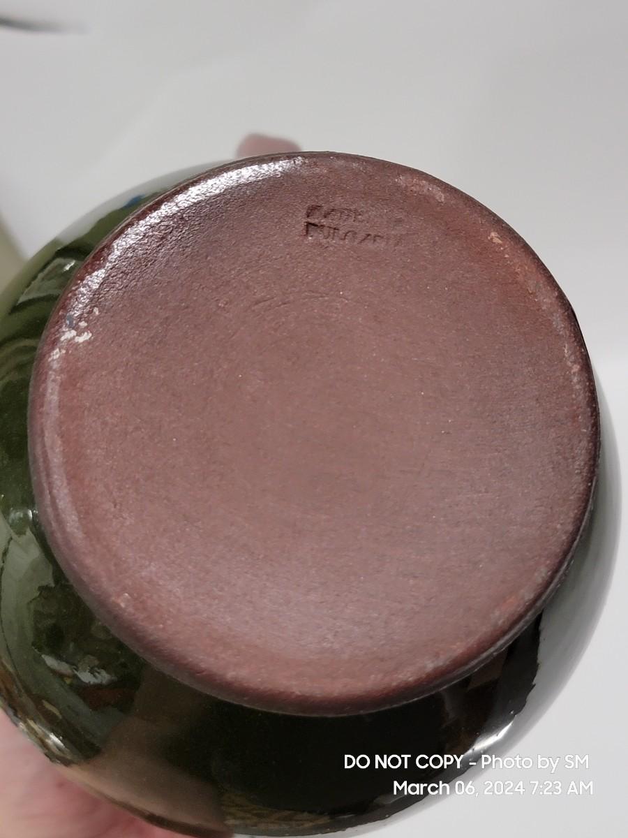 I am unable to make out the makers mark. Unsire if this is glazed pottery or ceramic, either way its a stunning piece. Has the Mid Century and or Retro vibe. This is definitely hand painted. Not sure of actual age.