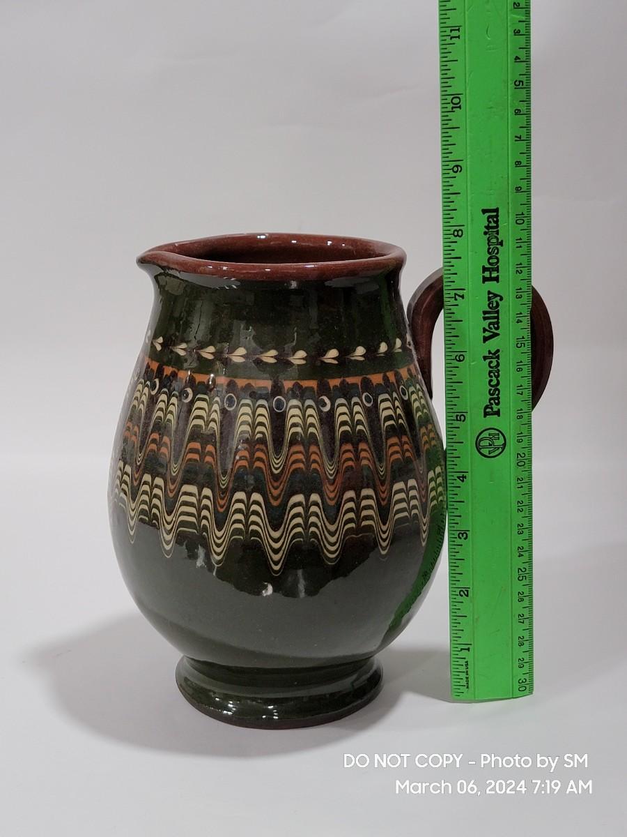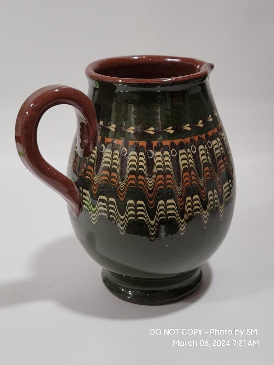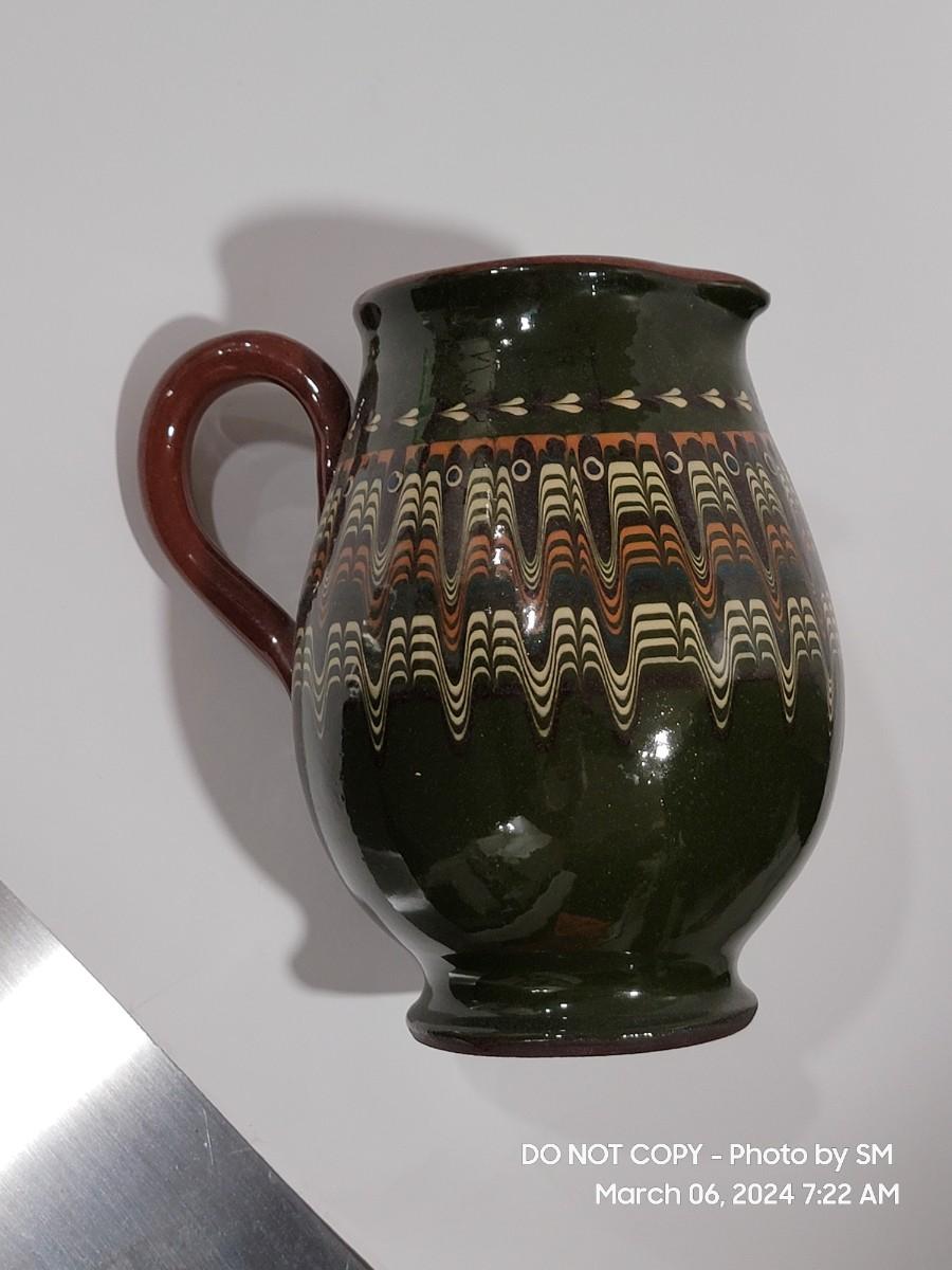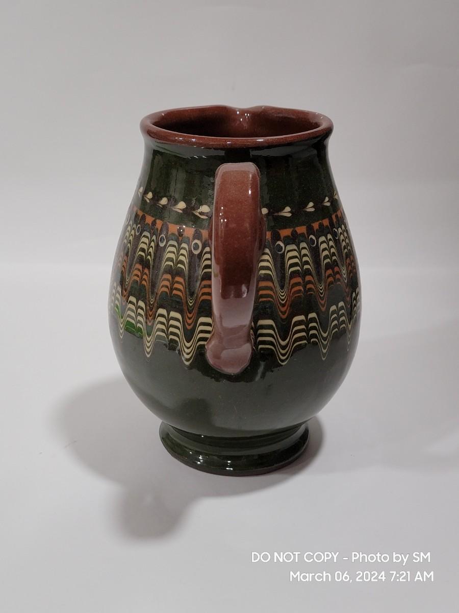 I am unable to make out the makers mark. Unsire if this is glazed pottery or ceramic, either way its a stunning piece. Has the Mid Century and or Retro vibe. This is definitely hand painted. Not sure of actual age.
