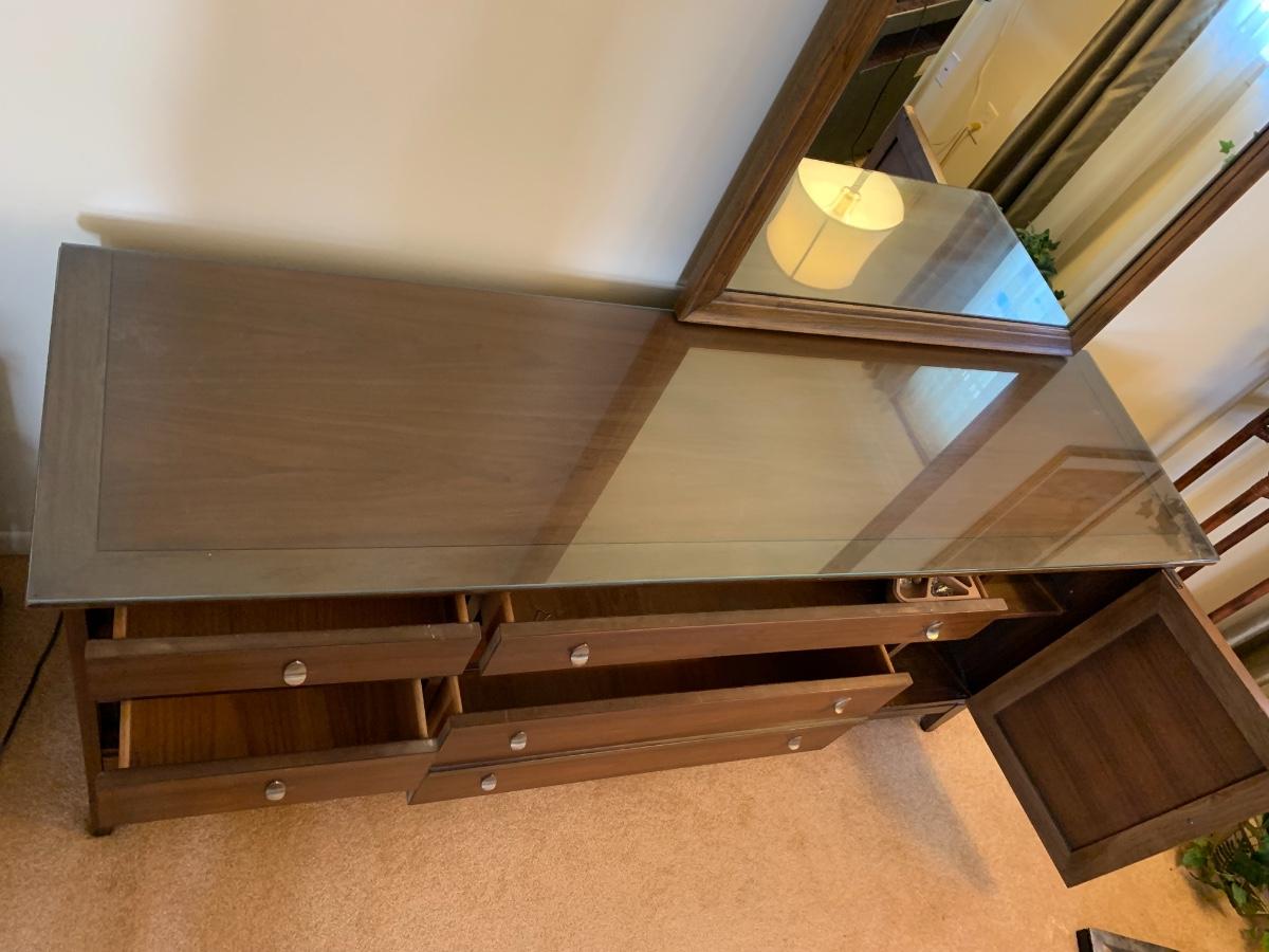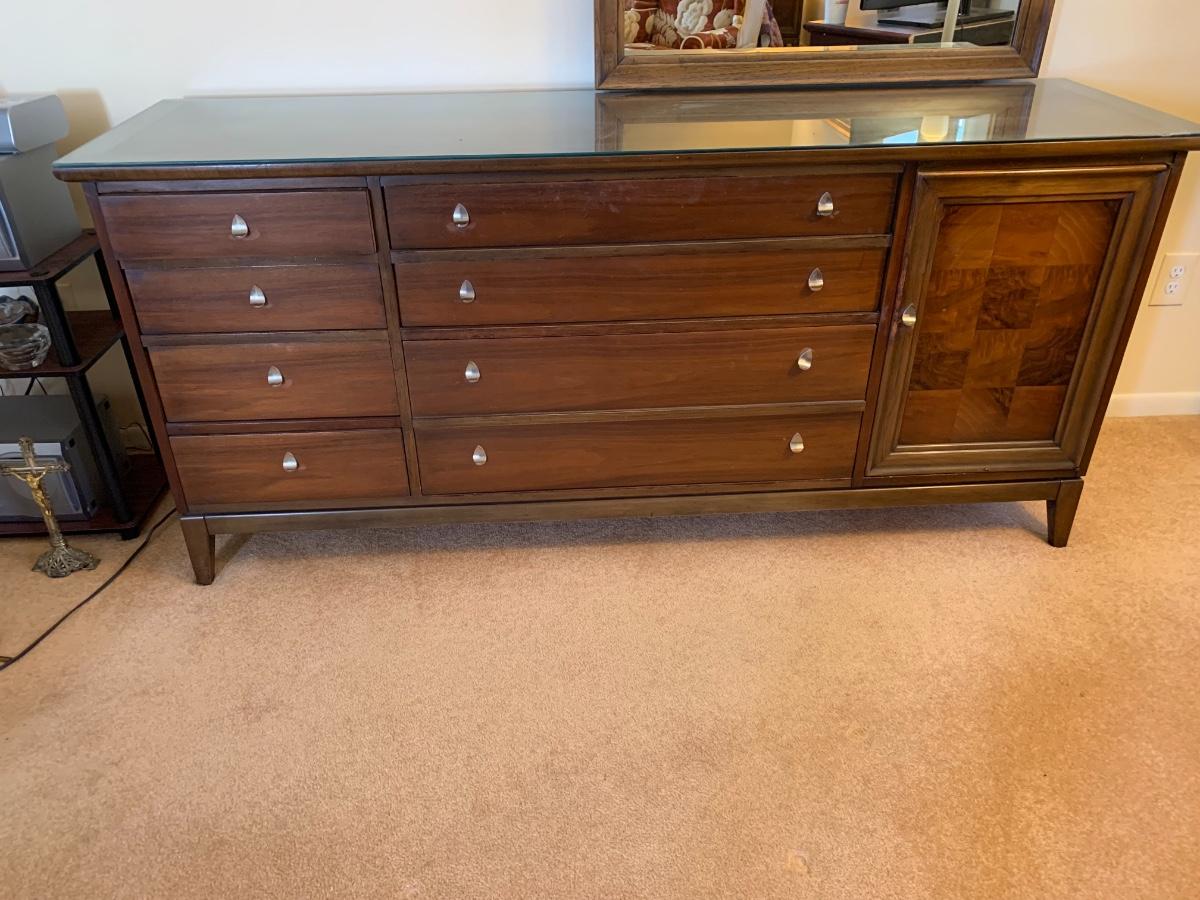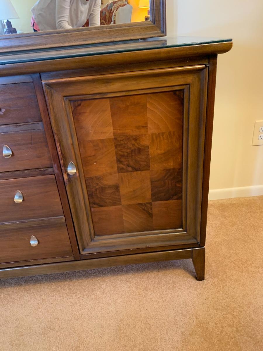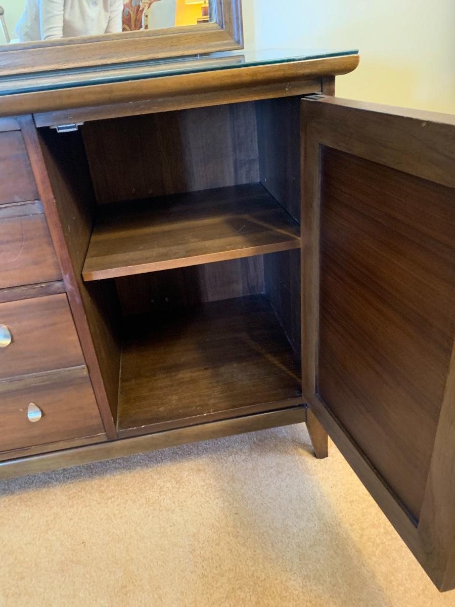 One side has door that opens and inner shelf. 6 drawers. Mirror attaches on back. Silver pulls.