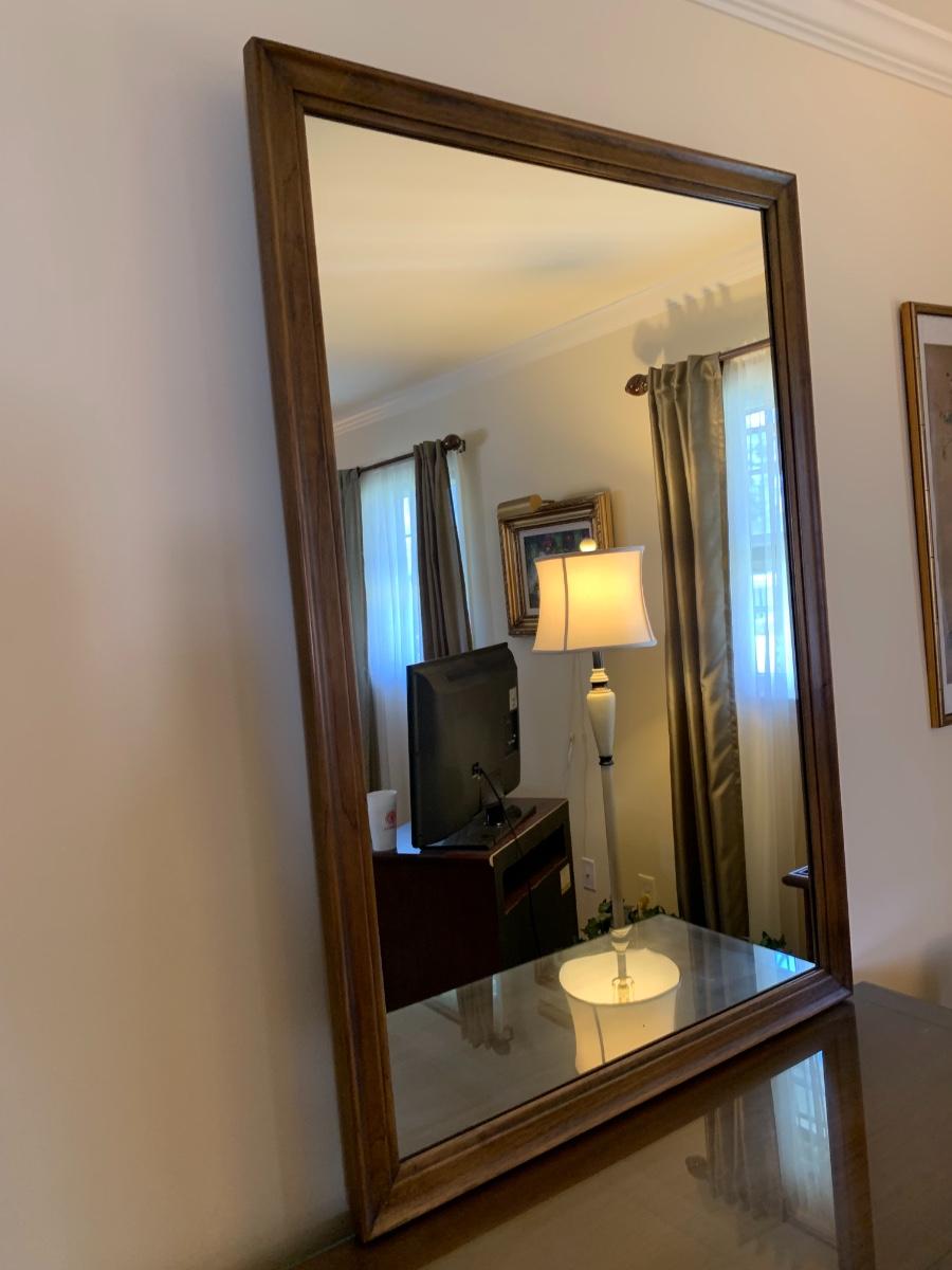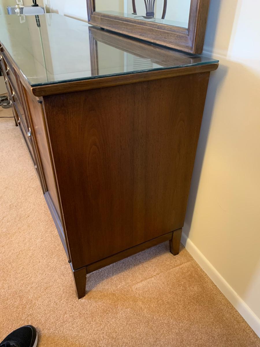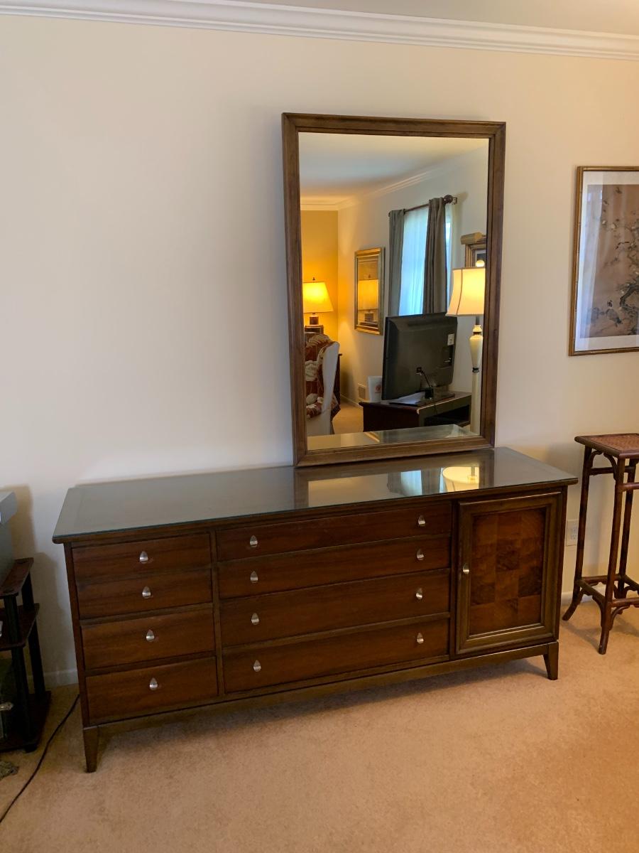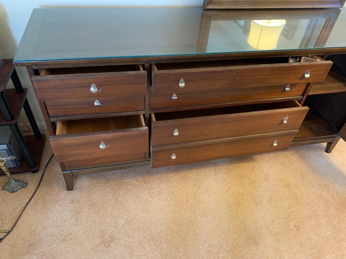 One side has door that opens and inner shelf. 6 drawers. Mirror attaches on back. Silver pulls.