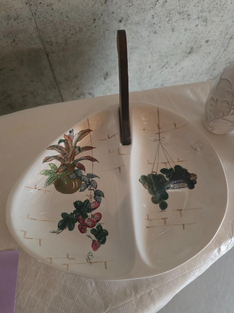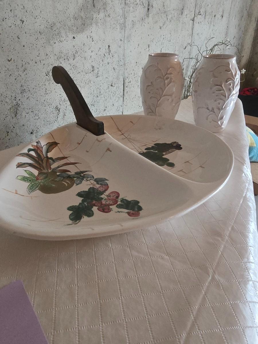 MCM SERVING DISH WITH A HANDLE AND 2 CLAY VASES