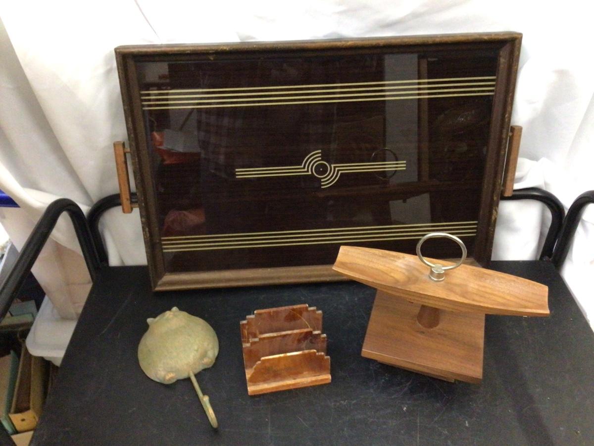 You get a really nice MCM serving tray, a nice wood napkin or letter holder, a MCM wood pipe holder, and a great cat coat hook.