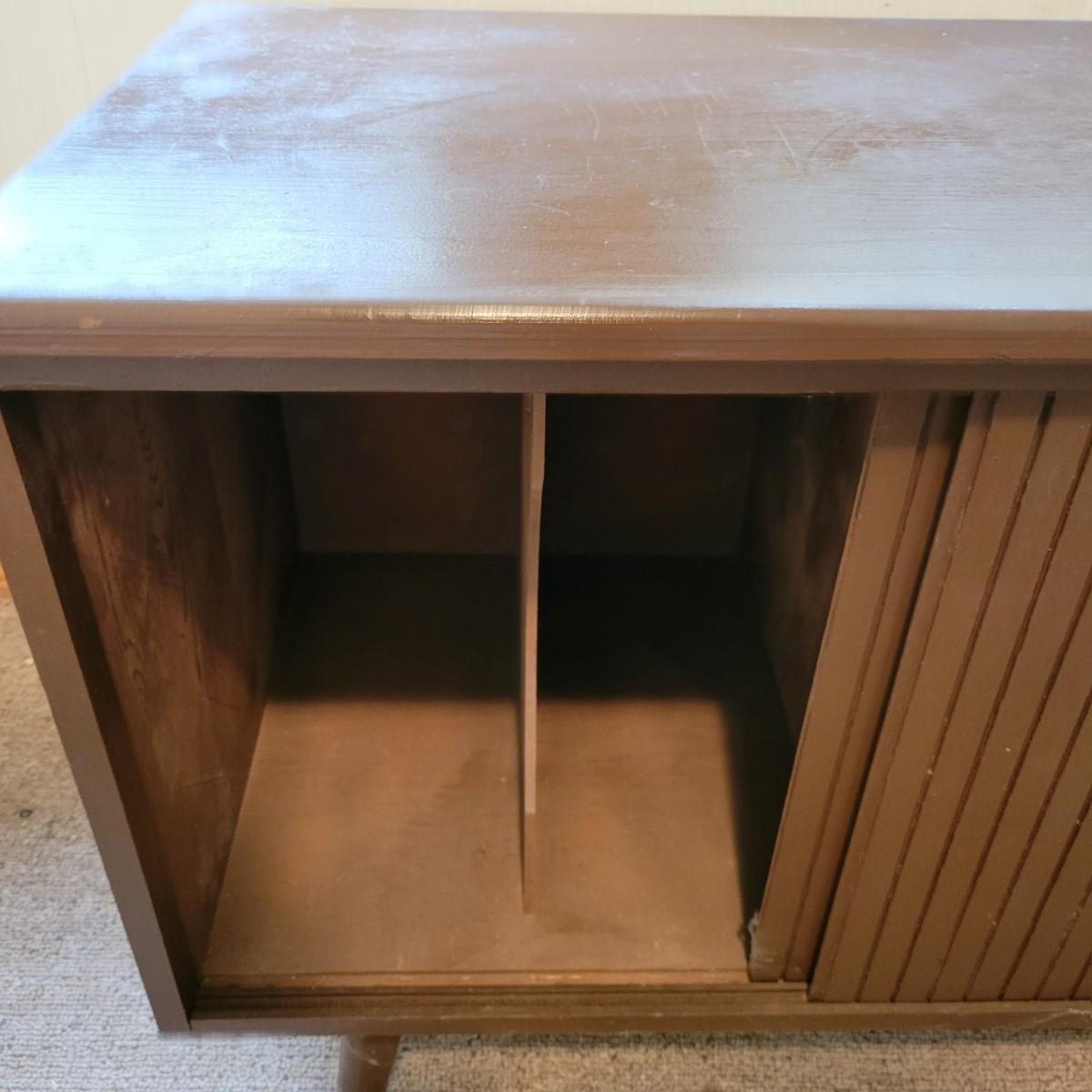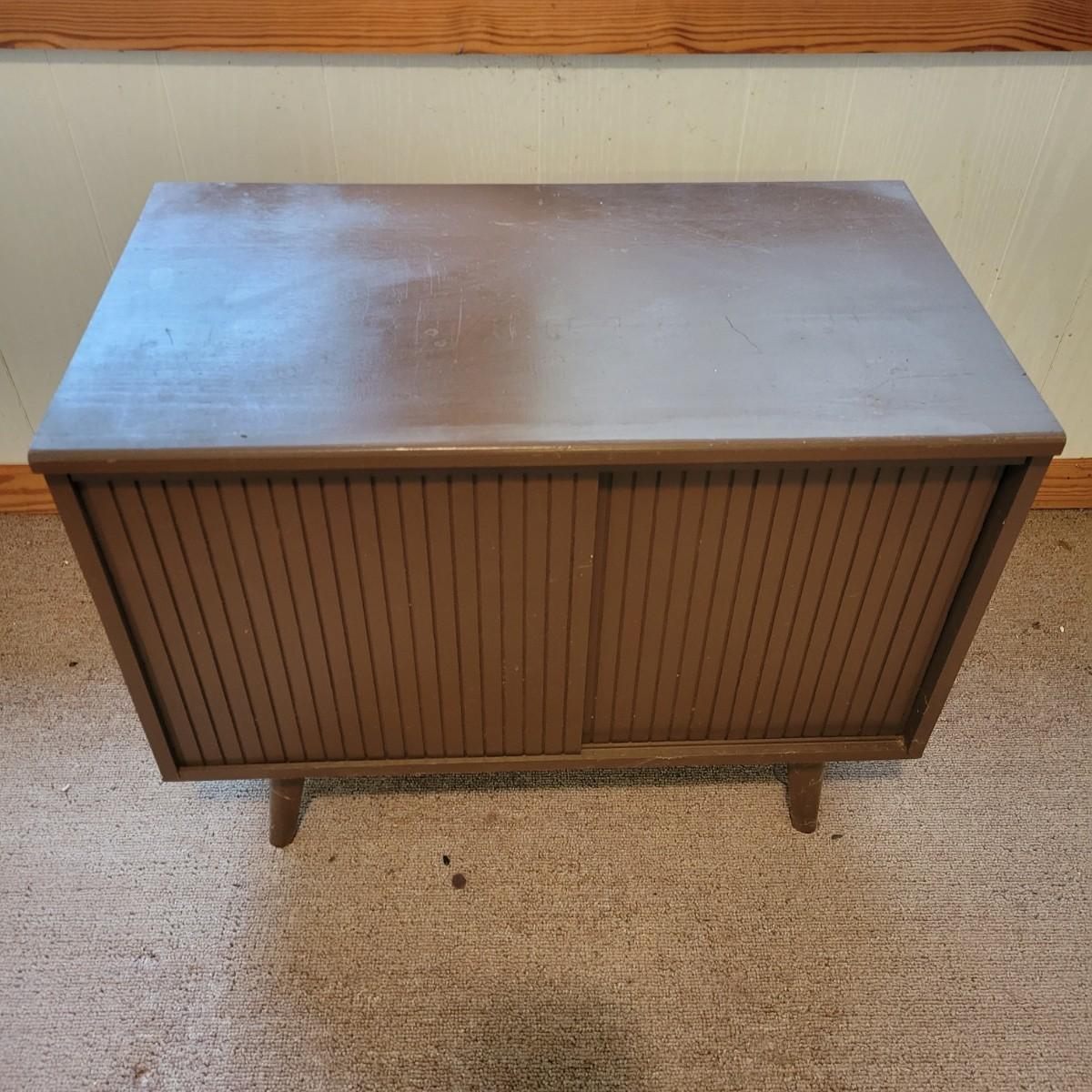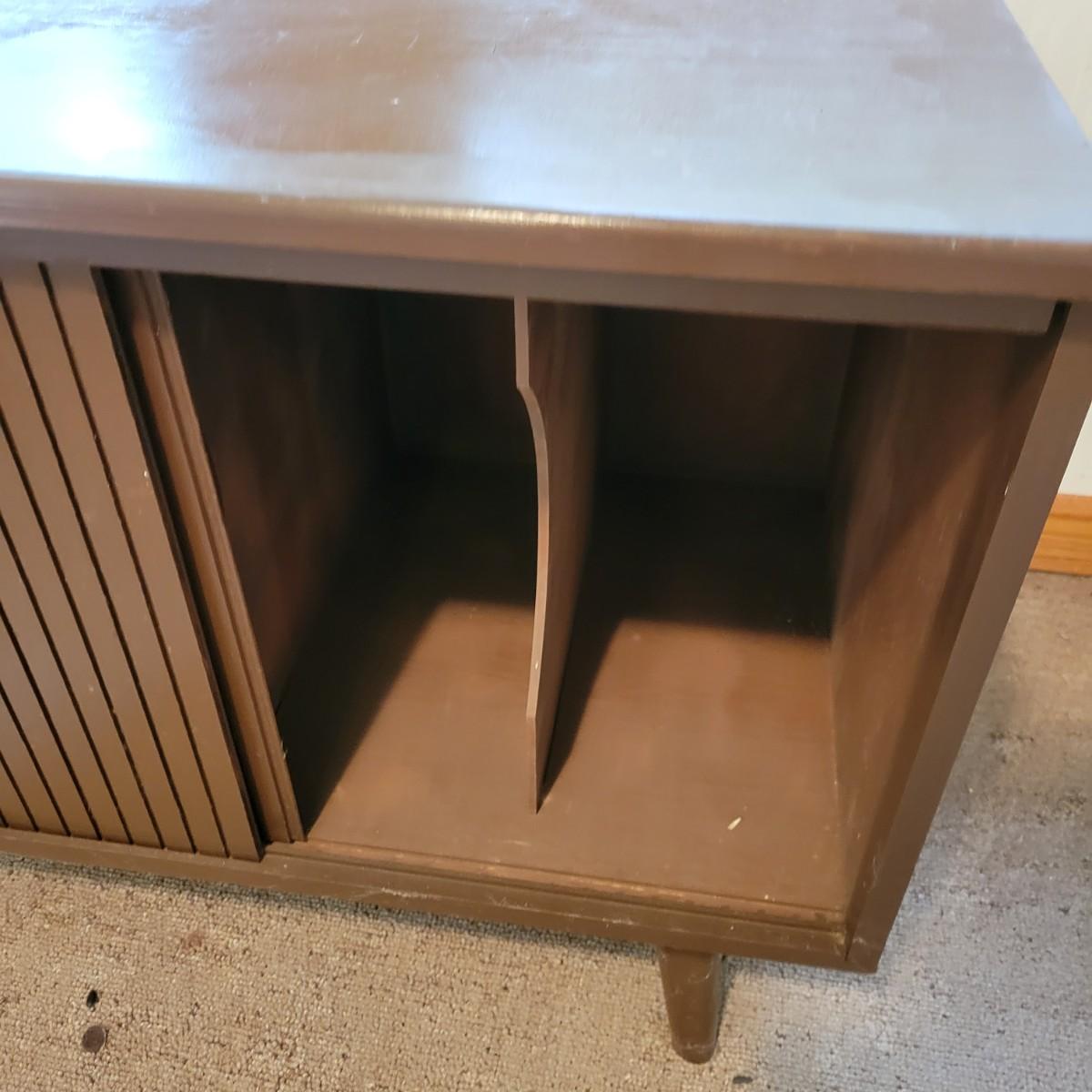 A solid wood side table with sliding front doors that has vertical storage slats, that appears to made of wood with a dark brown finish. It measures approximately 26.5" x 15" x 20"H. There are few minor blemishes on the surface, see attached pictures for more detail. Local pickup only