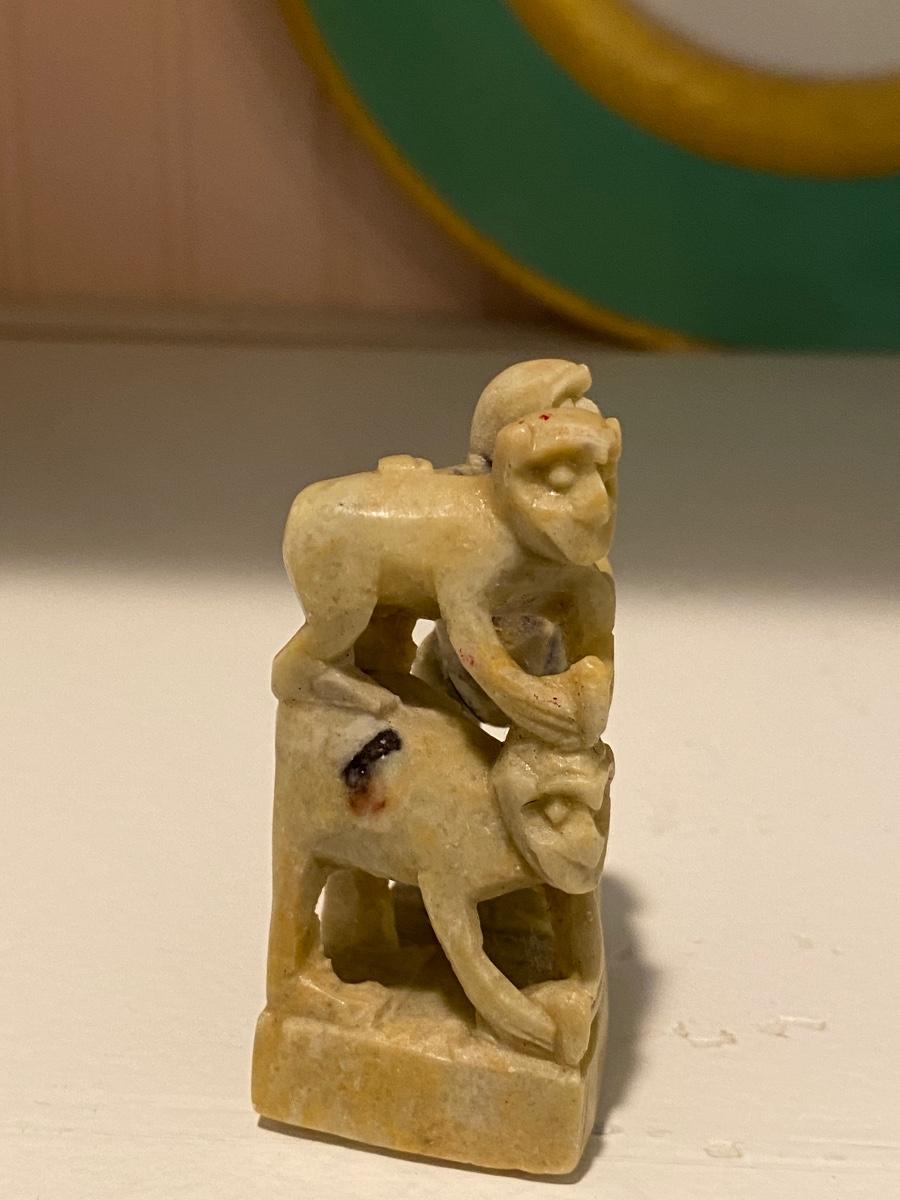 Fabulous vintage soapstone sculpture of three little monkeys in a pile in a wonderful variegated taupe/green/ grey . 4” x 2”