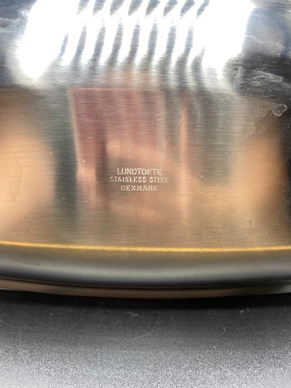 Mid Century Modern Lundtofte Denmark stainless steel serving tray. Great serving dish or as a simple minimalist style decor. Measures about 16" in length. Excellent vintage condition.