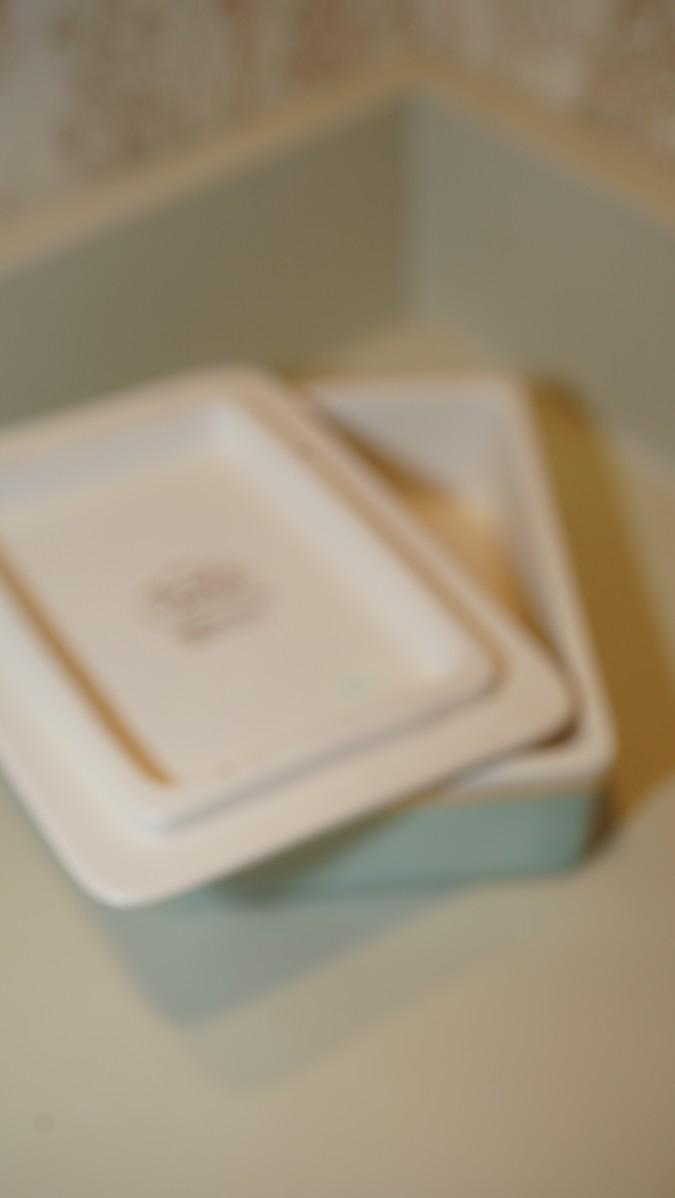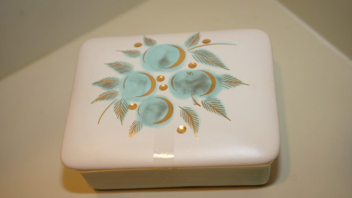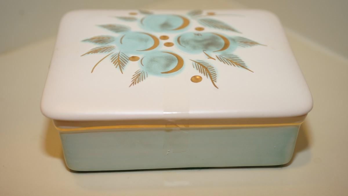 MCM STANGL POTTERY BOX "FROSTED FRUIT" PATTERN. PRETTY BLUE /GOLD ACCENT ON IVORY CERAMIC