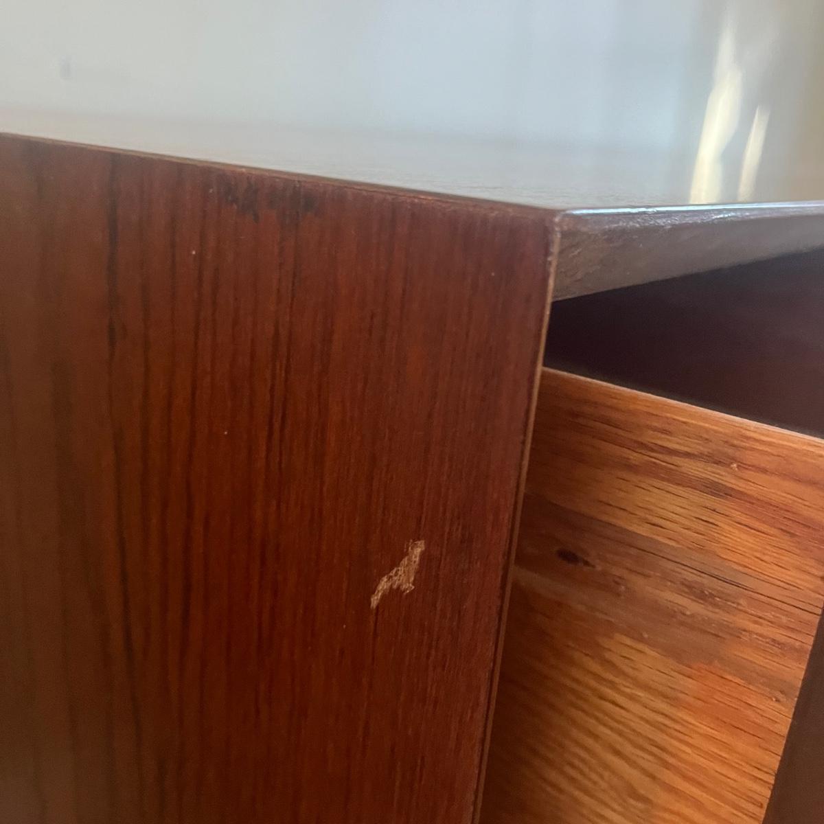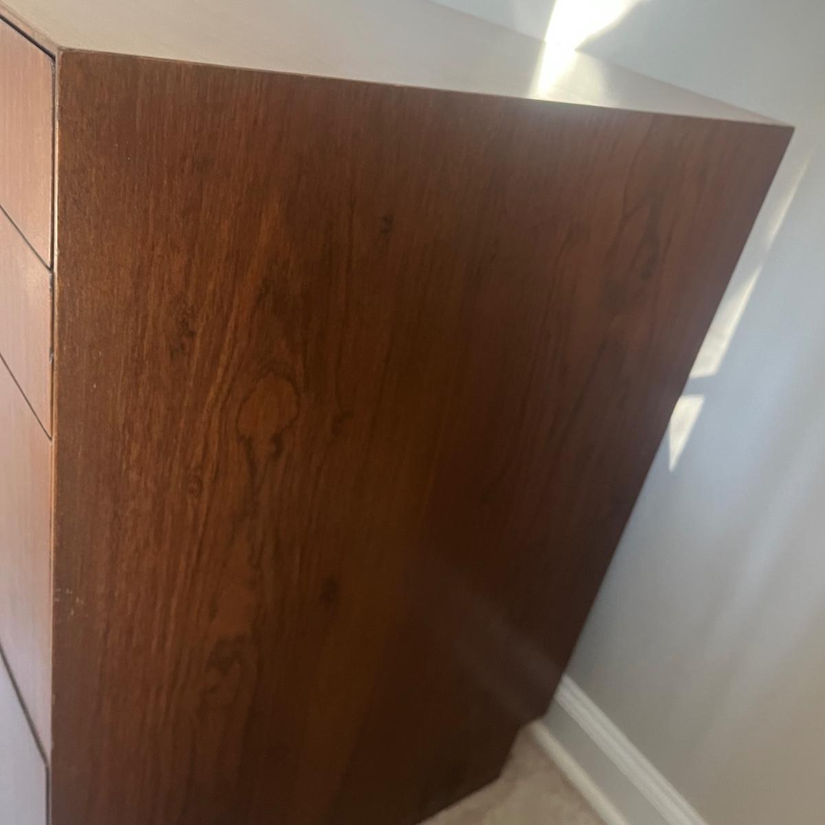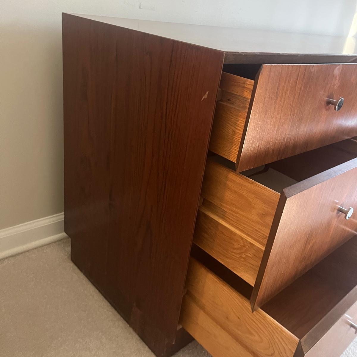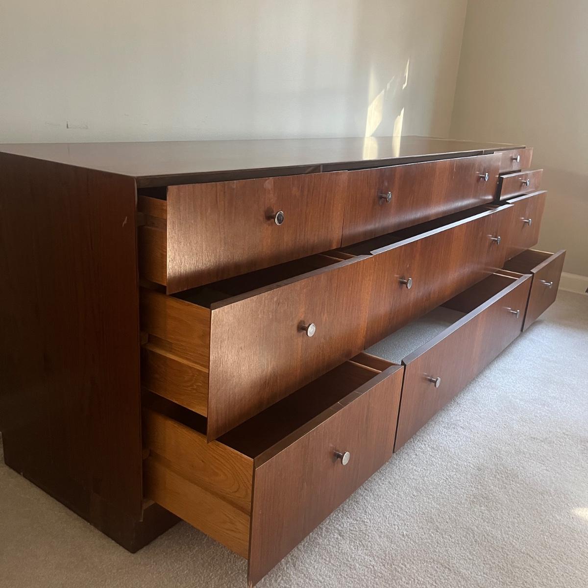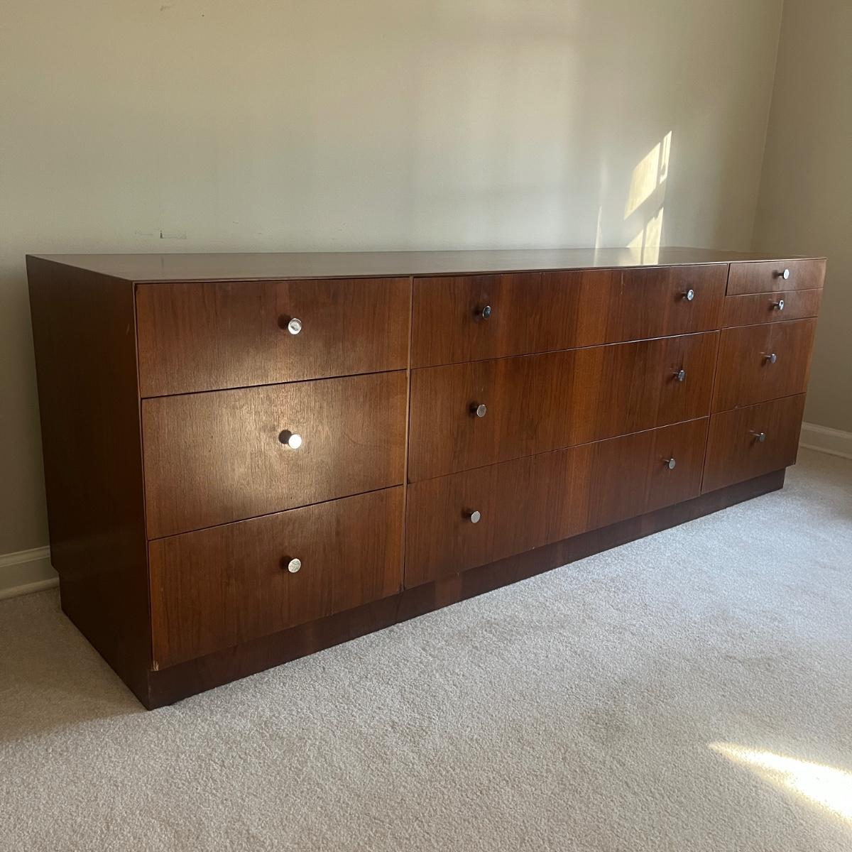 Lot includes a MCM style wooden veneered ten drawer dresser that measures 72” x 18” x 25.25”H. There are a few blemishes on the side and both corners of a drawer. There is a matching cabinet in this auction.