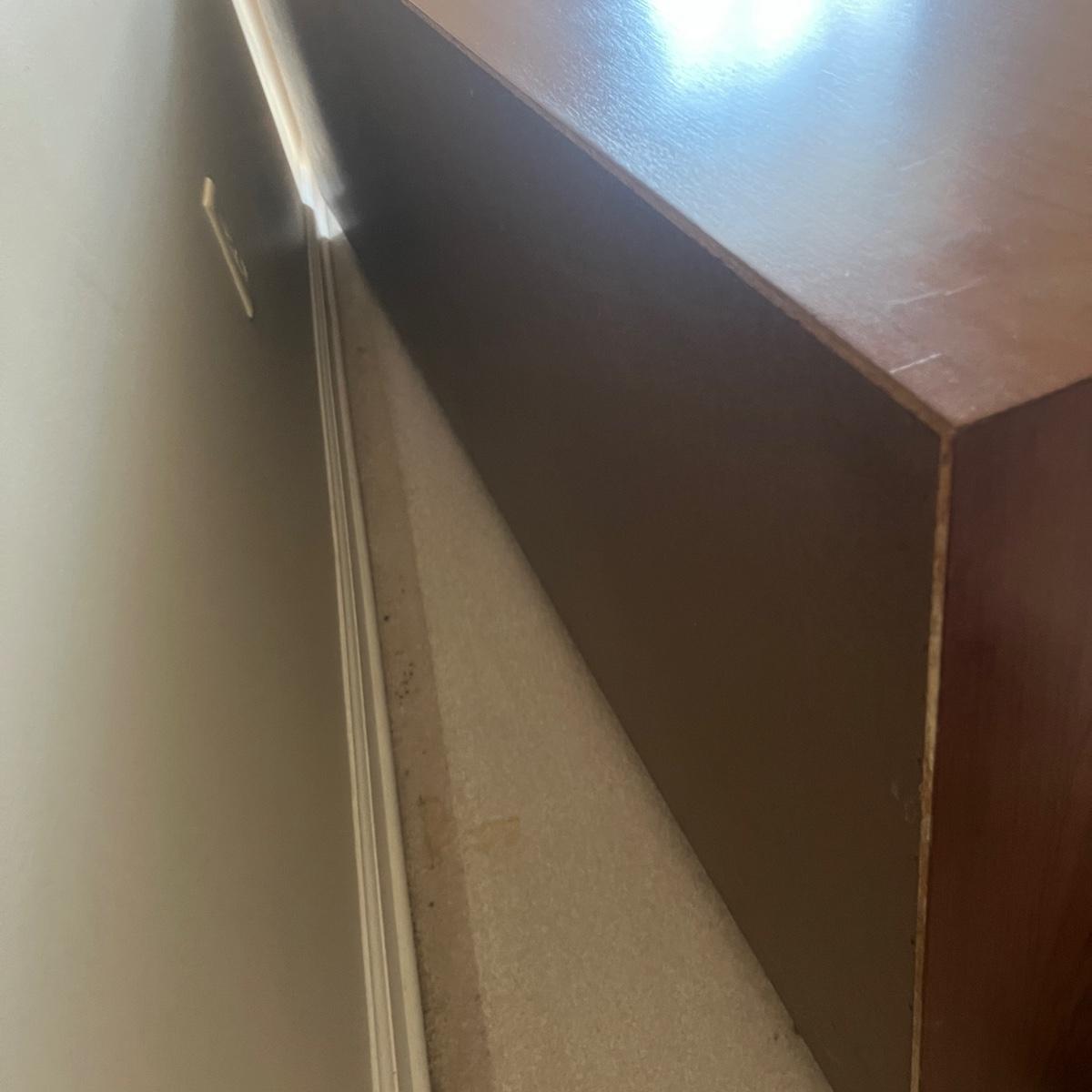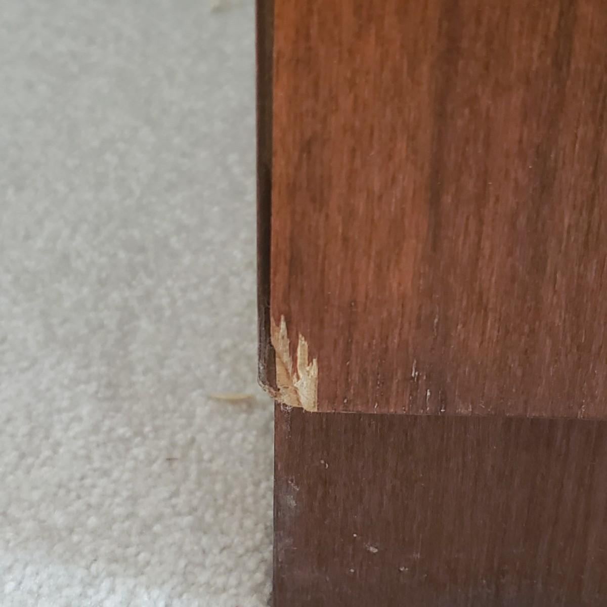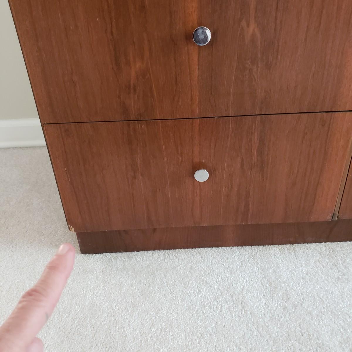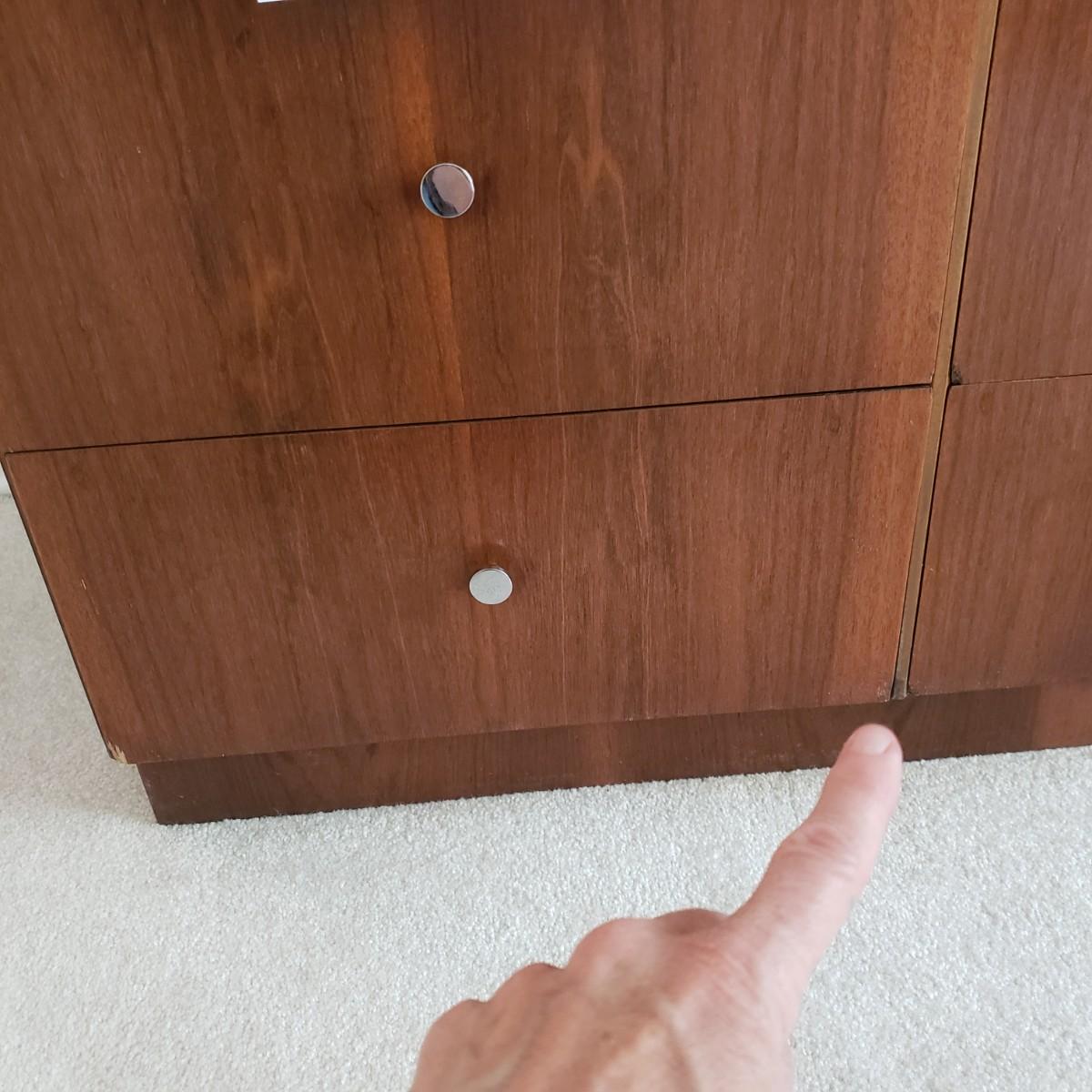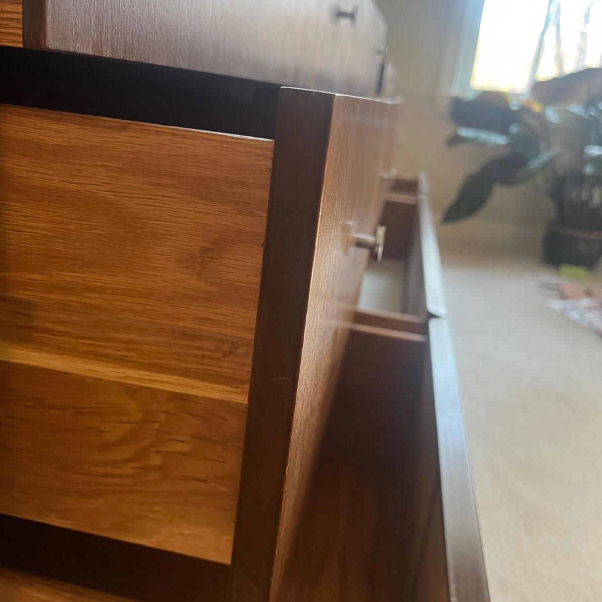 Lot includes a MCM style wooden veneered ten drawer dresser that measures 72” x 18” x 25.25”H. There are a few blemishes on the side and both corners of a drawer. There is a matching cabinet in this auction.
