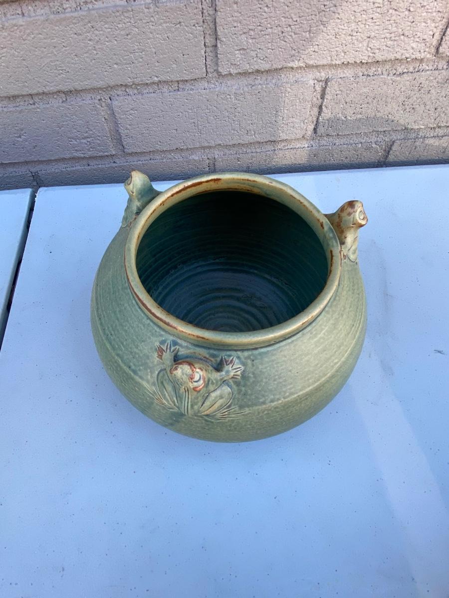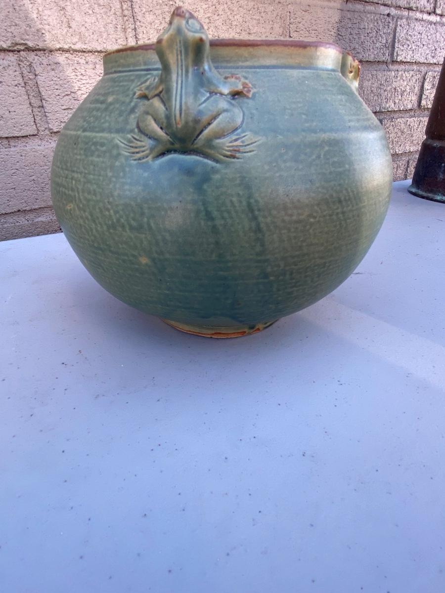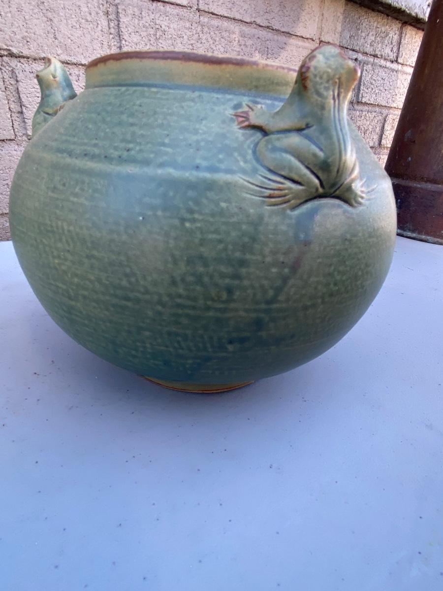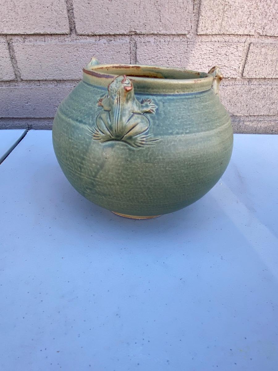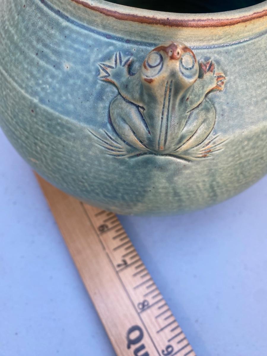 Do yo love frogs? This cute vase/ bowl has 3 of them peekingover the rim. Excellent condtion and a lovely accent piece to any room. Hand thrown and sculpted