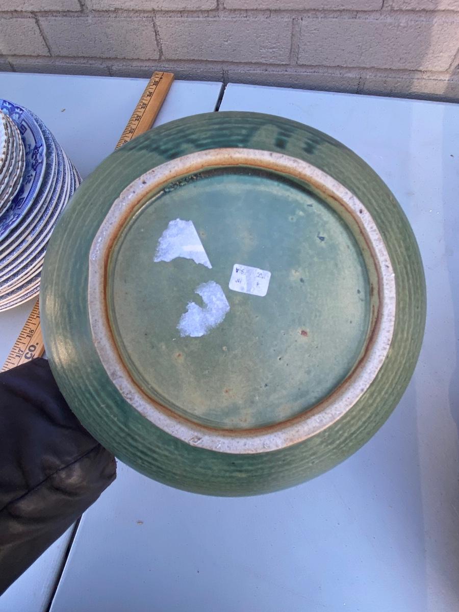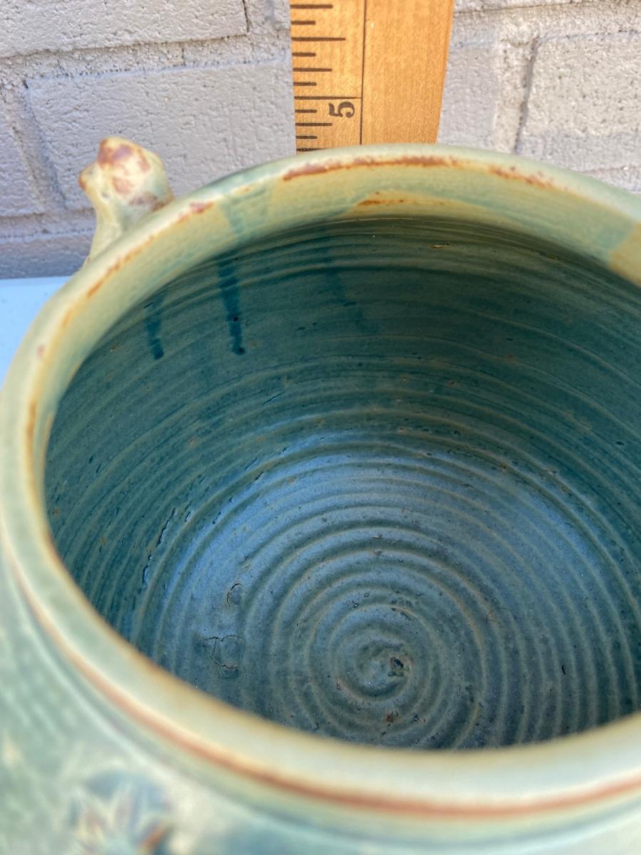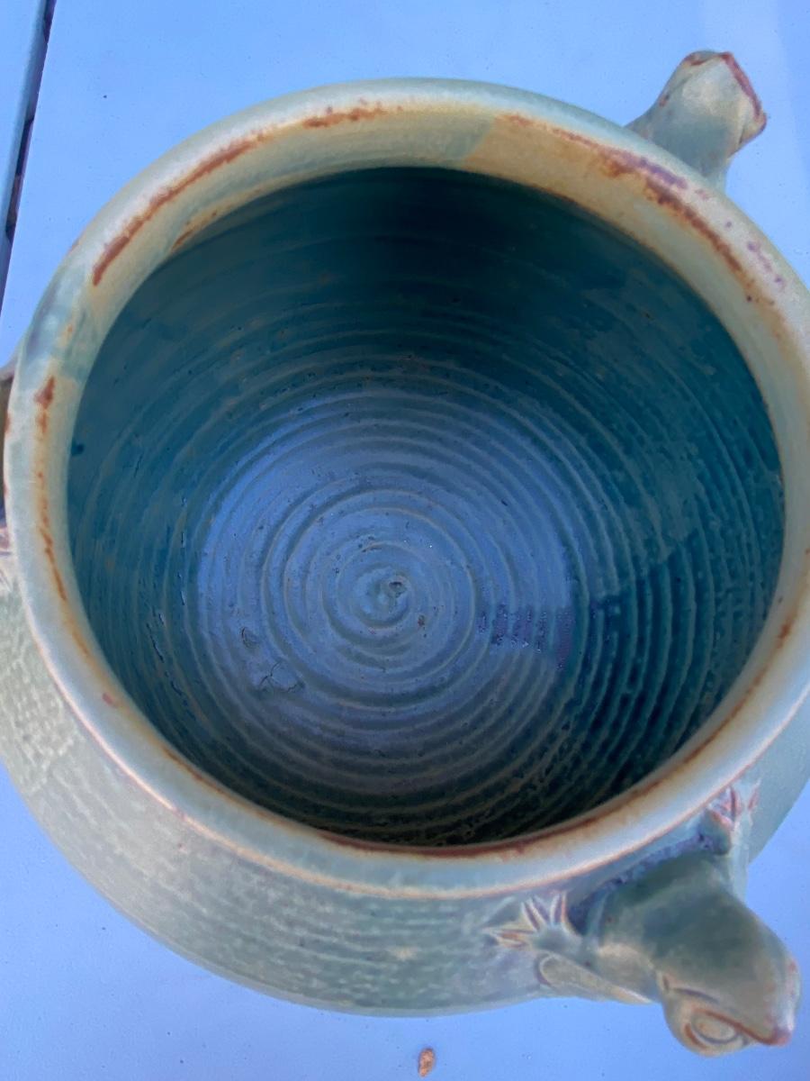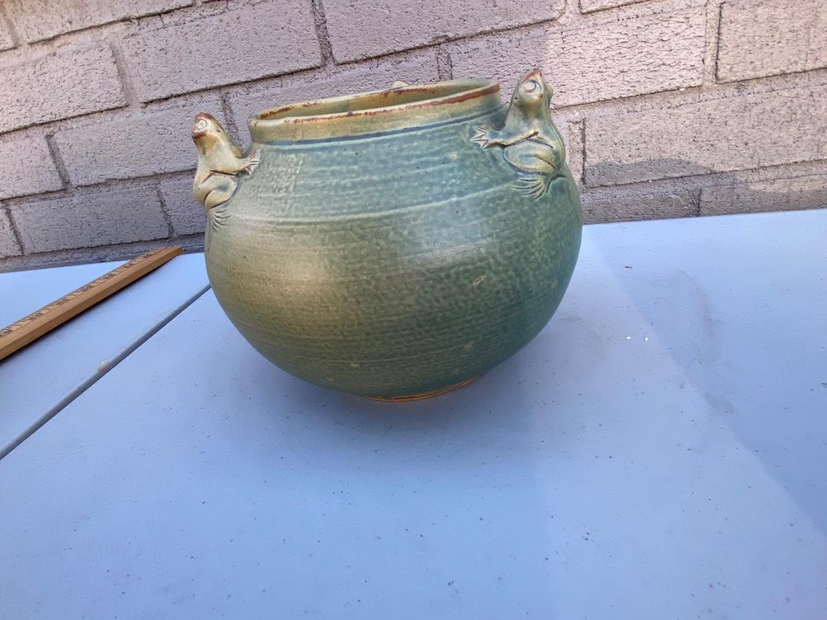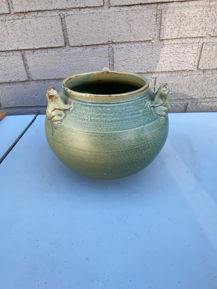 Do yo love frogs? This cute vase/ bowl has 3 of them peekingover the rim. Excellent condtion and a lovely accent piece to any room. Hand thrown and sculpted
