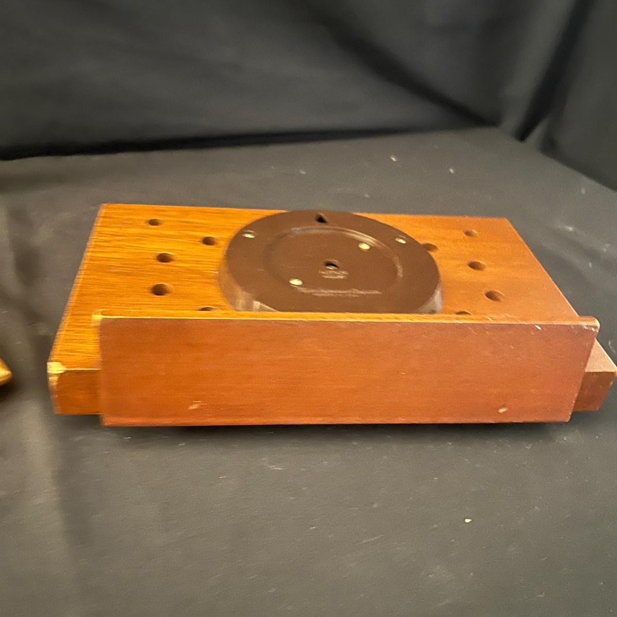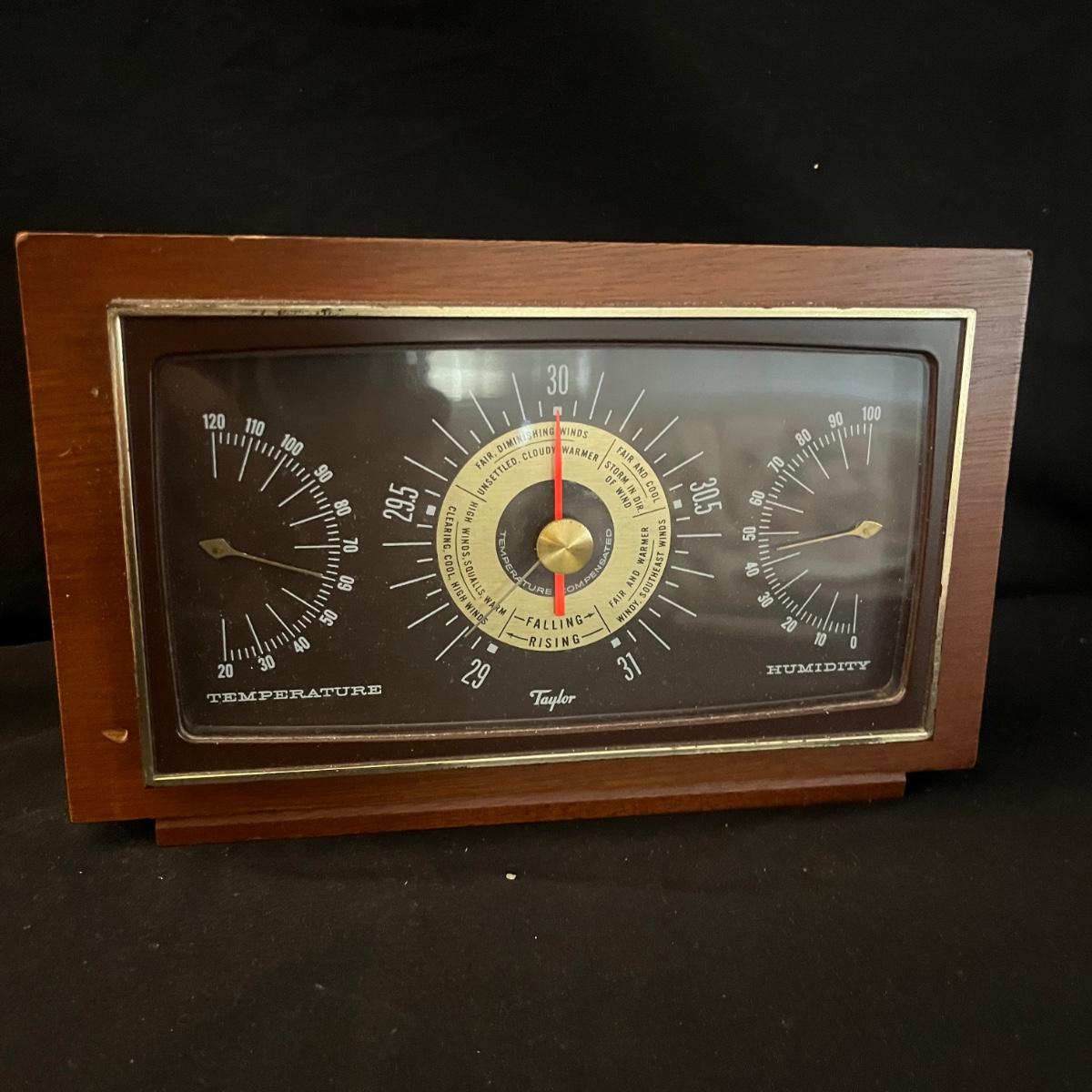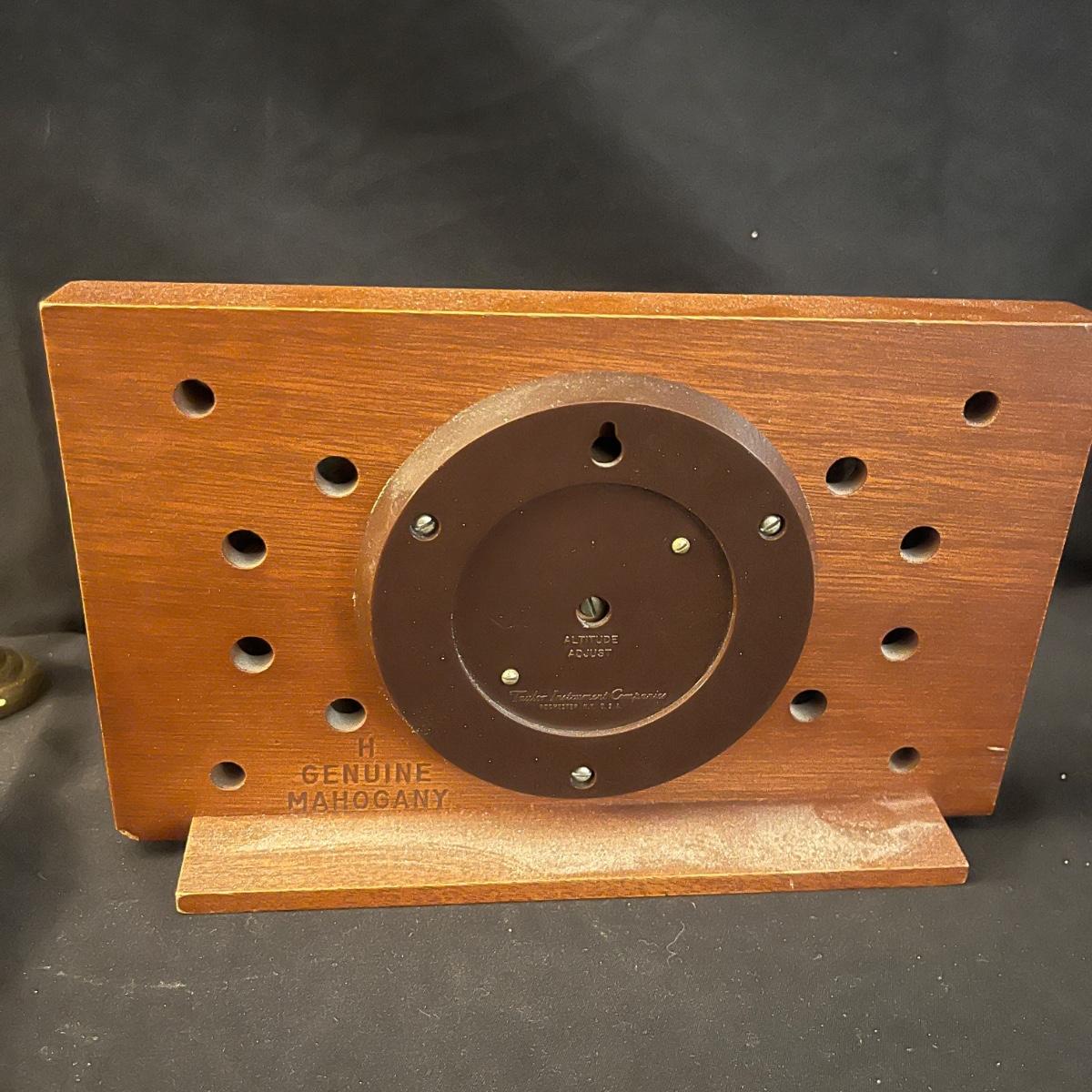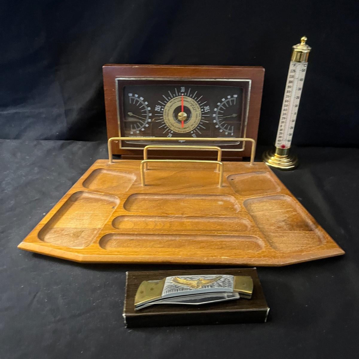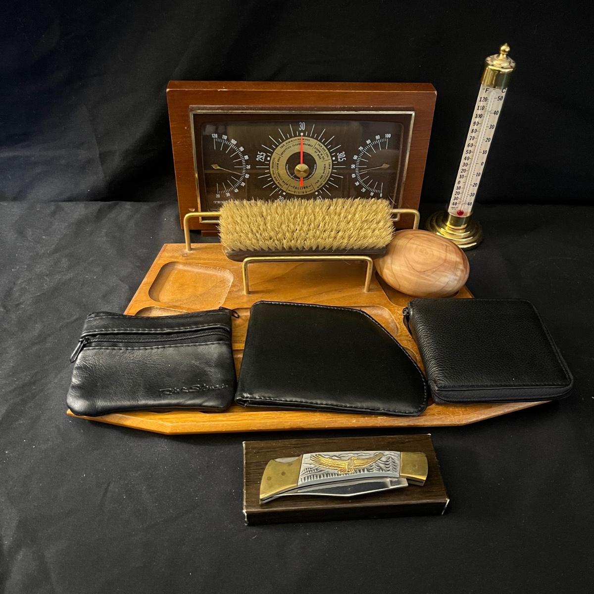 Lot includes a walnut wood valet tray, mahogany wood weather barometer by Taylor, abrass and glass thermometer by Conant Custom Brass, an ornate pocket knife, a wooden egg, brushes, and wallets. Valet tray measures 13” x 8” x 2.5”H.