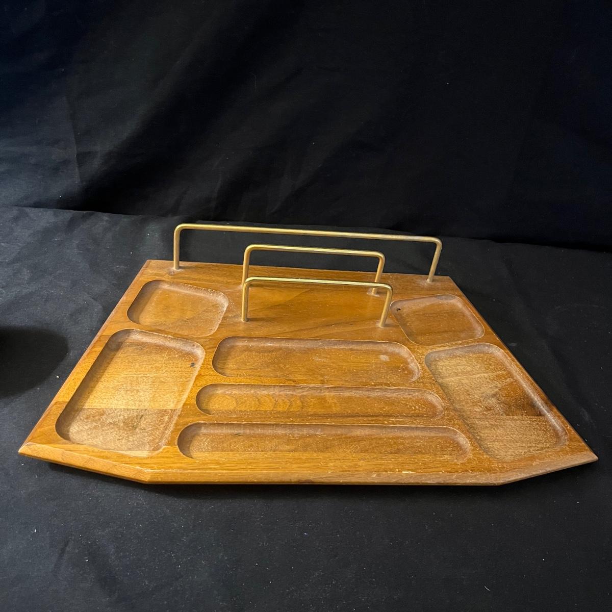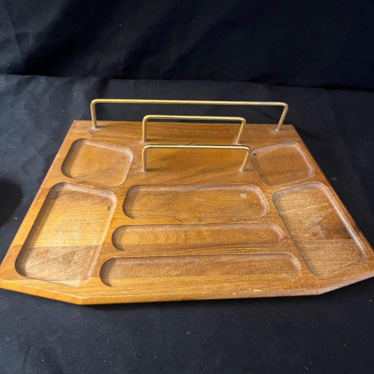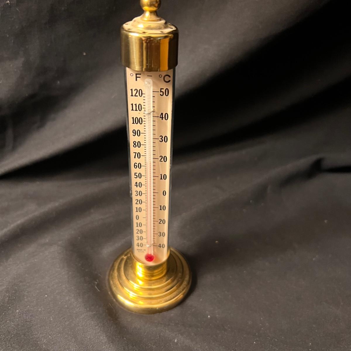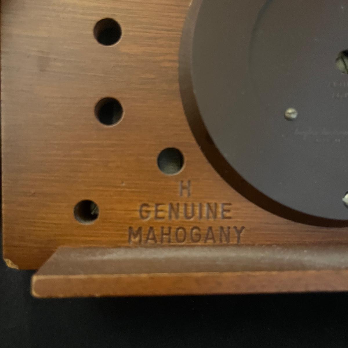 Lot includes a walnut wood valet tray, mahogany wood weather barometer by Taylor, abrass and glass thermometer by Conant Custom Brass, an ornate pocket knife, a wooden egg, brushes, and wallets. Valet tray measures 13” x 8” x 2.5”H.