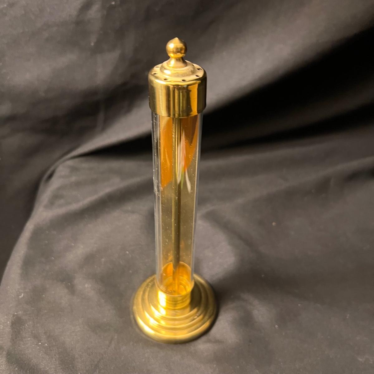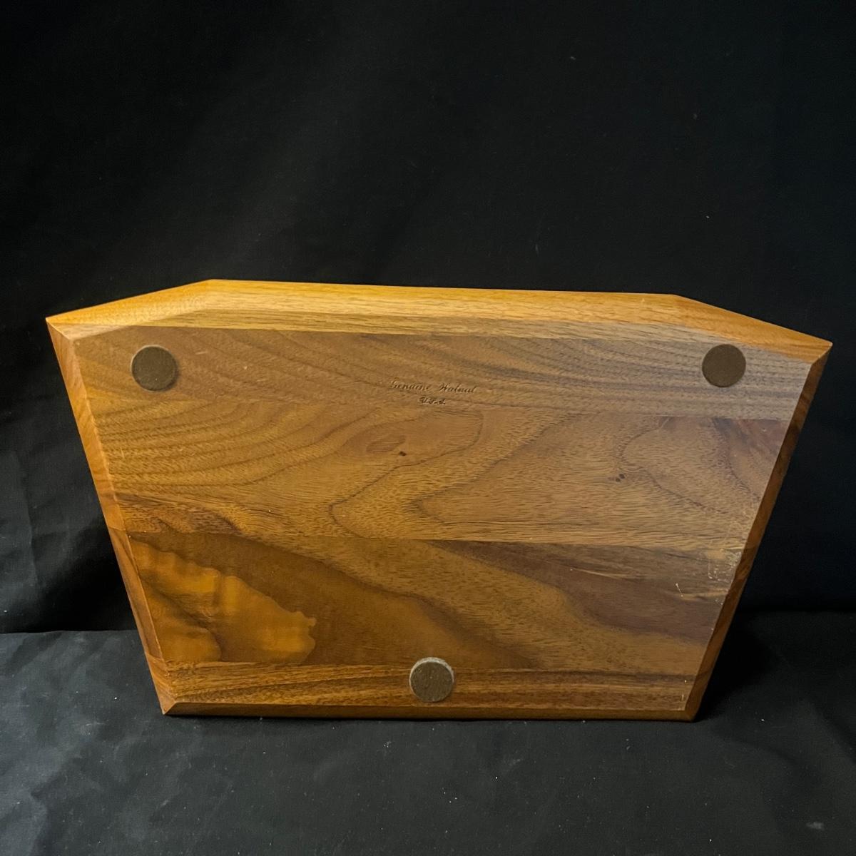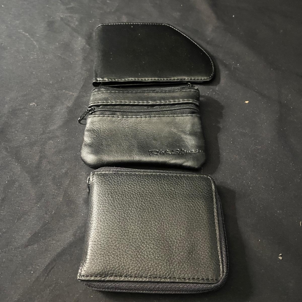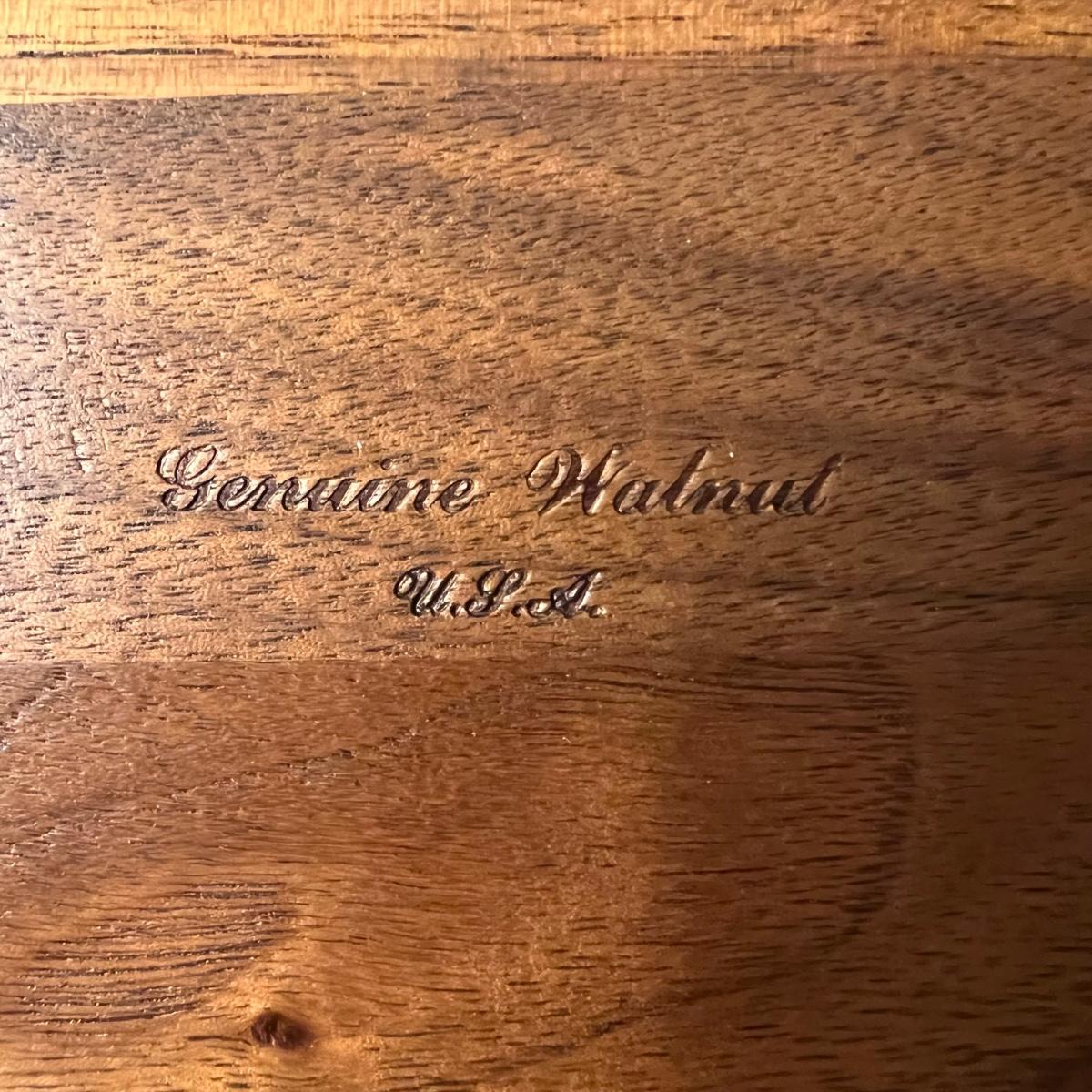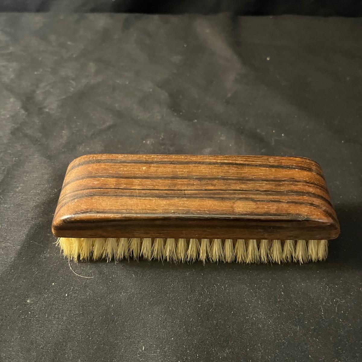 Lot includes a walnut wood valet tray, mahogany wood weather barometer by Taylor, abrass and glass thermometer by Conant Custom Brass, an ornate pocket knife, a wooden egg, brushes, and wallets. Valet tray measures 13” x 8” x 2.5”H.