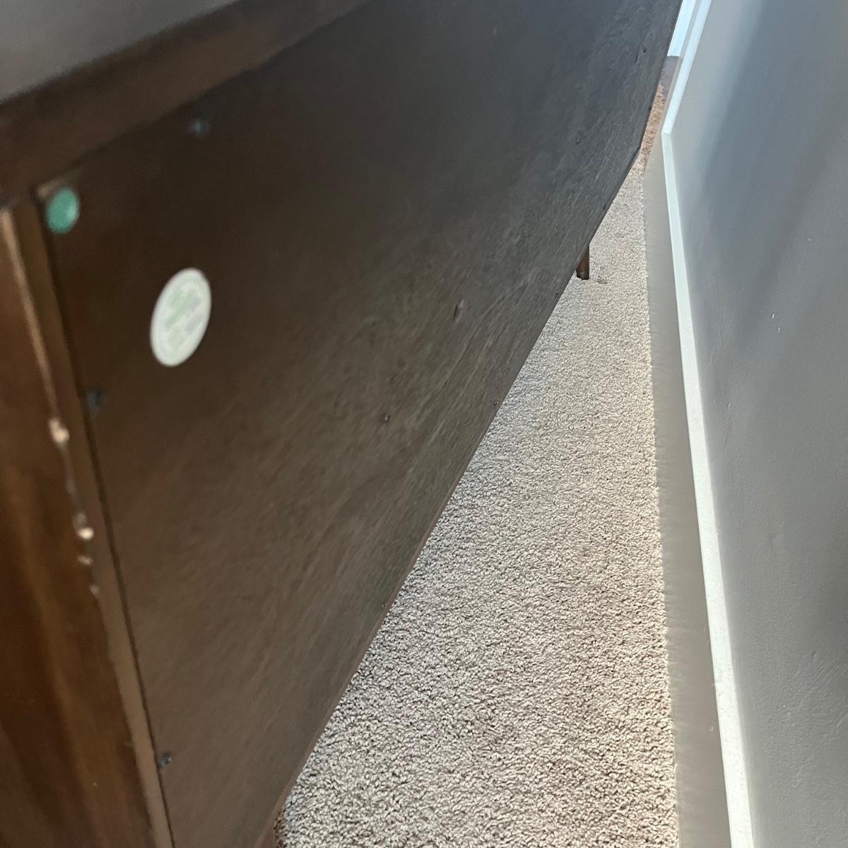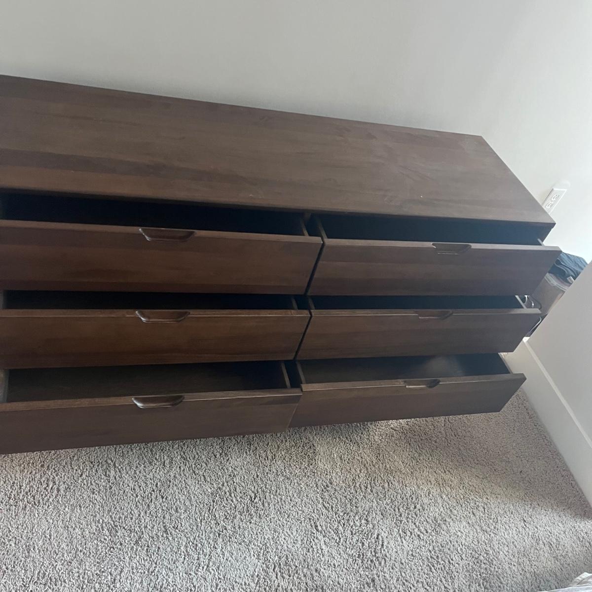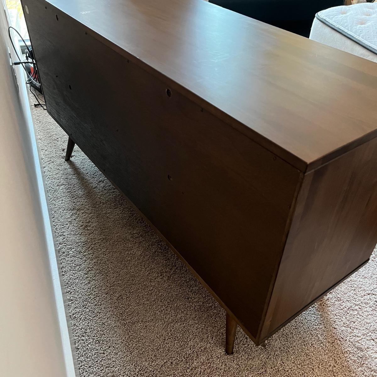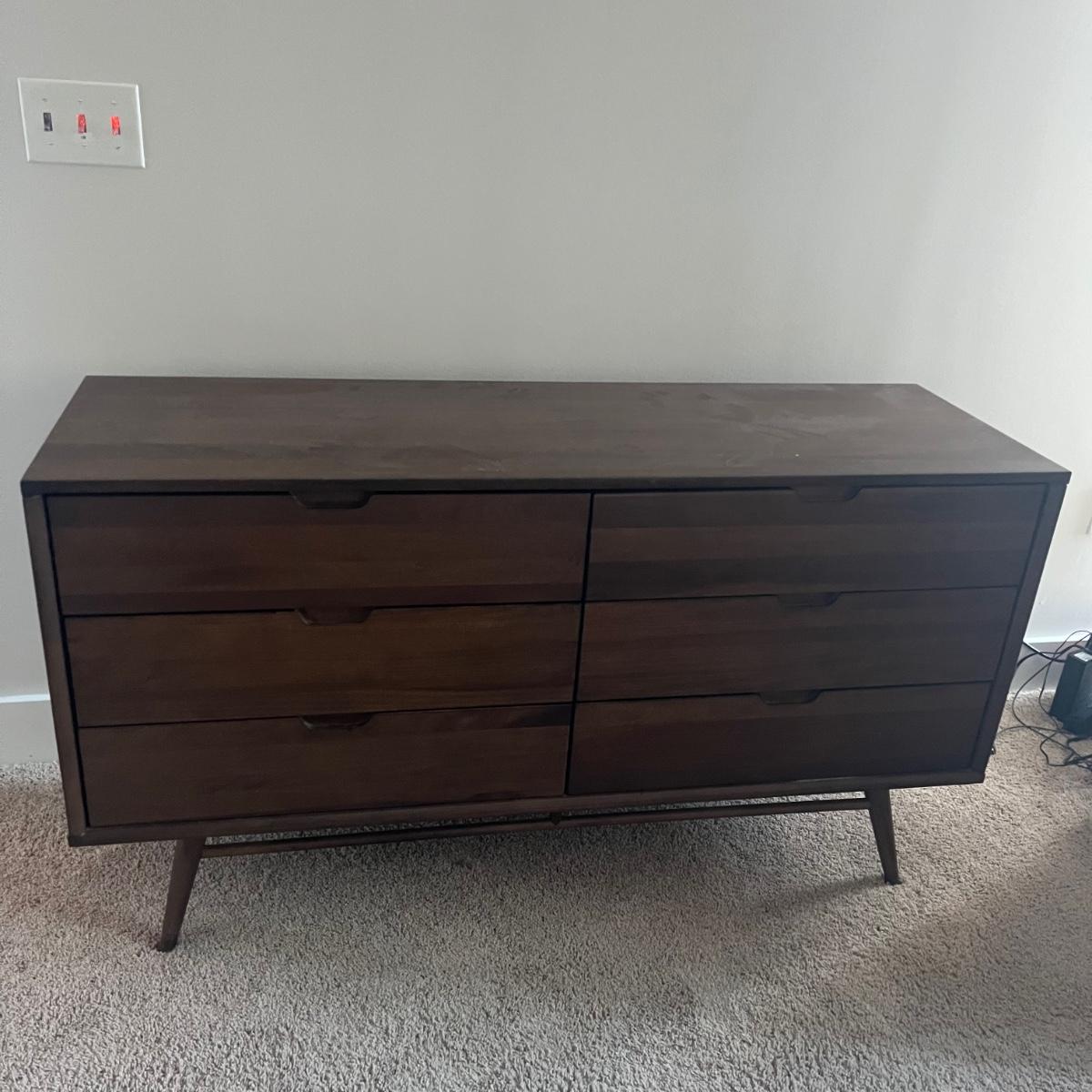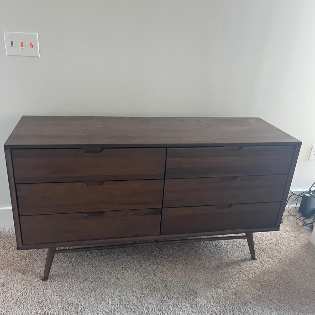 Lot includes a MCM style six drawer dresser that has brass tips on its legs. All drawers are soft close. This dresser is in very good condition. Dresser measures 17.5” x 55” x 29.5”.