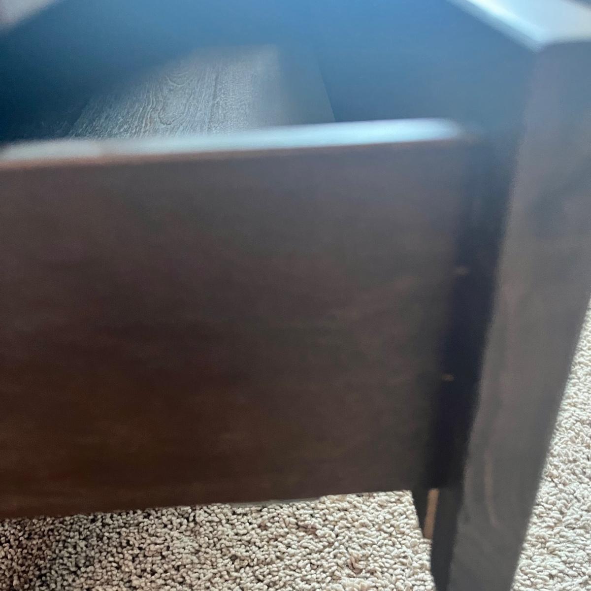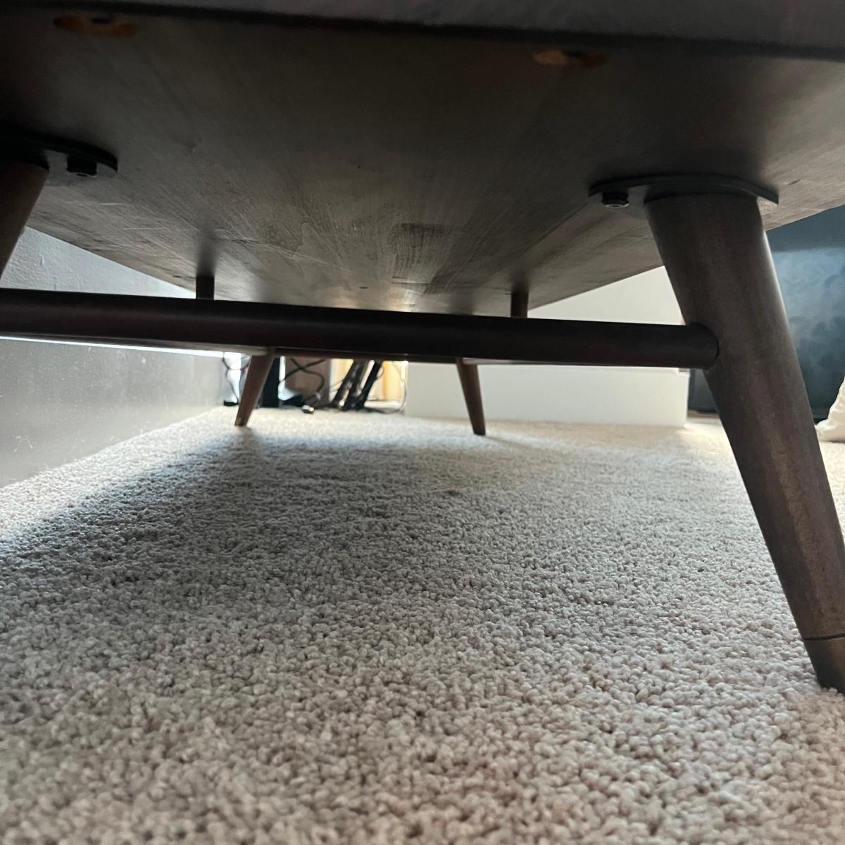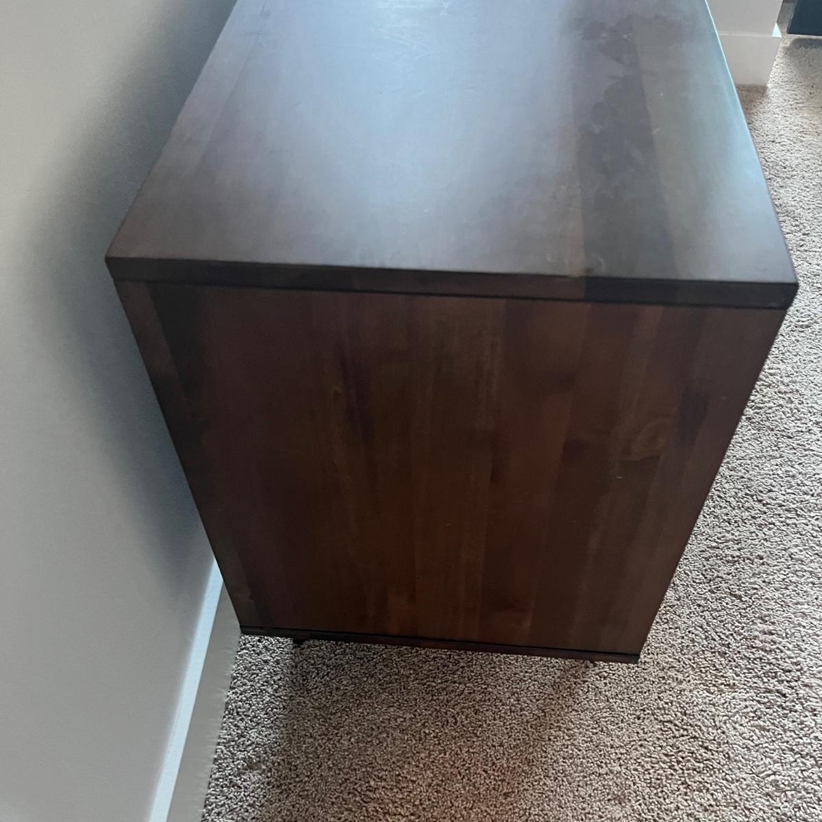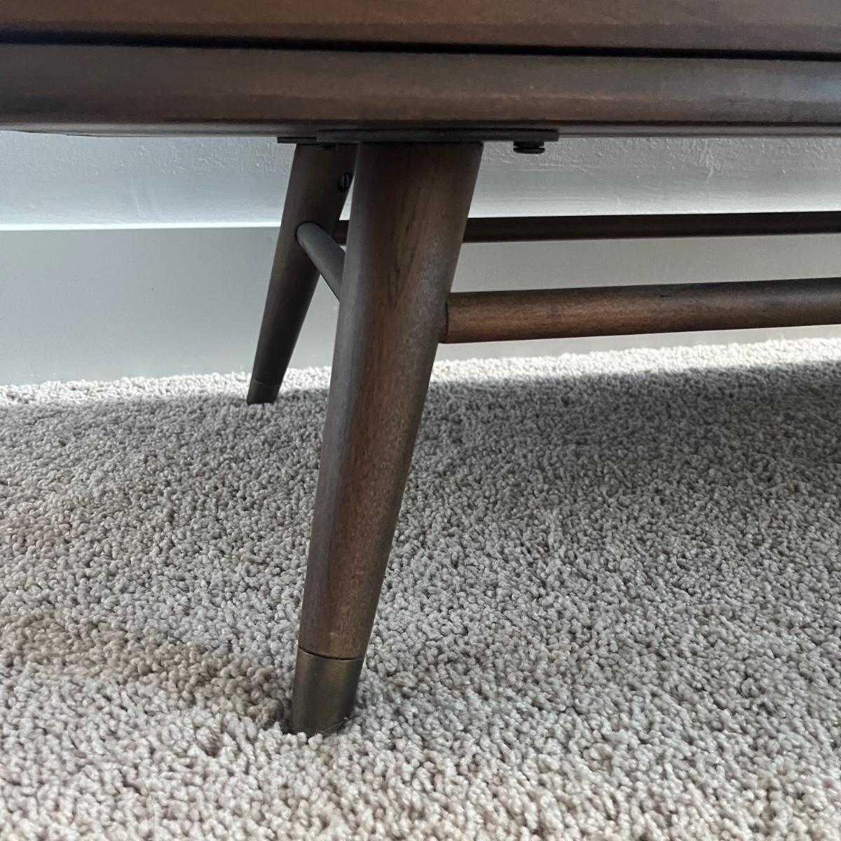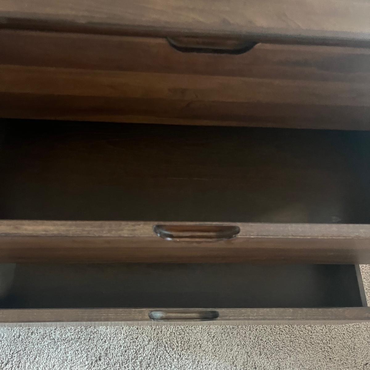 Lot includes a MCM style six drawer dresser that has brass tips on its legs. All drawers are soft close. This dresser is in very good condition. Dresser measures 17.5” x 55” x 29.5”.