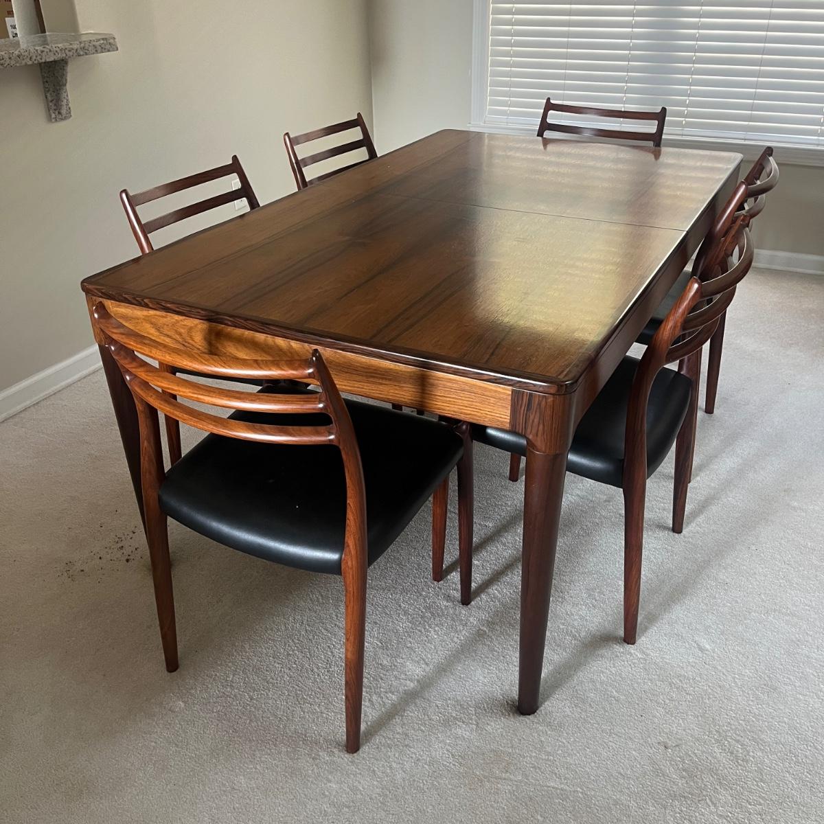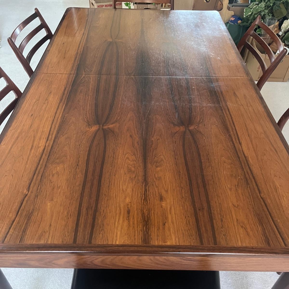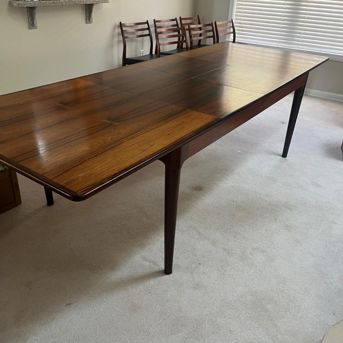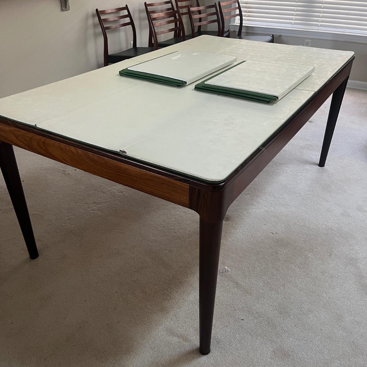 This MCM table has two hidden 20” leaves under tabletop and also includes six chairs with what appears to be padded leather seats. Owner states that item is Swedish rosewood. Table measures 108” x 39.5” x 28”H with both leaves and 66” x 39.5” x 28”H without leaves. Chairs measure 19” x 20” x 31.5”H with a 18” seat height. Also includes padded top for protecting table. One chair has indents in seat, see pictures.