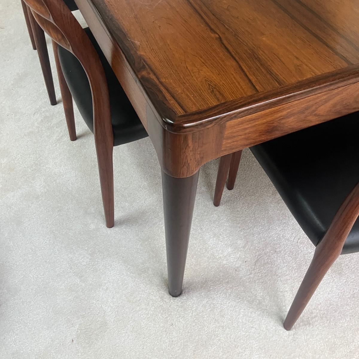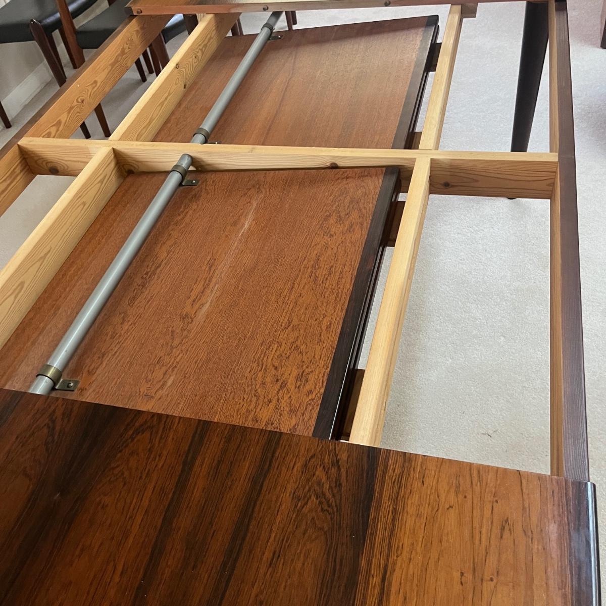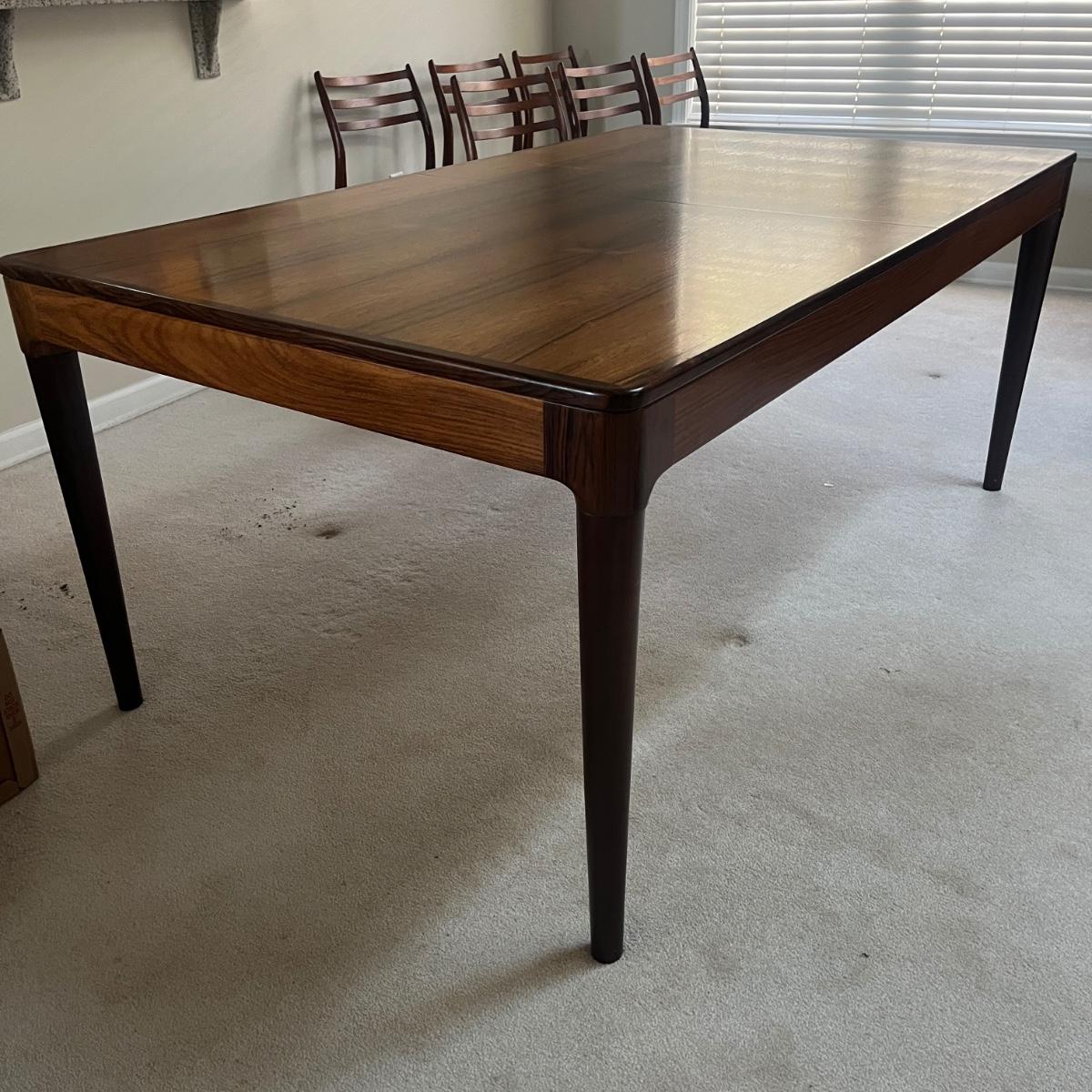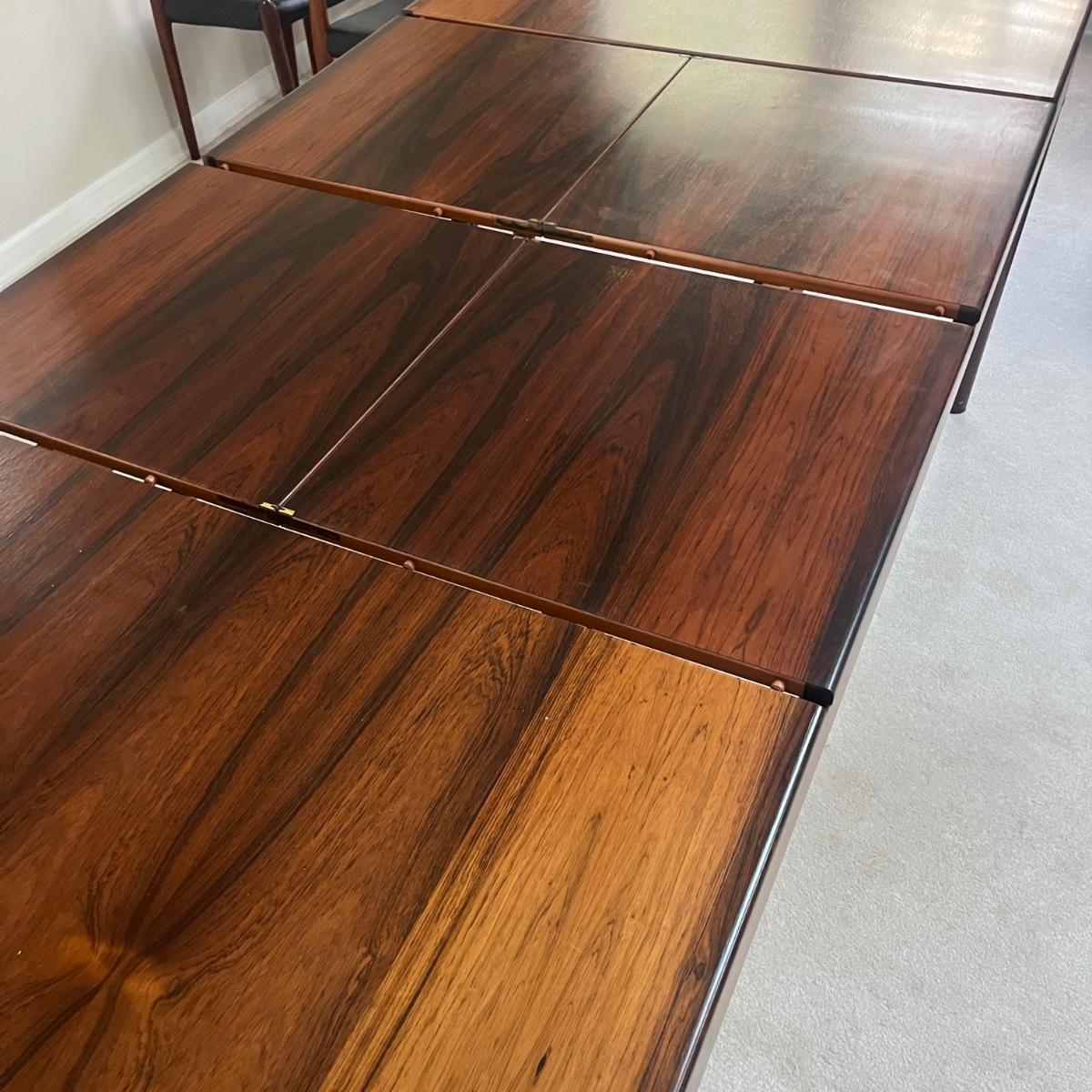This MCM table has two hidden 20” leaves under tabletop and also includes six chairs with what appears to be padded leather seats. Owner states that item is Swedish rosewood. Table measures 108” x 39.5” x 28”H with both leaves and 66” x 39.5” x 28”H without leaves. Chairs measure 19” x 20” x 31.5”H with a 18” seat height. Also includes padded top for protecting table. One chair has indents in seat, see pictures.