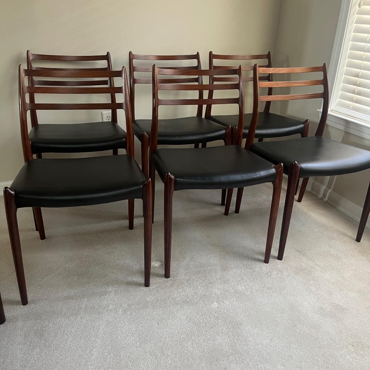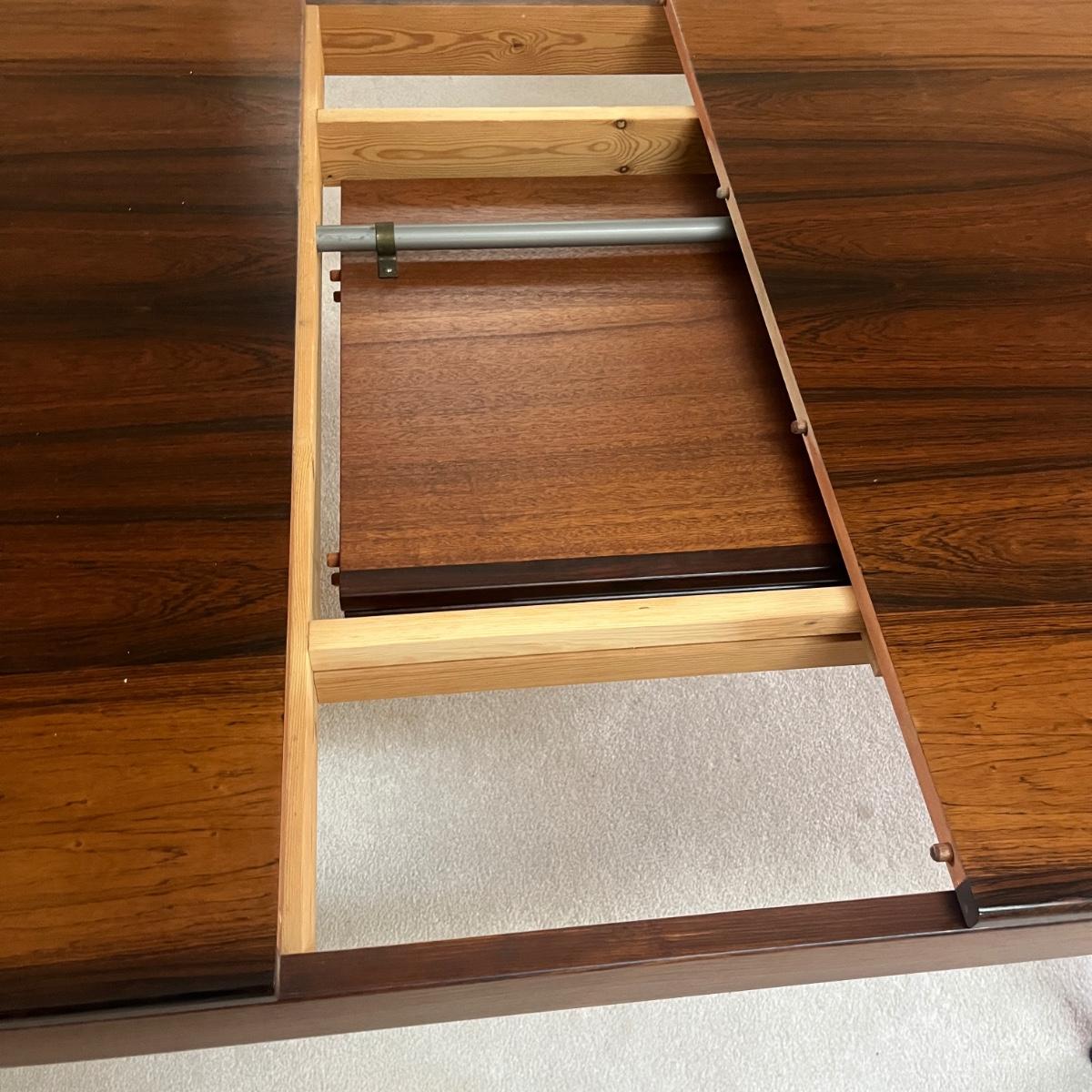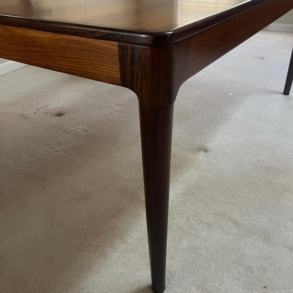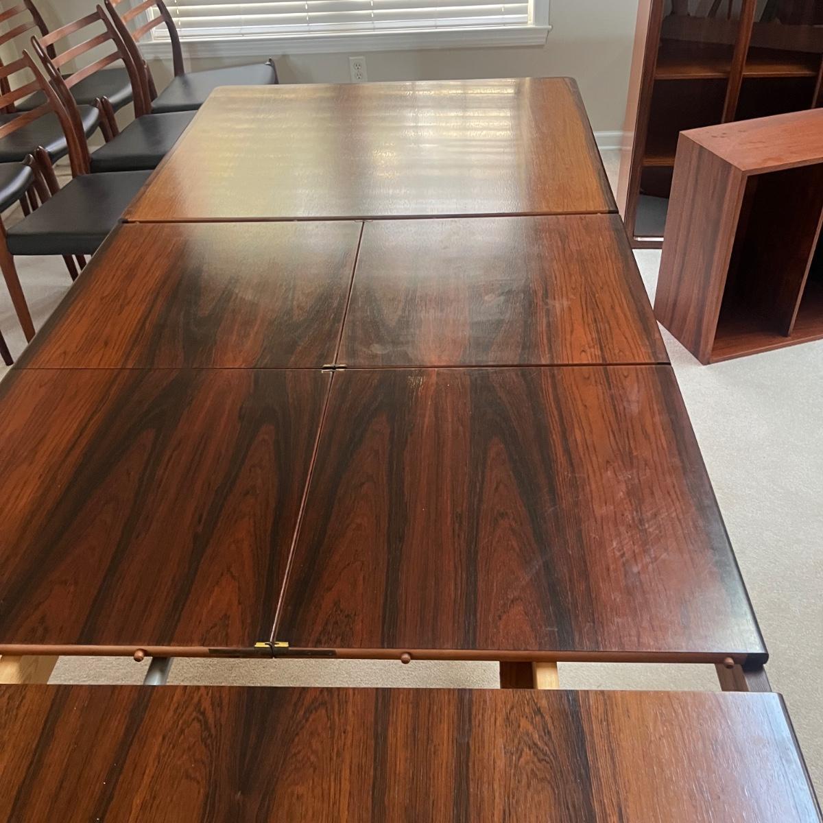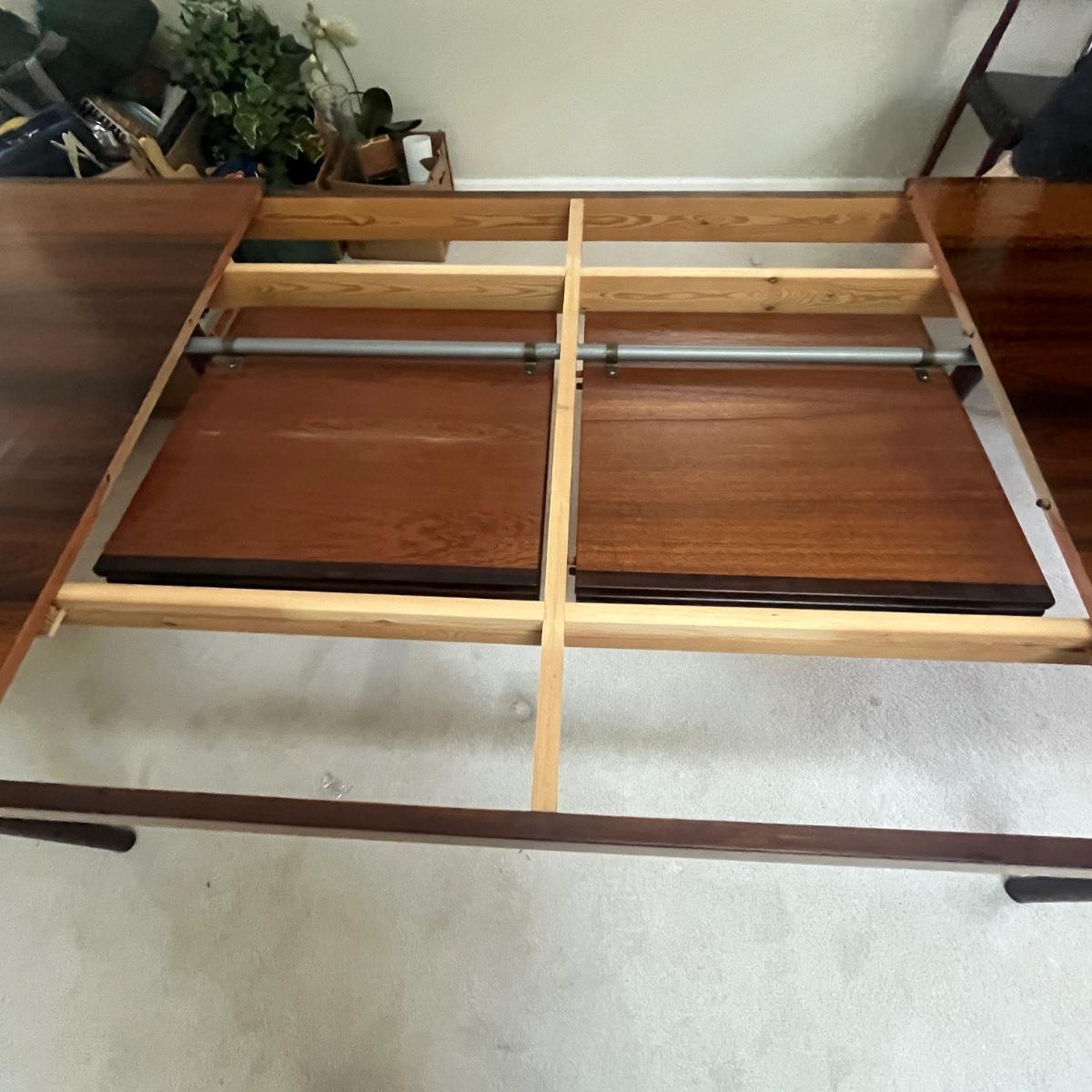 This MCM table has two hidden 20” leaves under tabletop and also includes six chairs with what appears to be padded leather seats. Owner states that item is Swedish rosewood. Table measures 108” x 39.5” x 28”H with both leaves and 66” x 39.5” x 28”H without leaves. Chairs measure 19” x 20” x 31.5”H with a 18” seat height. Also includes padded top for protecting table. One chair has indents in seat, see pictures.