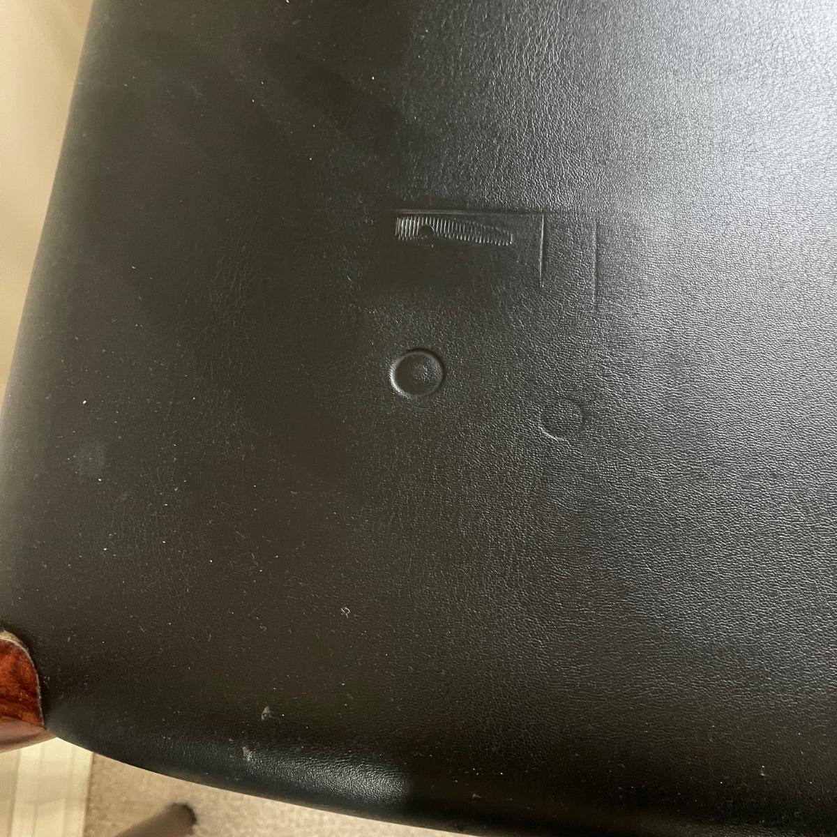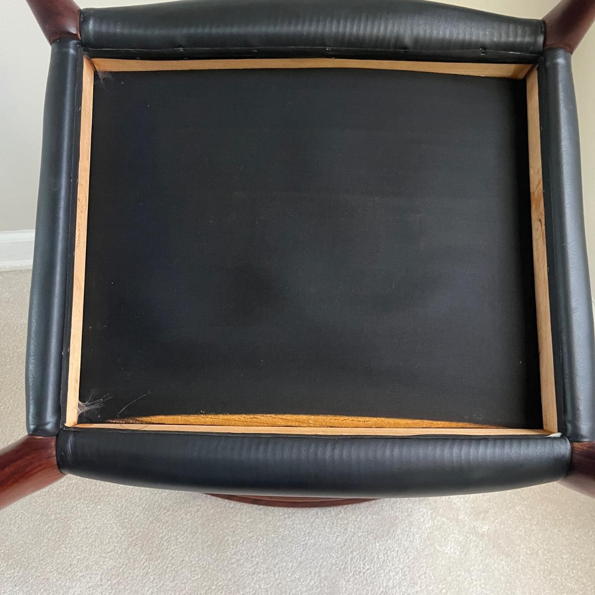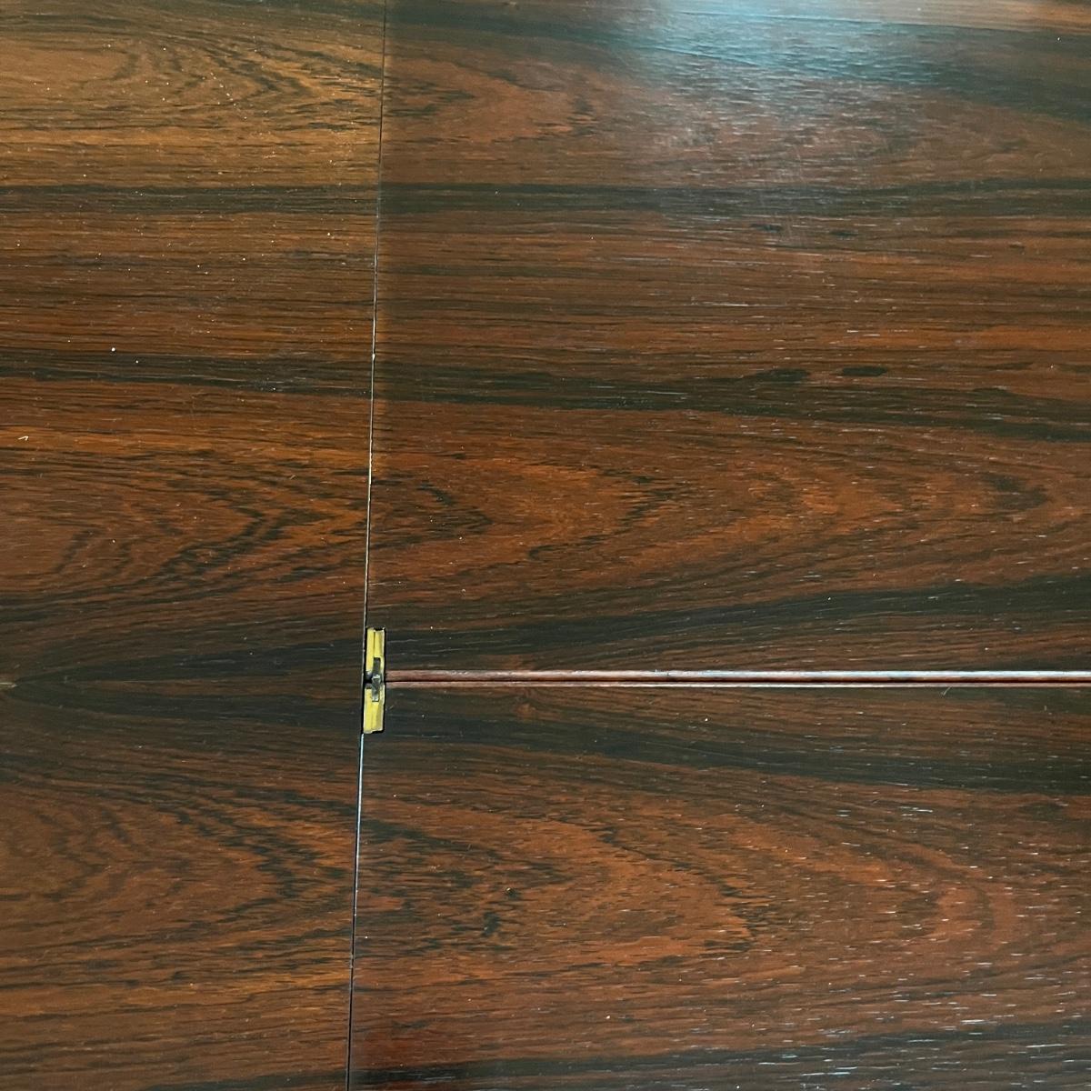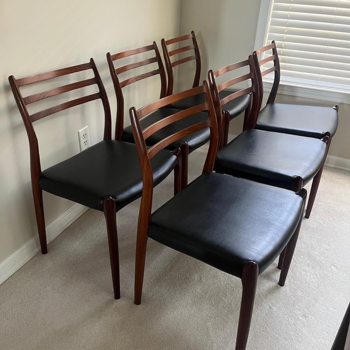 This MCM table has two hidden 20” leaves under tabletop and also includes six chairs with what appears to be padded leather seats. Owner states that item is Swedish rosewood. Table measures 108” x 39.5” x 28”H with both leaves and 66” x 39.5” x 28”H without leaves. Chairs measure 19” x 20” x 31.5”H with a 18” seat height. Also includes padded top for protecting table. One chair has indents in seat, see pictures.