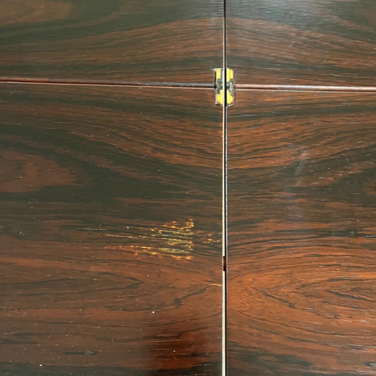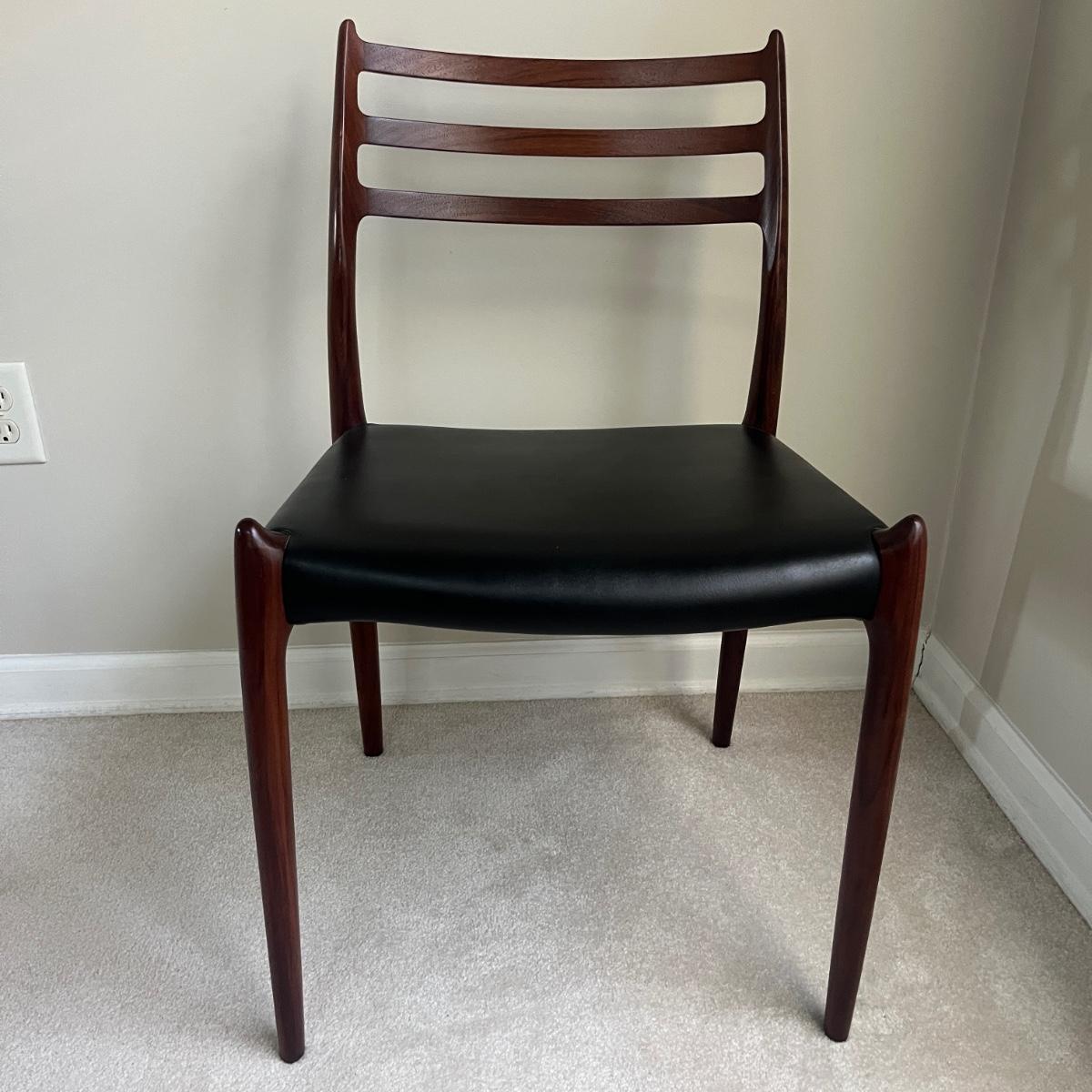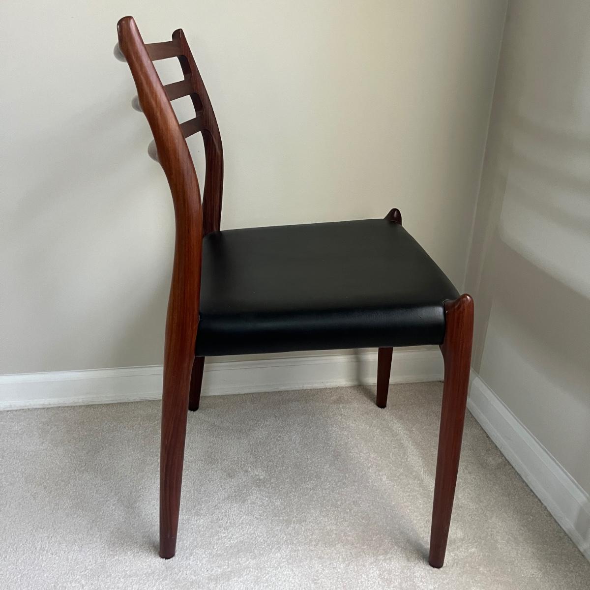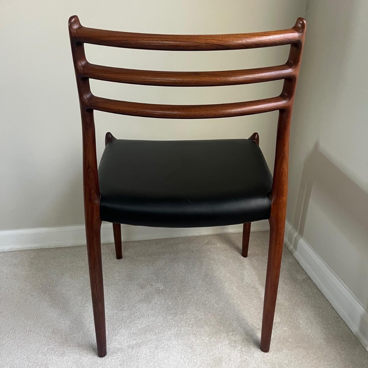 This MCM table has two hidden 20” leaves under tabletop and also includes six chairs with what appears to be padded leather seats. Owner states that item is Swedish rosewood. Table measures 108” x 39.5” x 28”H with both leaves and 66” x 39.5” x 28”H without leaves. Chairs measure 19” x 20” x 31.5”H with a 18” seat height. Also includes padded top for protecting table. One chair has indents in seat, see pictures.