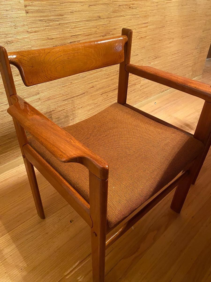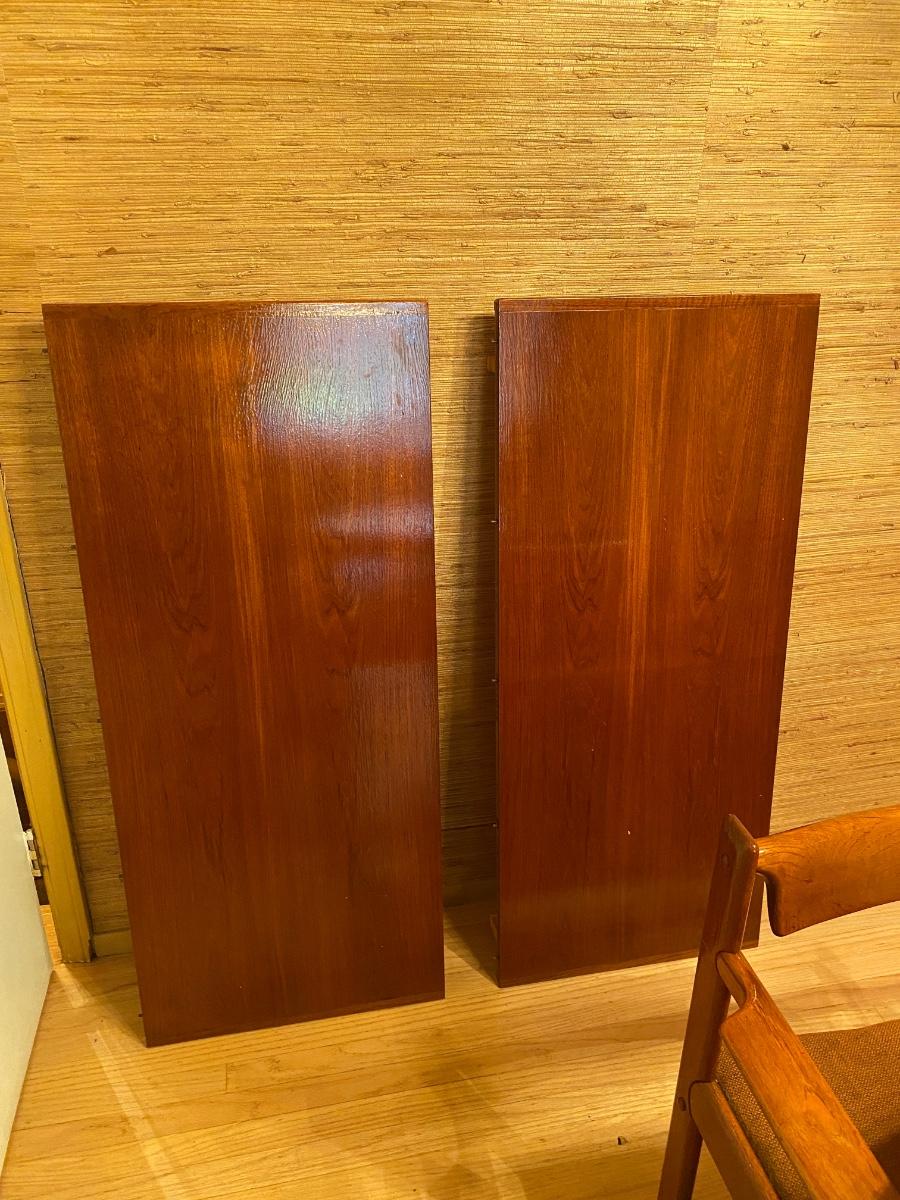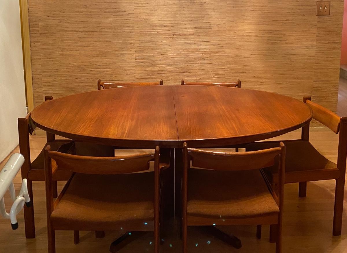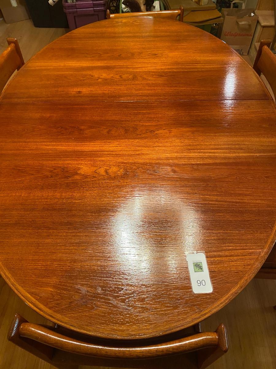 MCM Teak oval dining table with 6 chairs. Has a clear, shiny finish. One of the chairs is broken . Table 68" x 45" x 28.5"