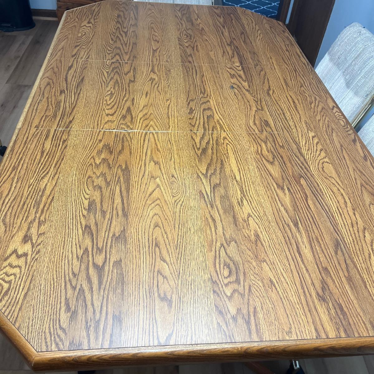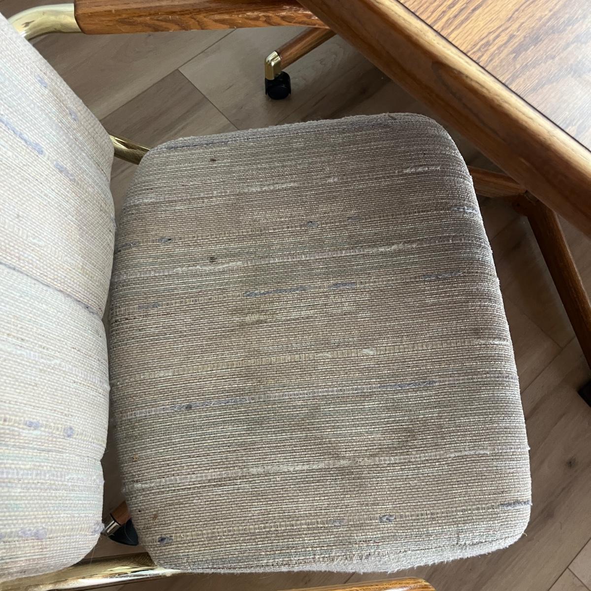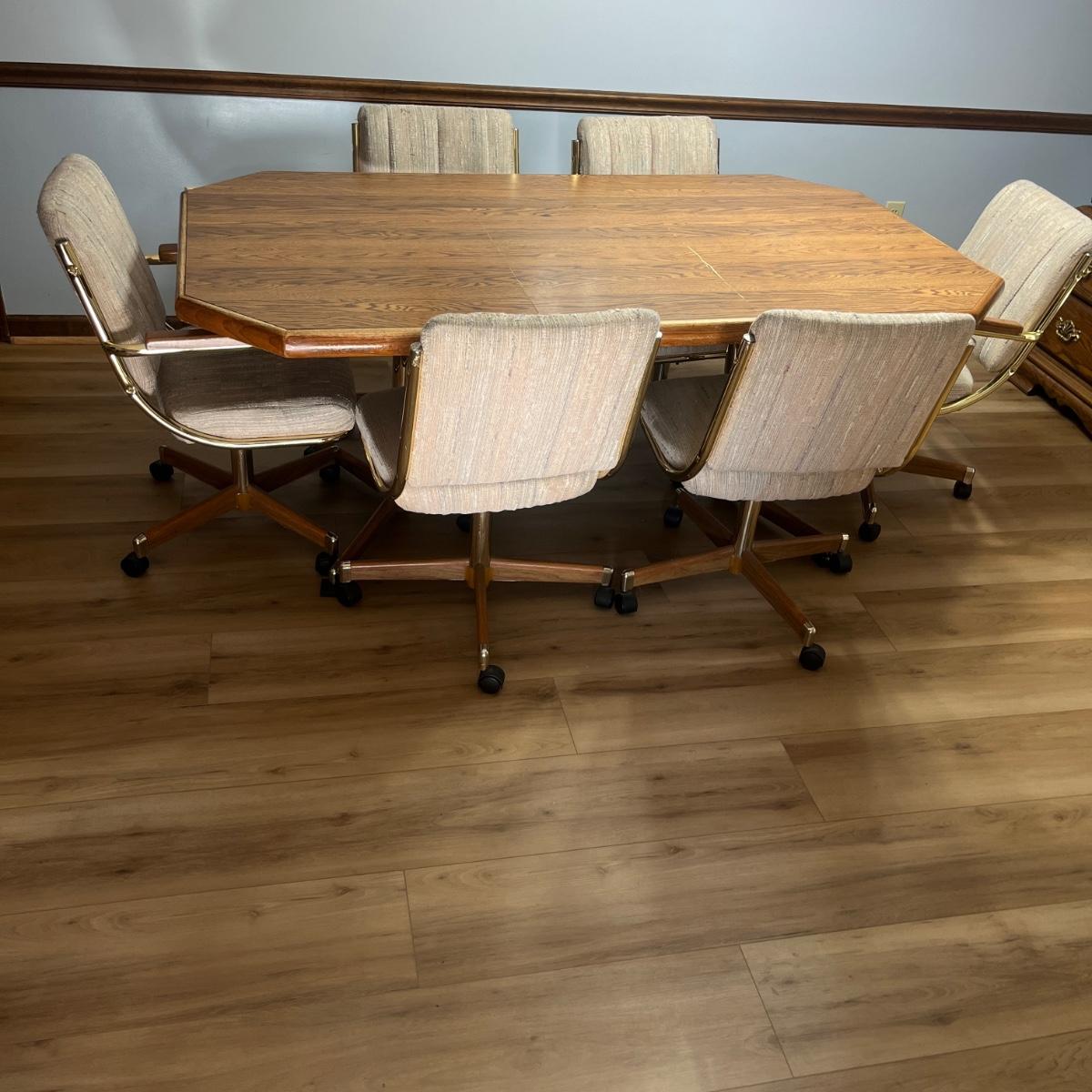 This Mid-Century style table has a laminate top with wood edges and one 17.5” leaf. Also includes six rolling chairs with padded and upholstered seats and backs. Table with leaf measures 71” x 42” x 29”H and chairs measure 19” x 23” x 33”H with an 18.5” seat height. Table has wear along the top where the leaf fits in and chairs have stains on some seats, see pictures.