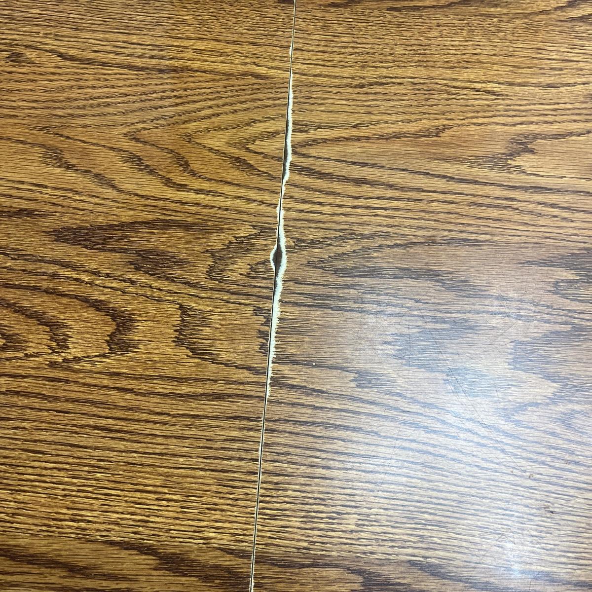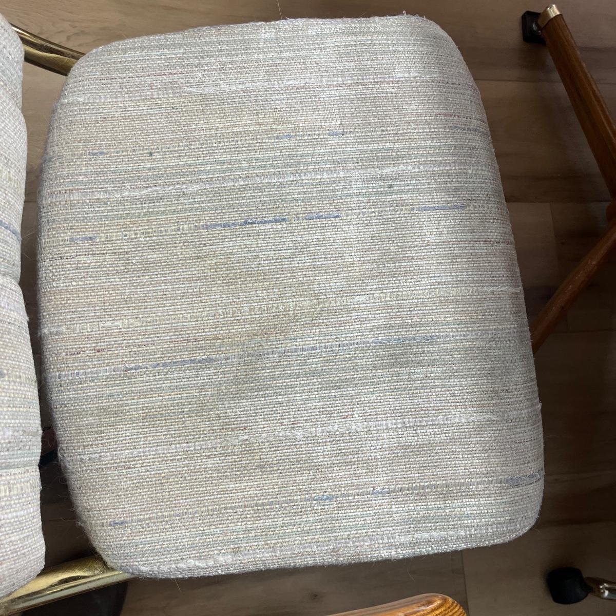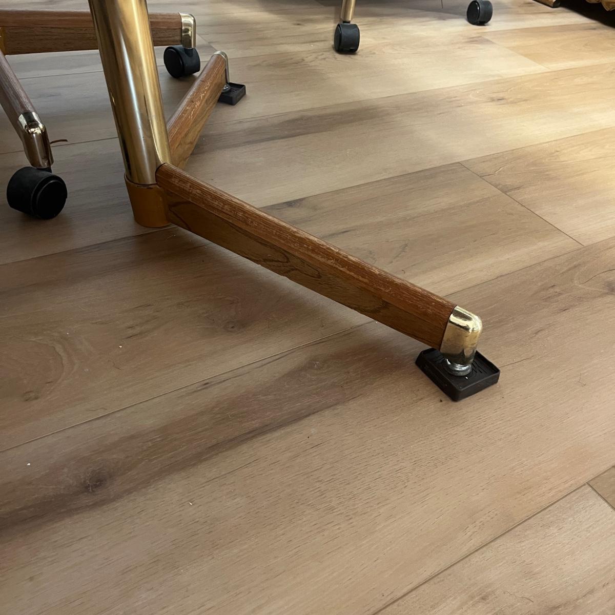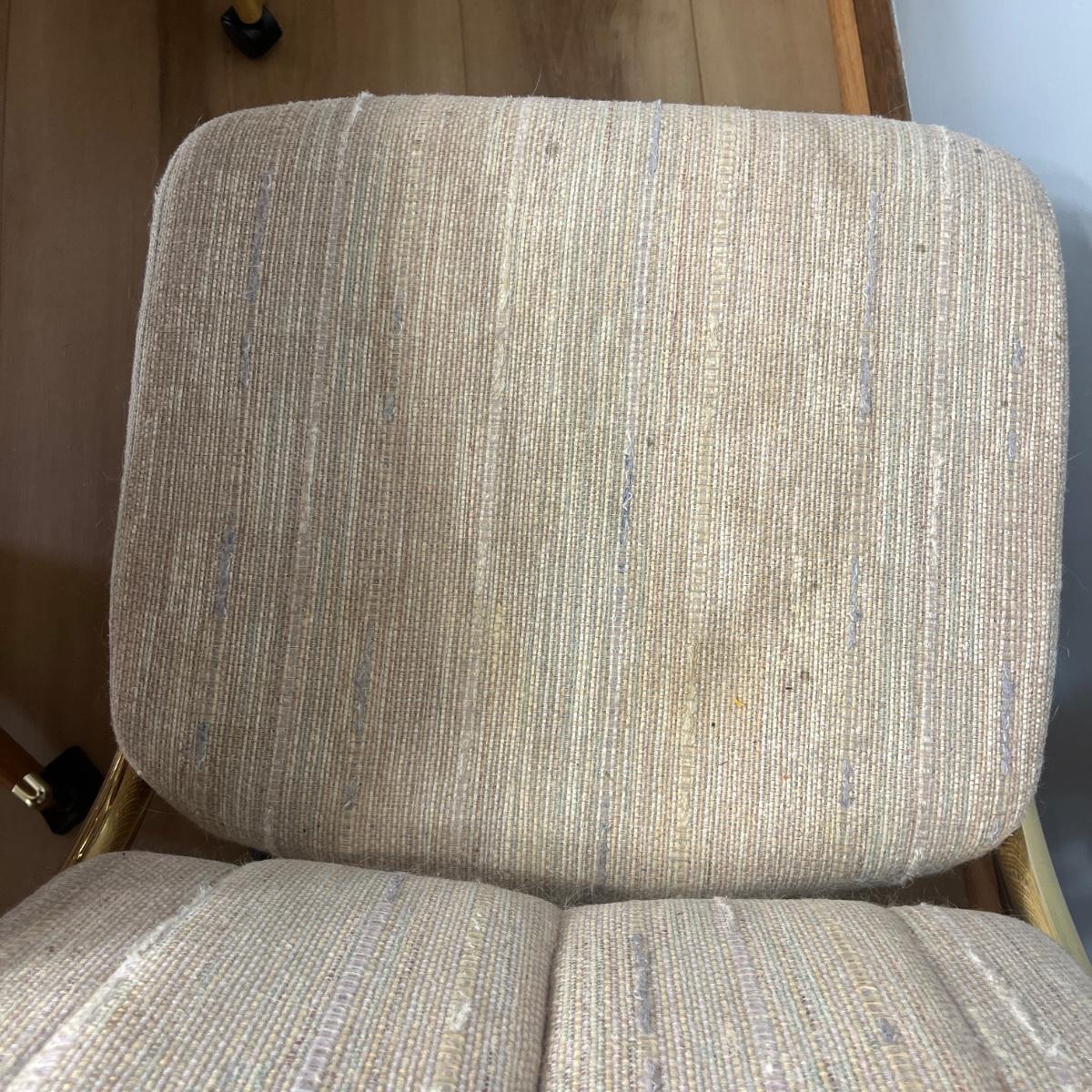 This Mid-Century style table has a laminate top with wood edges and one 17.5” leaf. Also includes six rolling chairs with padded and upholstered seats and backs. Table with leaf measures 71” x 42” x 29”H and chairs measure 19” x 23” x 33”H with an 18.5” seat height. Table has wear along the top where the leaf fits in and chairs have stains on some seats, see pictures.
