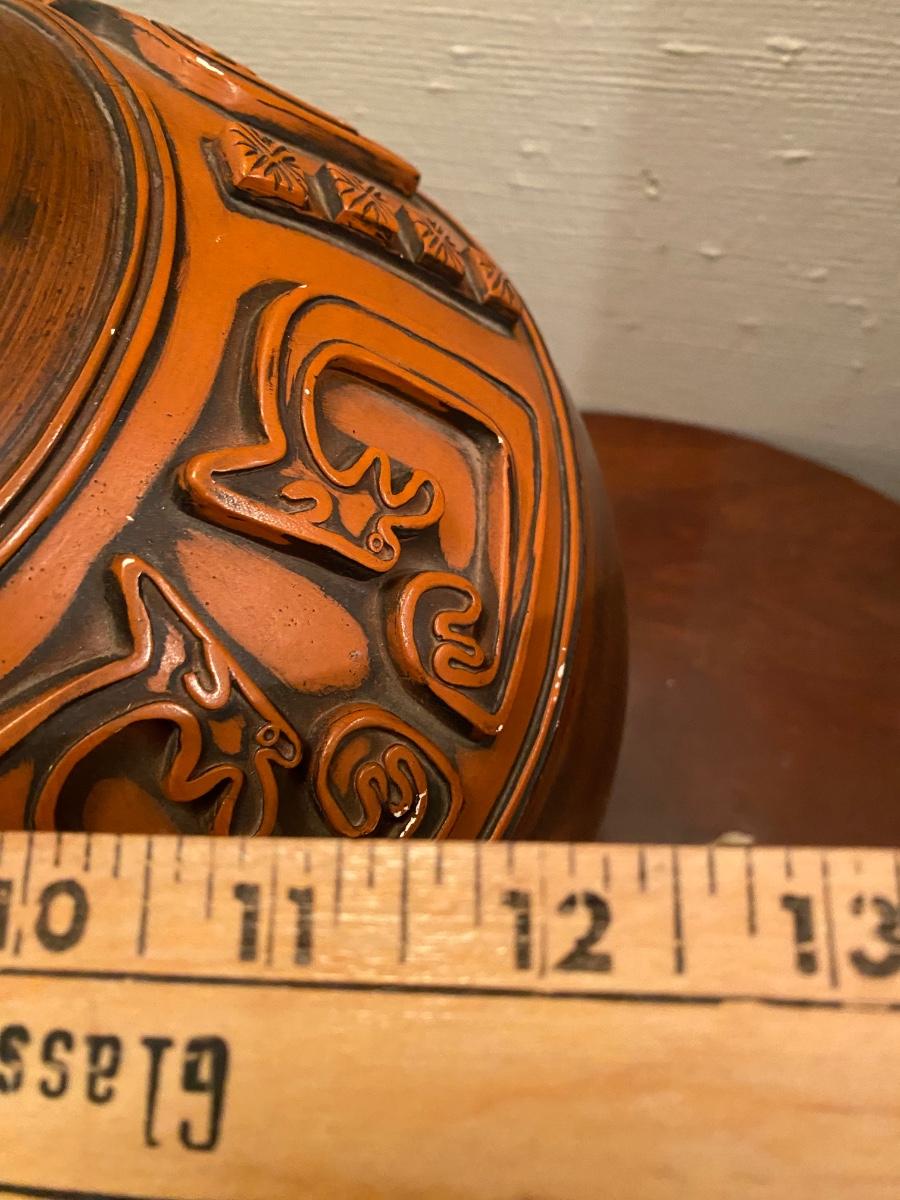 45" table lamp with torch light, unique design on clay base. Some wear on base, but no cracks. Base approx 12" wideWe can throw in the ugly lamp shade if you want it!