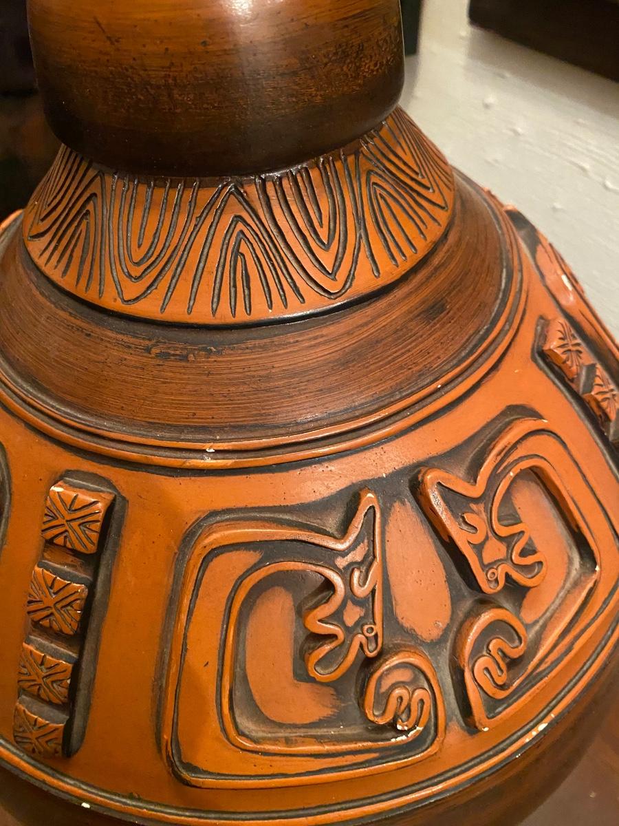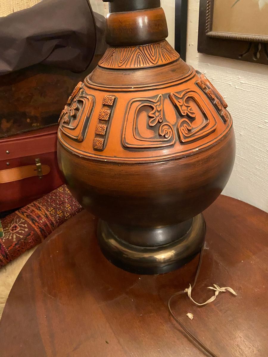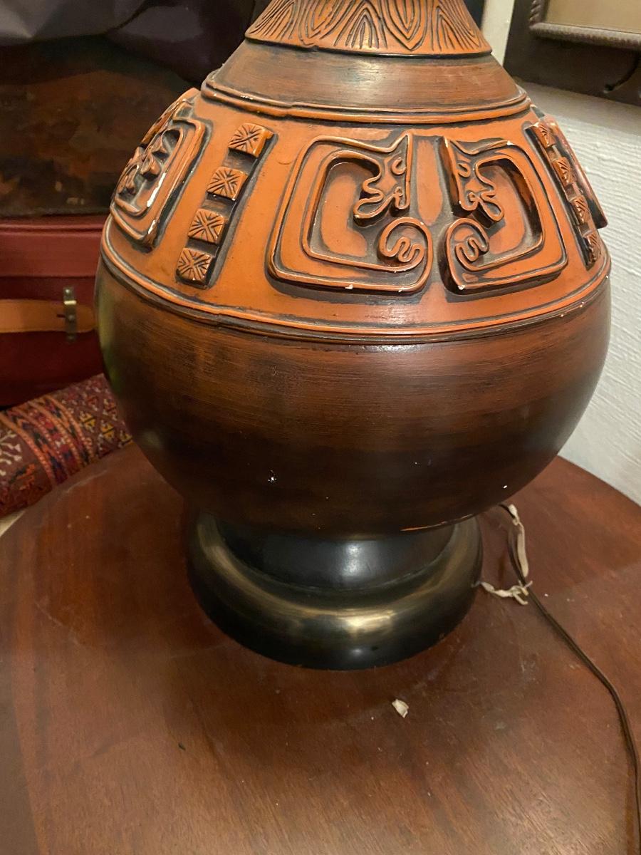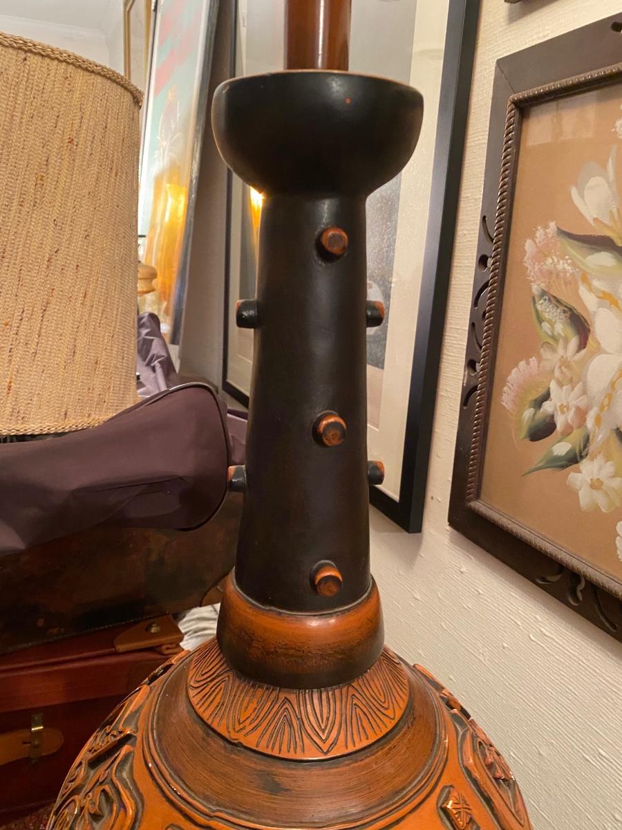 45" table lamp with torch light, unique design on clay base. Some wear on base, but no cracks. Base approx 12" wideWe can throw in the ugly lamp shade if you want it!