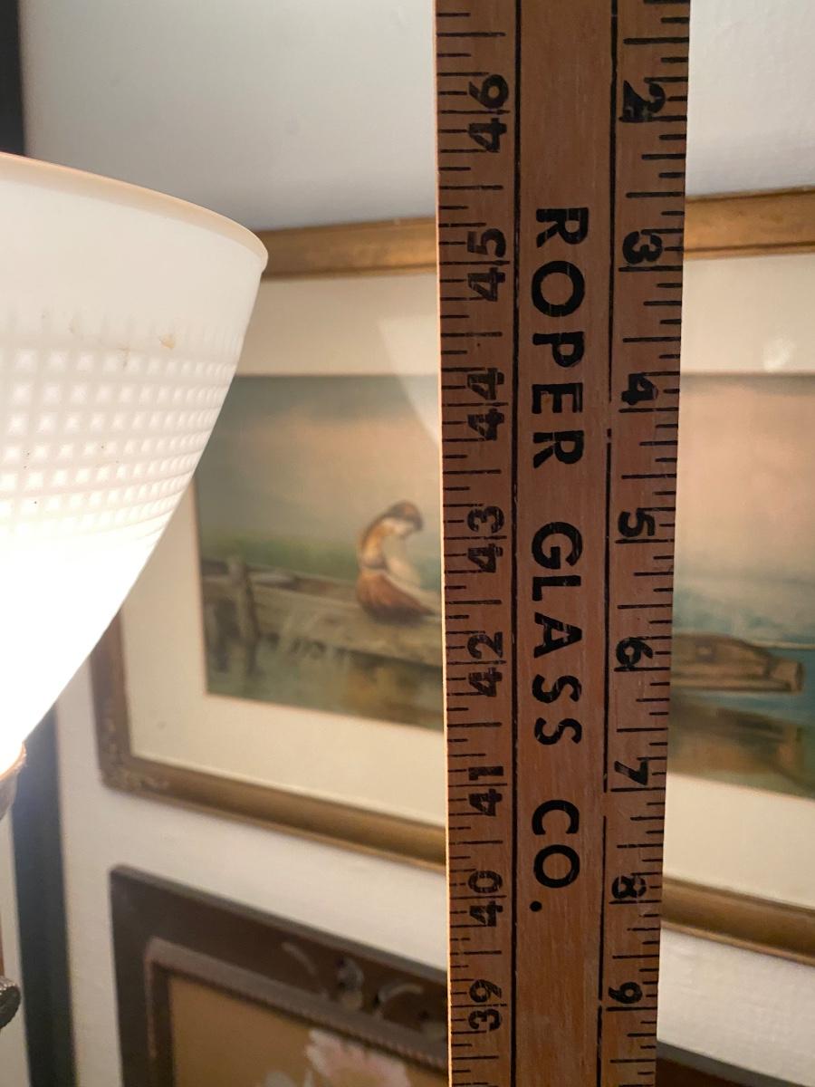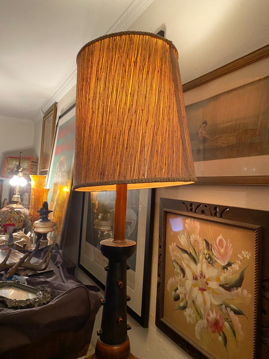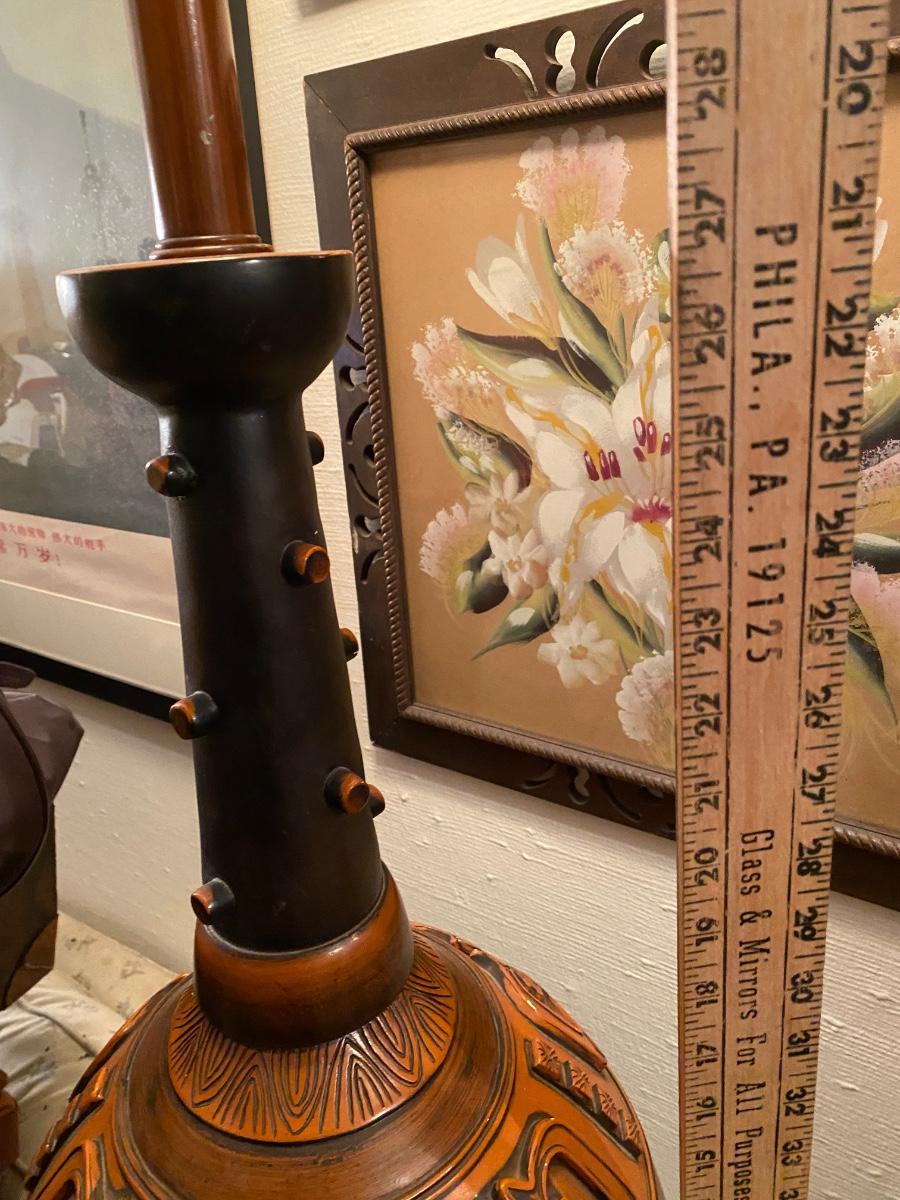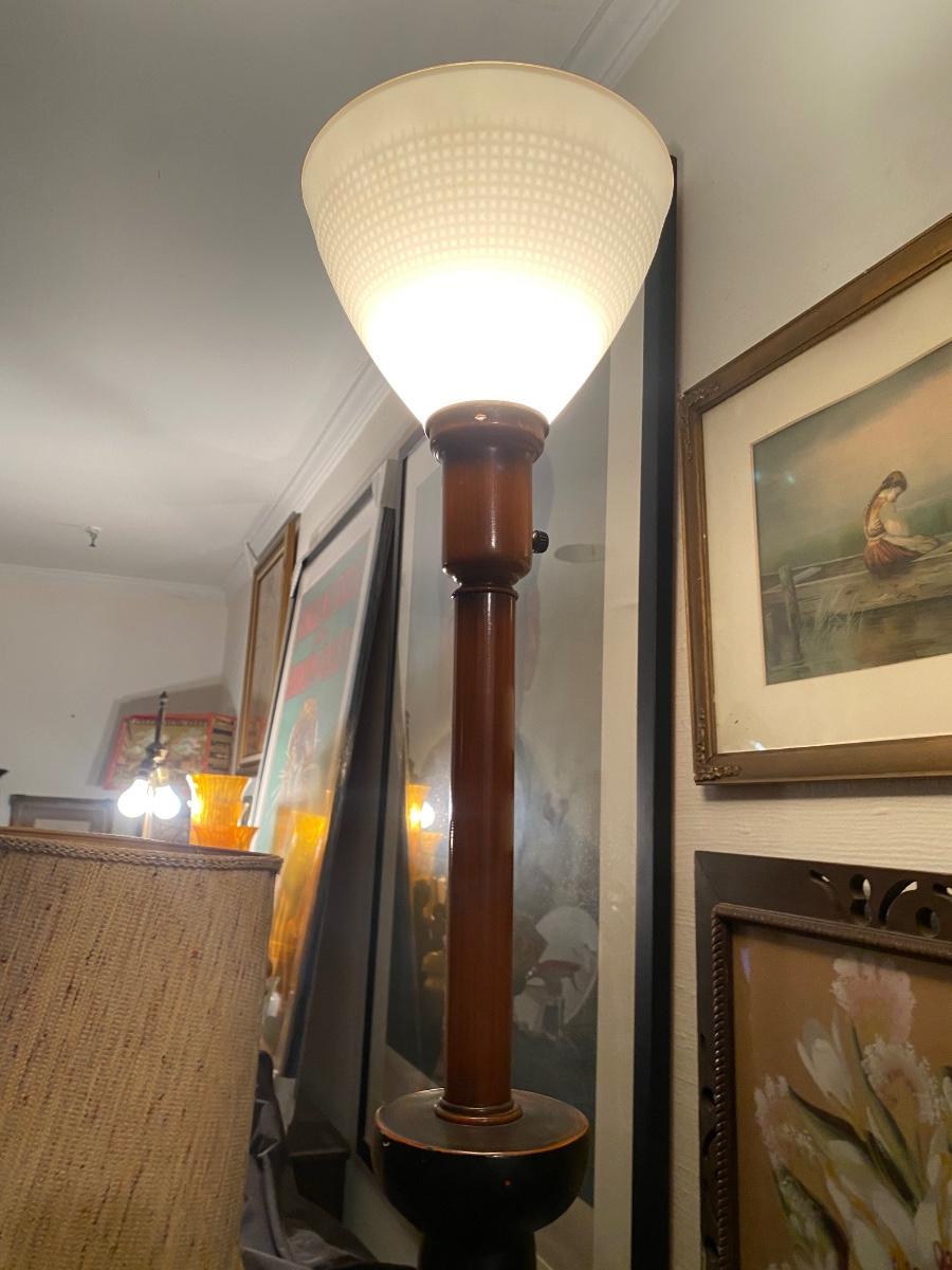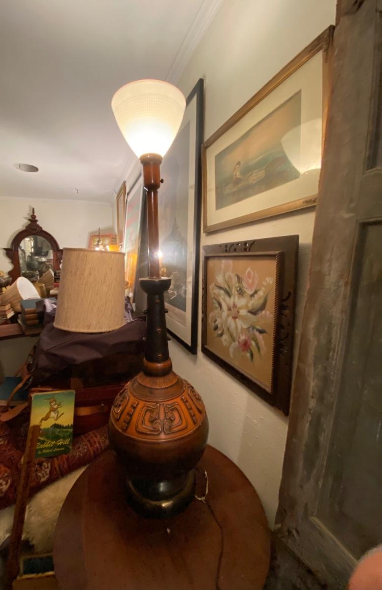 45" table lamp with torch light, unique design on clay base. Some wear on base, but no cracks. Base approx 12" wideWe can throw in the ugly lamp shade if you want it!