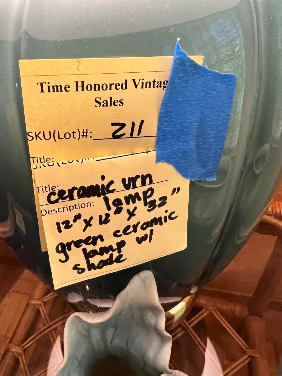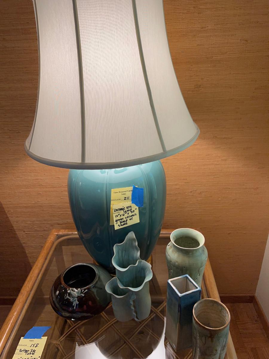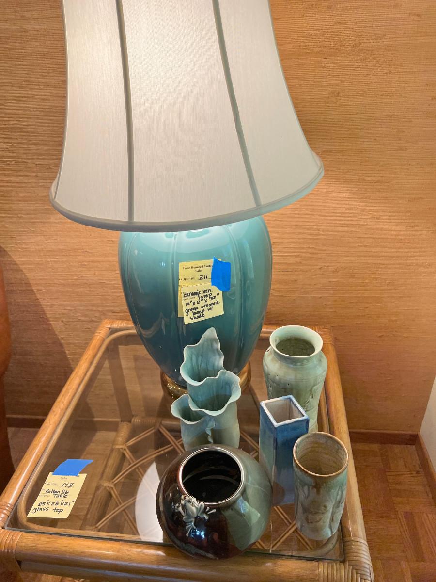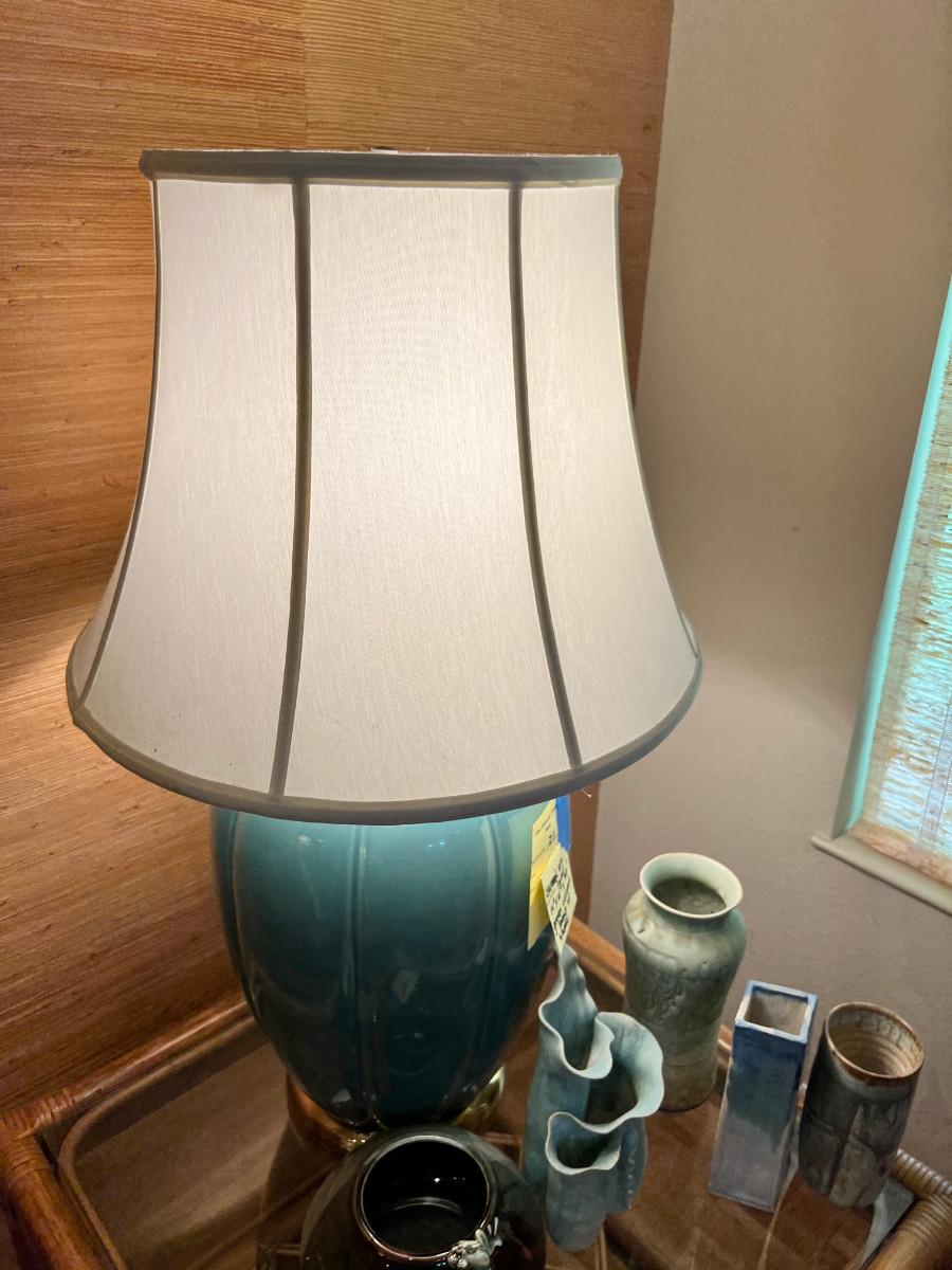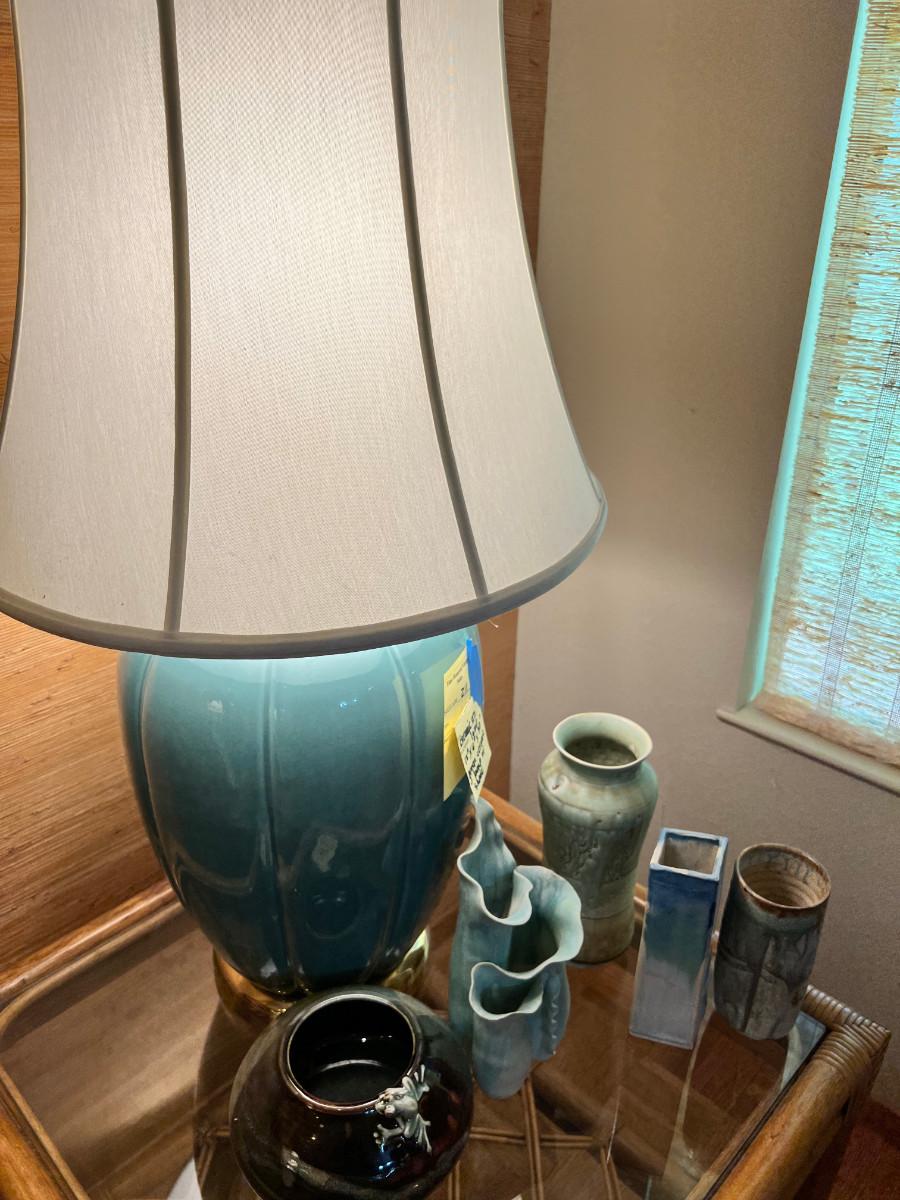 MCM Teal Ceramic gourd shape lamp 12X 12 X 32 with original shade in good condition, and 5 pieces of hand made Ceramic vases and decor.