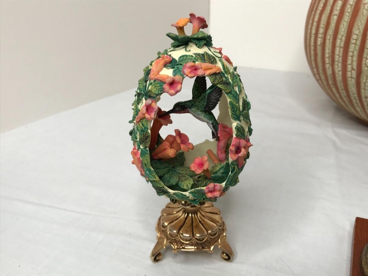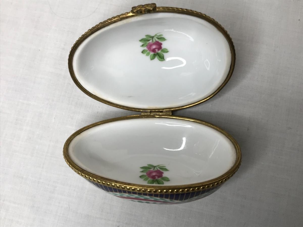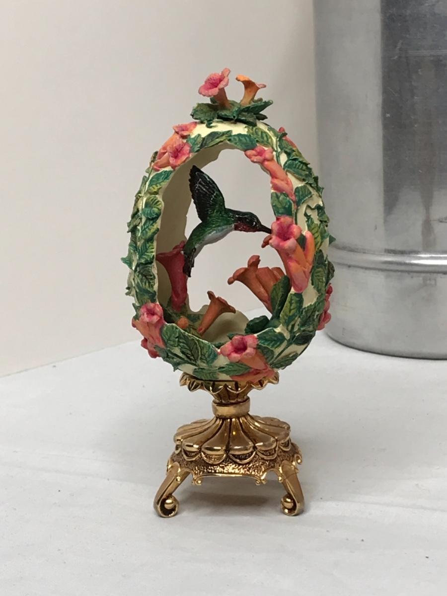 Fancy egg on brass stand opening is trimmed in metal