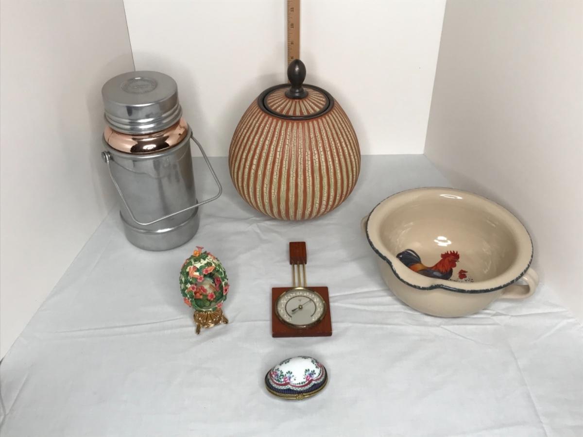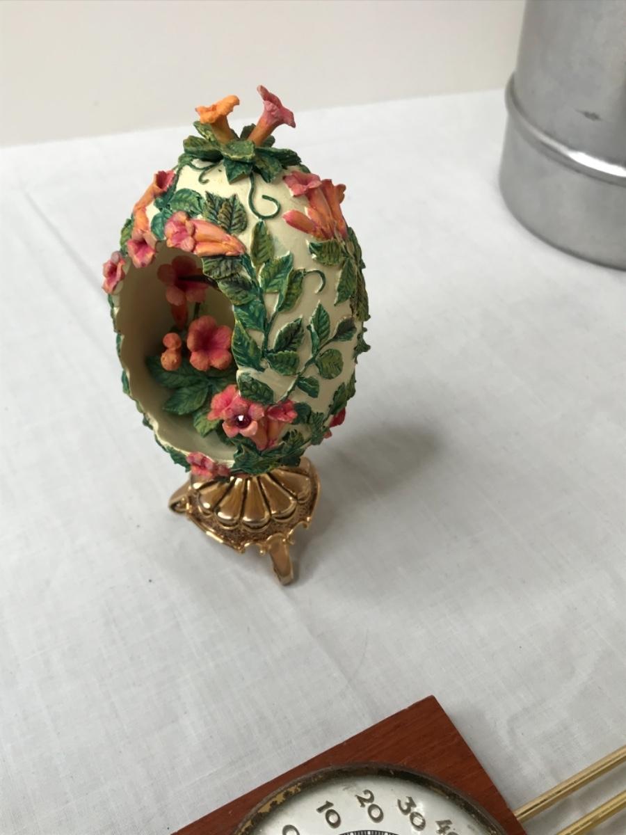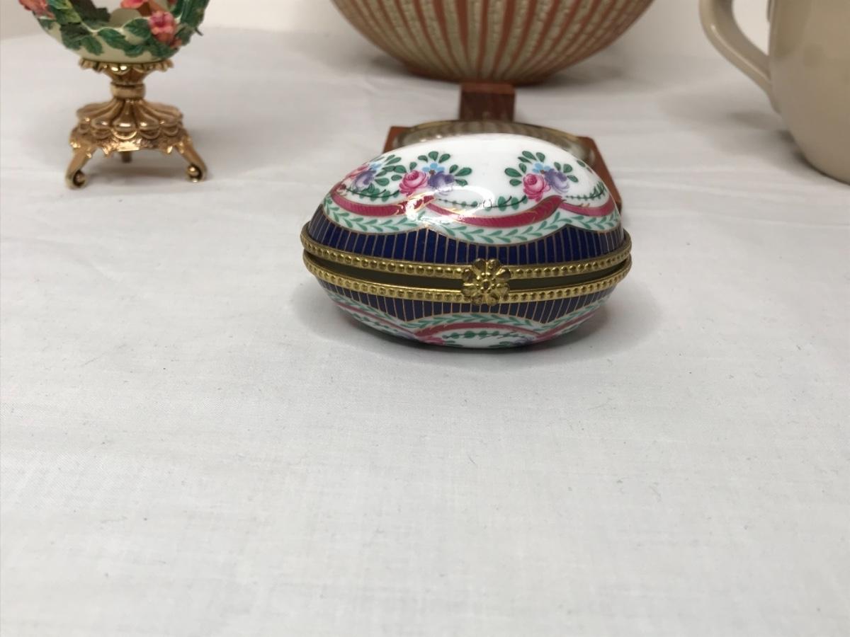 Fancy egg on brass stand opening is trimmed in metal