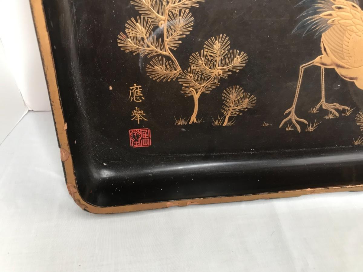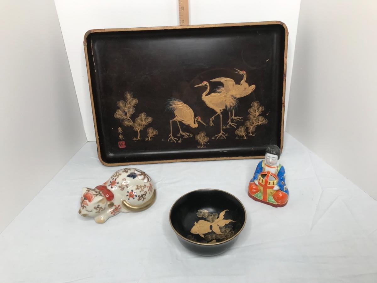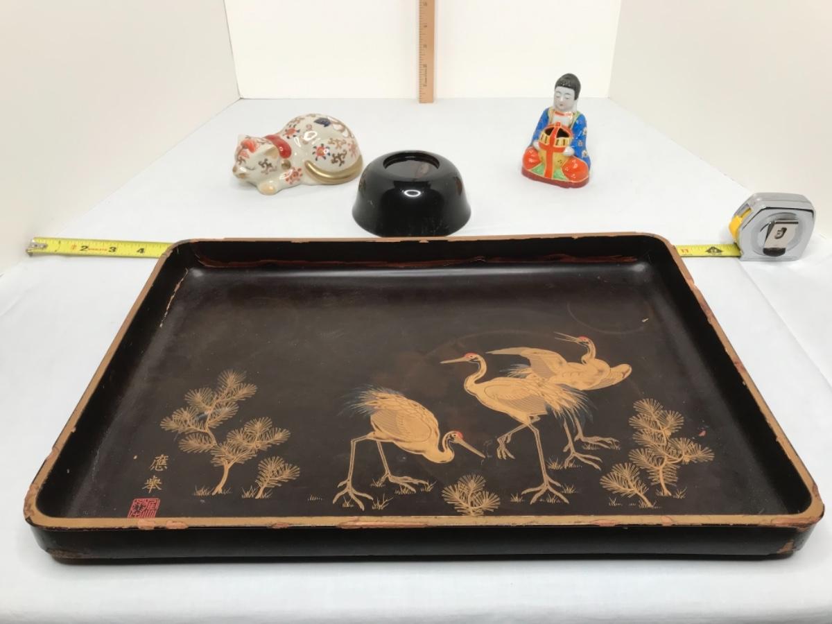MCM black lacquer tray trimmed in gold with bird scene and matching bowl with koi fish