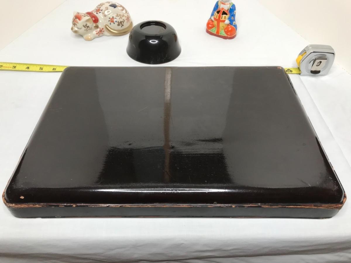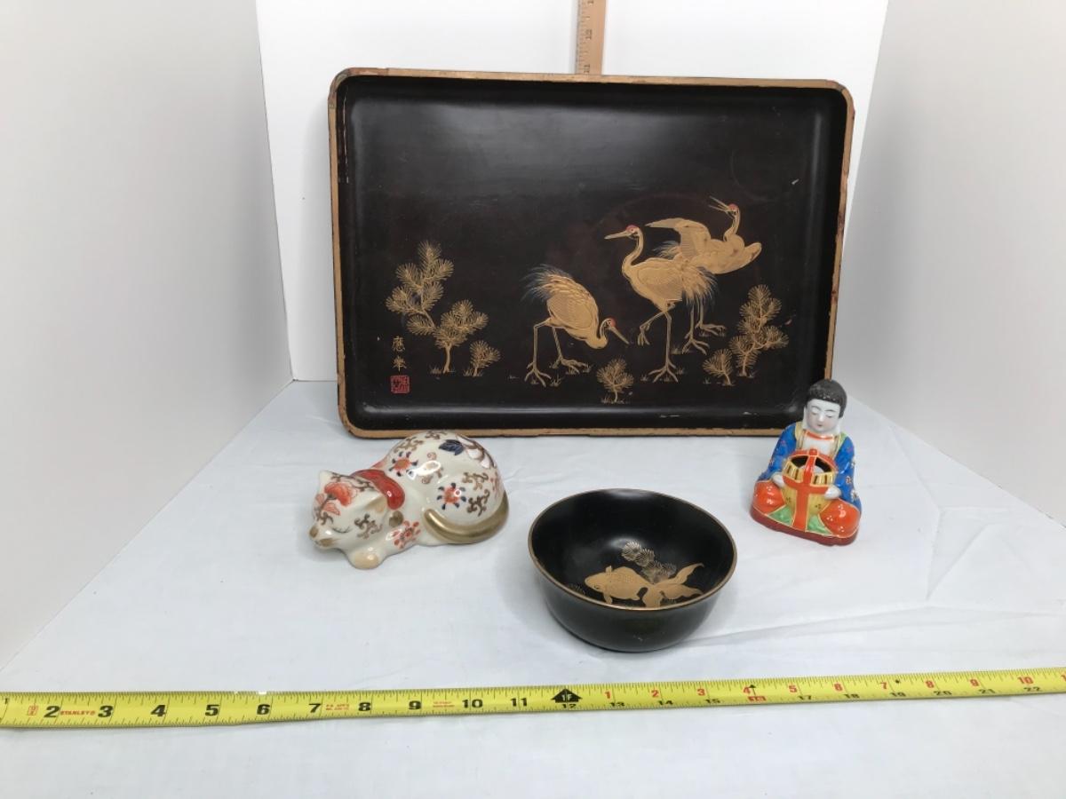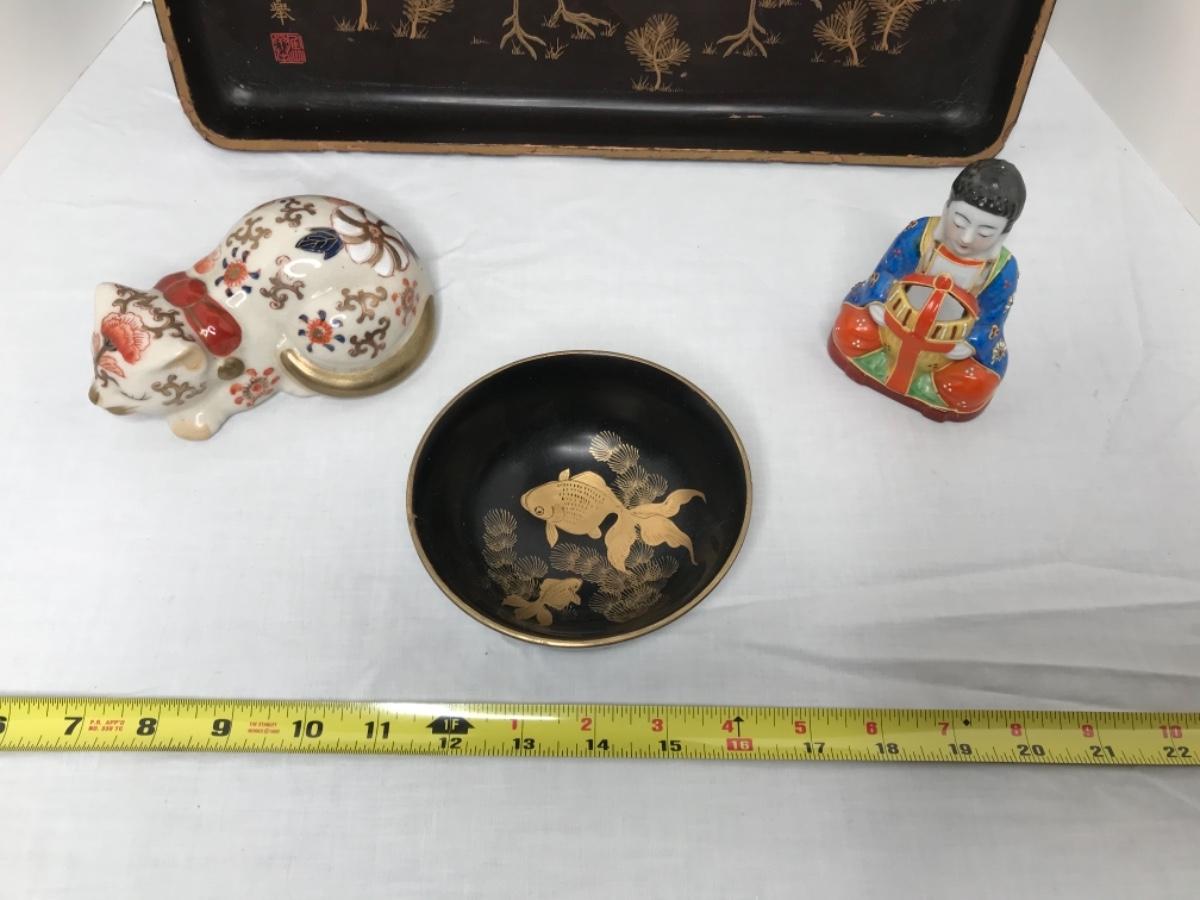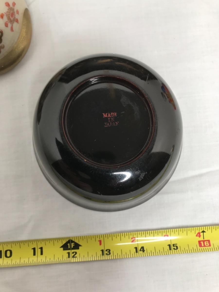 MCM black lacquer tray trimmed in gold with bird scene and matching bowl with koi fish
