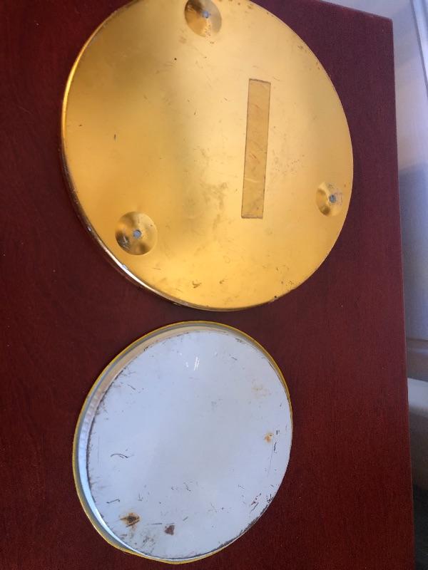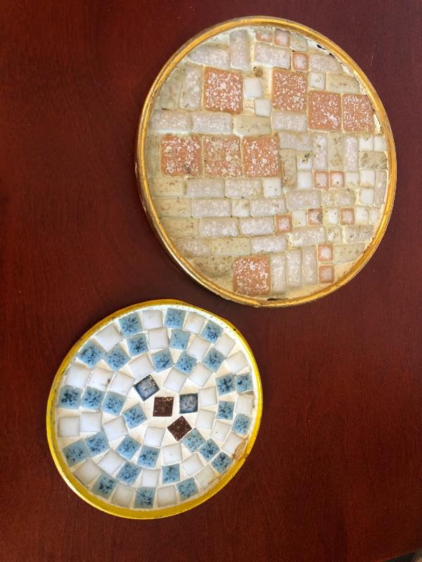 Probably made back in the 50s the larger one is 6 1/4 inches wide and the smaller one is 4 3/4 wide made with sweet little tiles one encased in just a plain metal and the other one Incase in a brassy looking metal