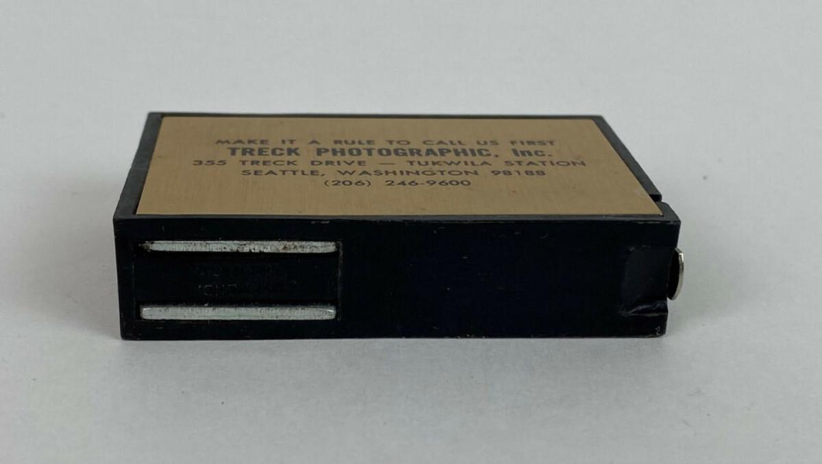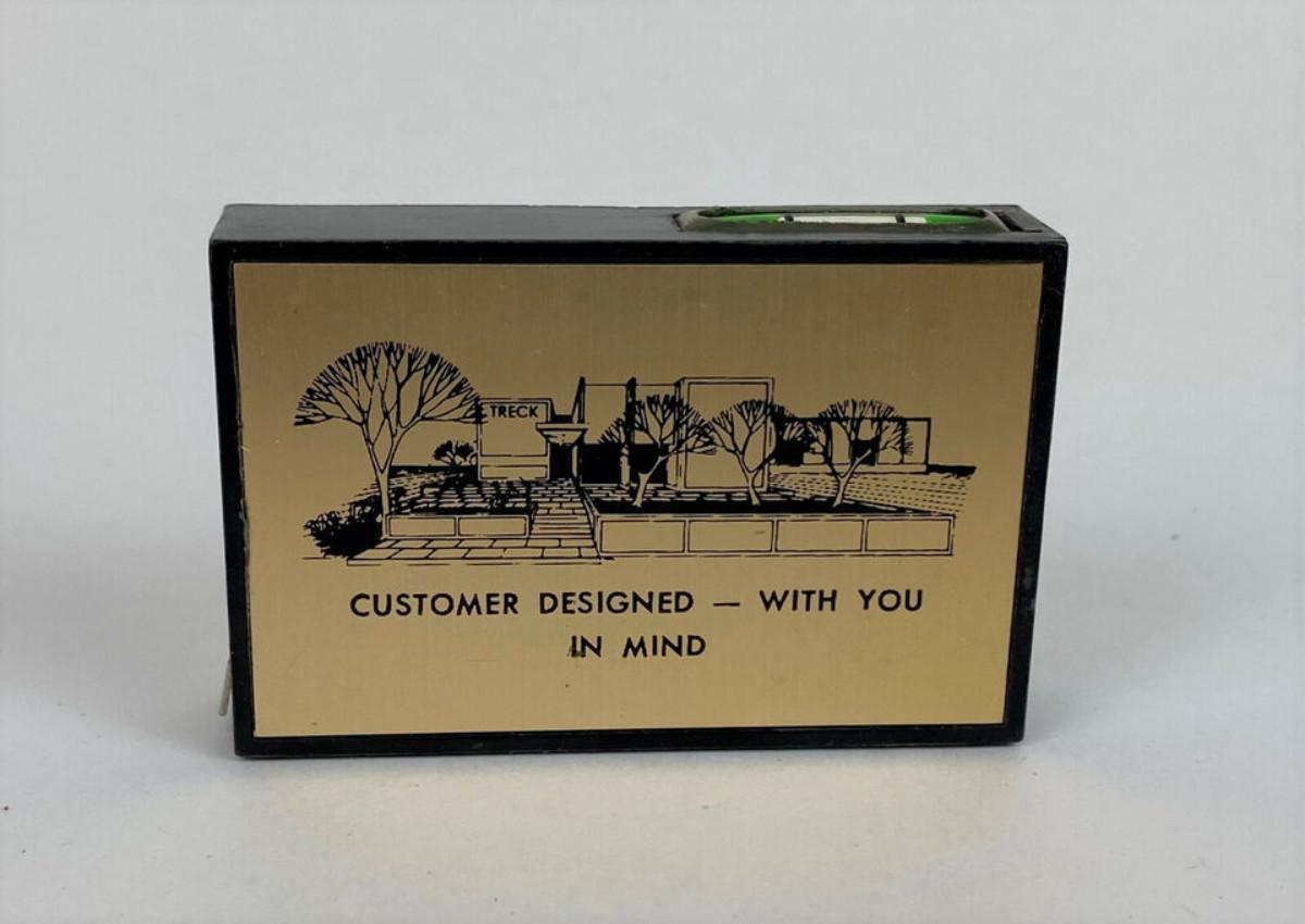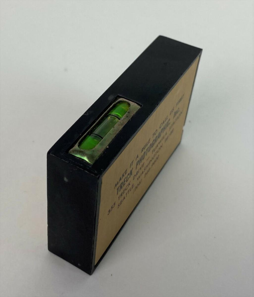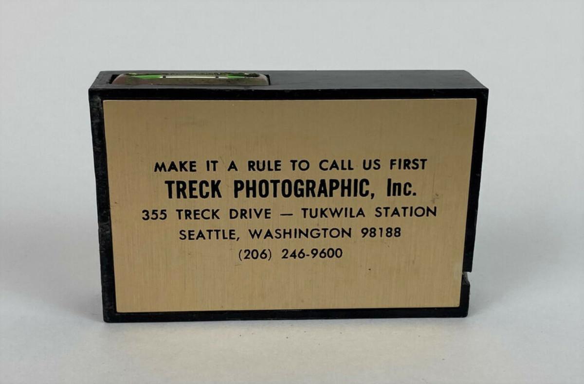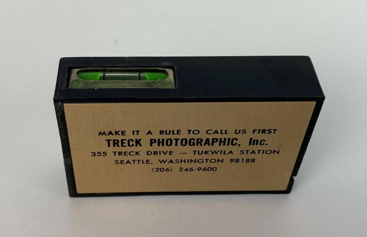 an advertising specialty gadget featuring a Level..Tape Measure..Fridge magnet...1960's graphics...for Treck Photographic Inc of Seattle, Washington...2 1/2" x 1 5/8"...Steel measure 5'6"...Good condition..as shown.