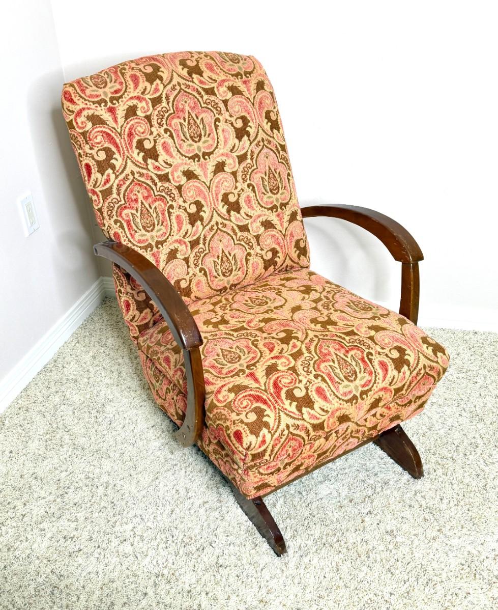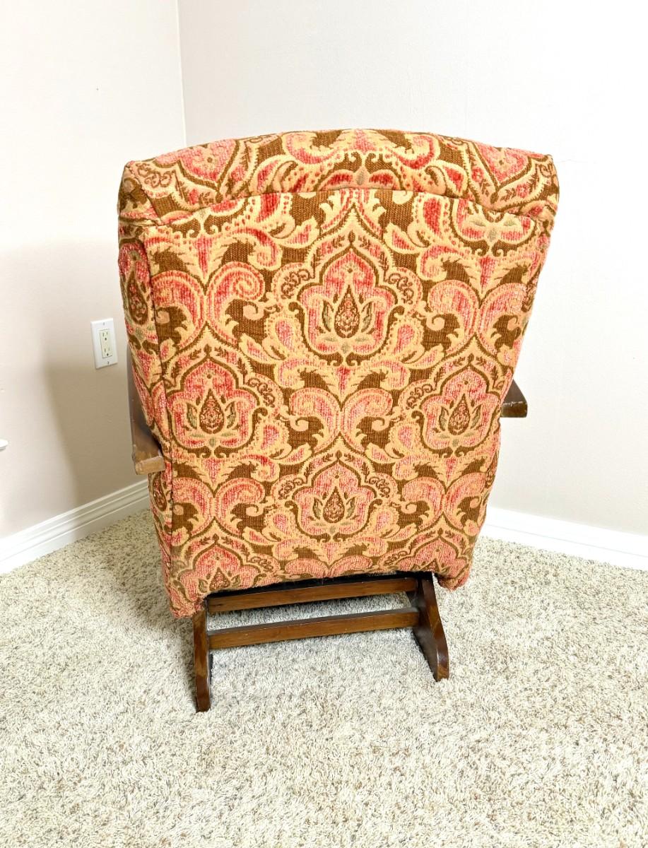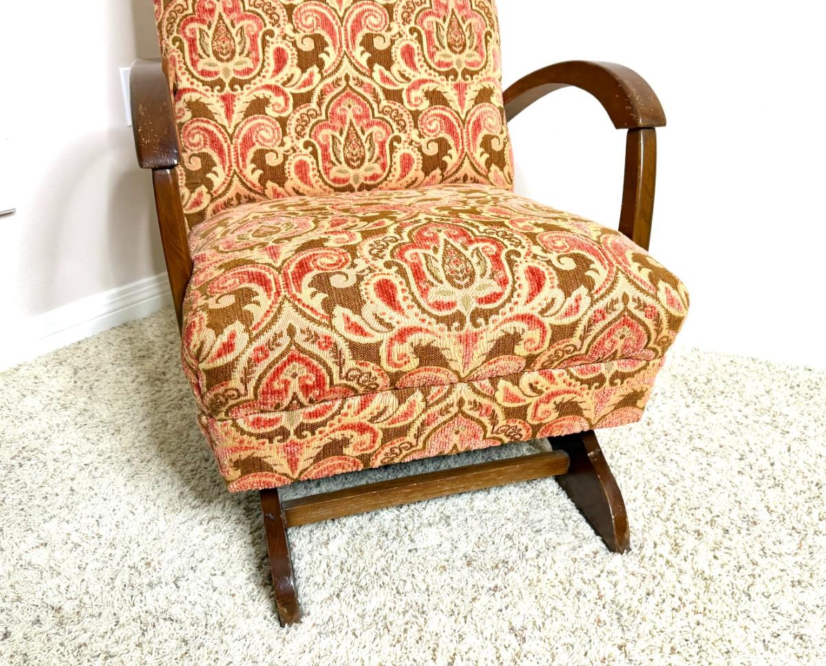 MCM Upholstered Glider with Wooden Arms and Chenille Flowers